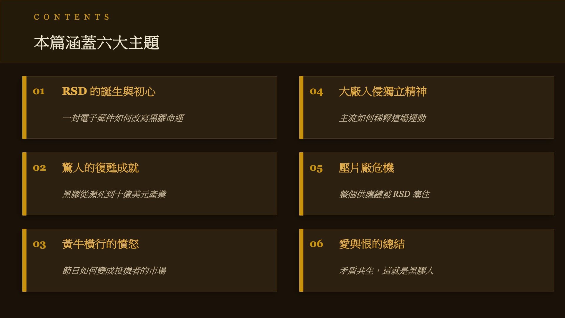 RSD 給予黑膠一件最珍貴的禮物:一個固定在日曆上的節點。一年之中有那麼一天,黑膠就是頭條,是話題,是新聞攝影機對準人龍的理由。音樂記者 Larry Jaffee 將 RSD 形容為「21 世紀最不可思議的復甦」——這並非誇張。