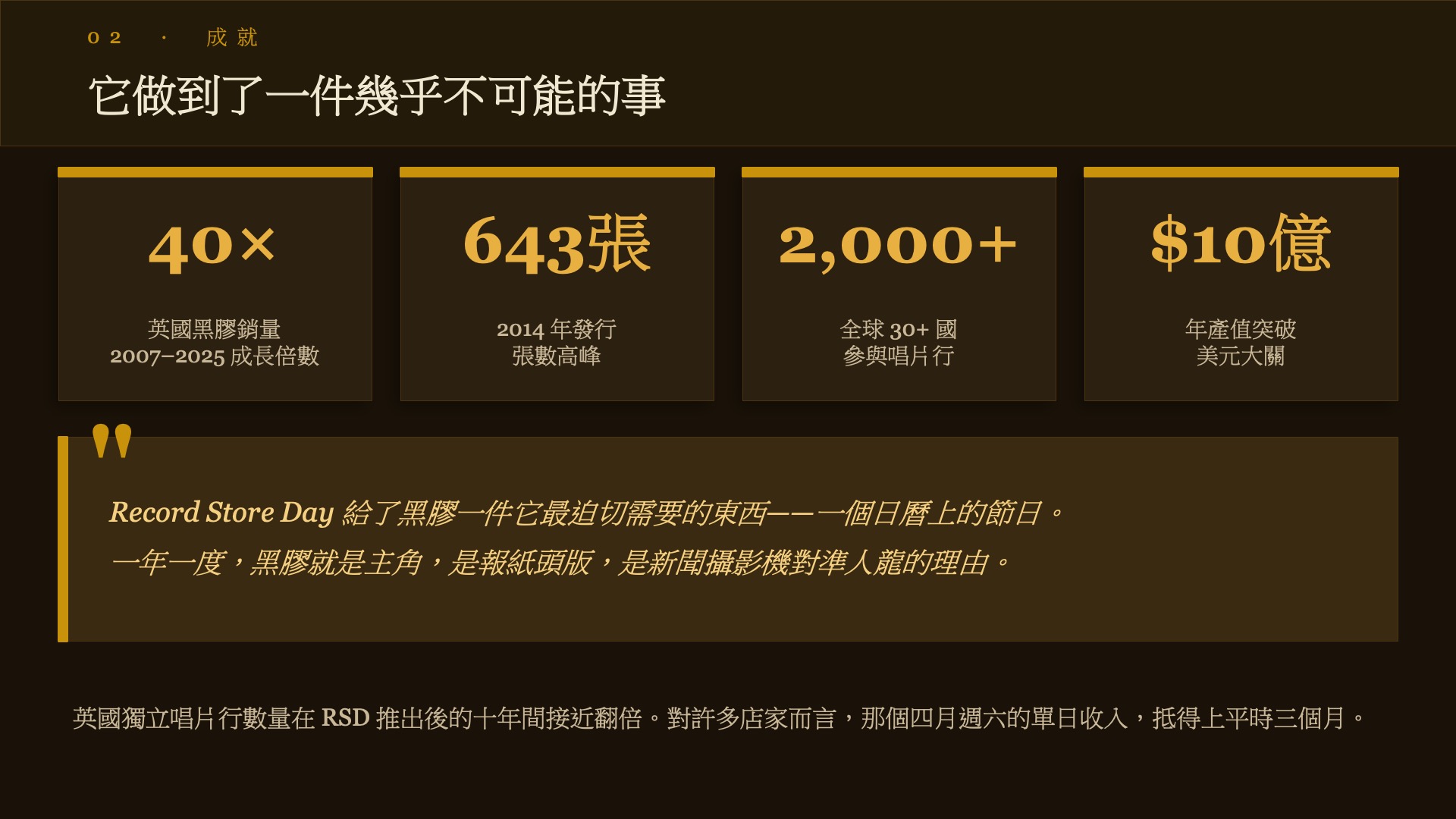 從 2008 到 2025 年,英國黑膠年銷量從不到二十萬張成長至七百六十萬張,近乎四十倍。英國獨立唱片行的數量在同期接近翻倍。對許多店家而言,RSD 那個四月的週六,是全年最重要的一個交易日——其重要性之高,常常抵得上平時三個月的收入。