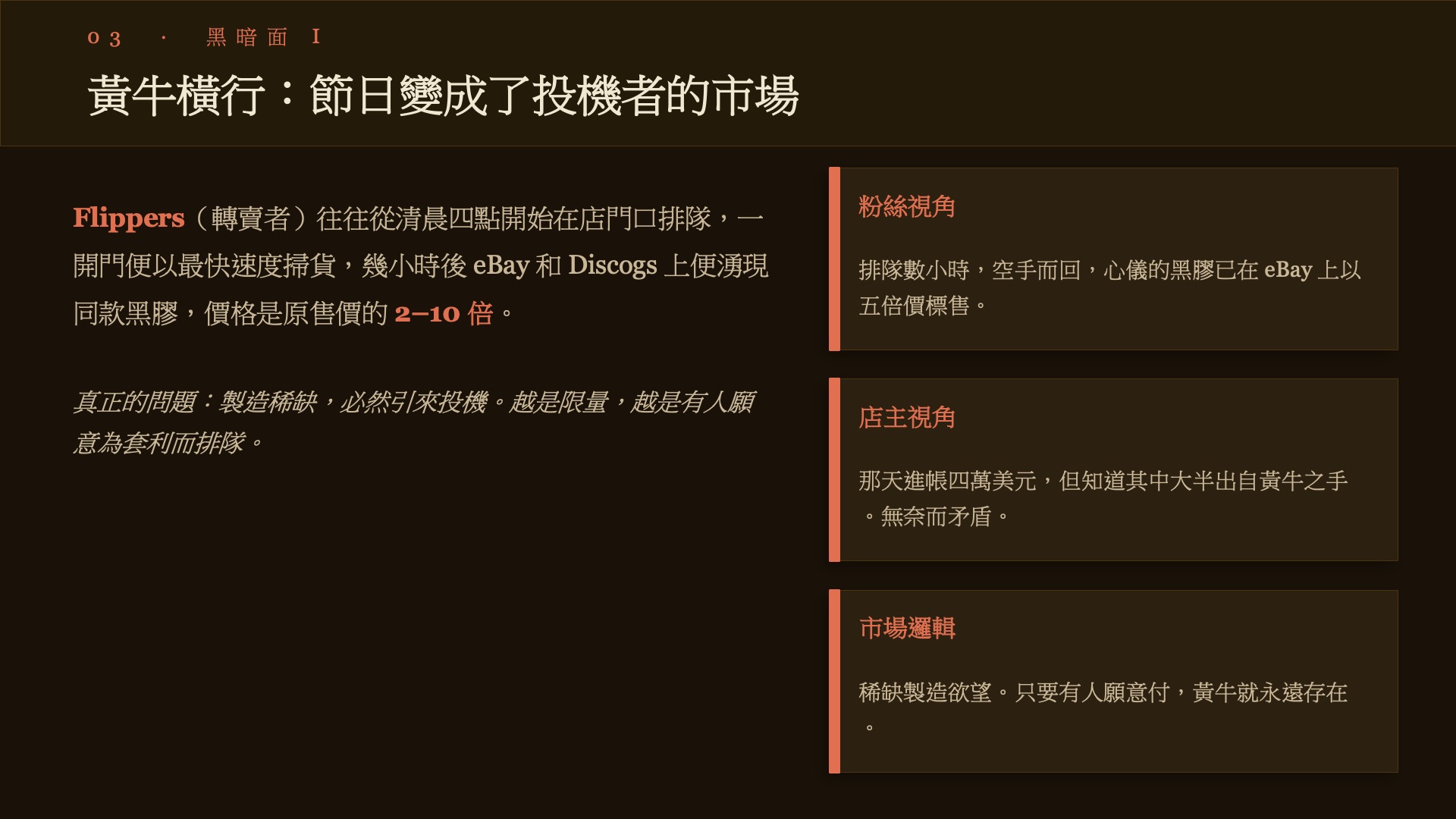 每年 RSD 開店後幾個小時內,eBay 和 Discogs 上就會湧現大量限量版黑膠,價格是原售價的兩倍、三倍,甚至十倍。這群被稱為「flippers」的二手轉賣者,往往從清晨四點就開始在店門口排隊,一開門便以最快速度掃貨,然後轉手套利。