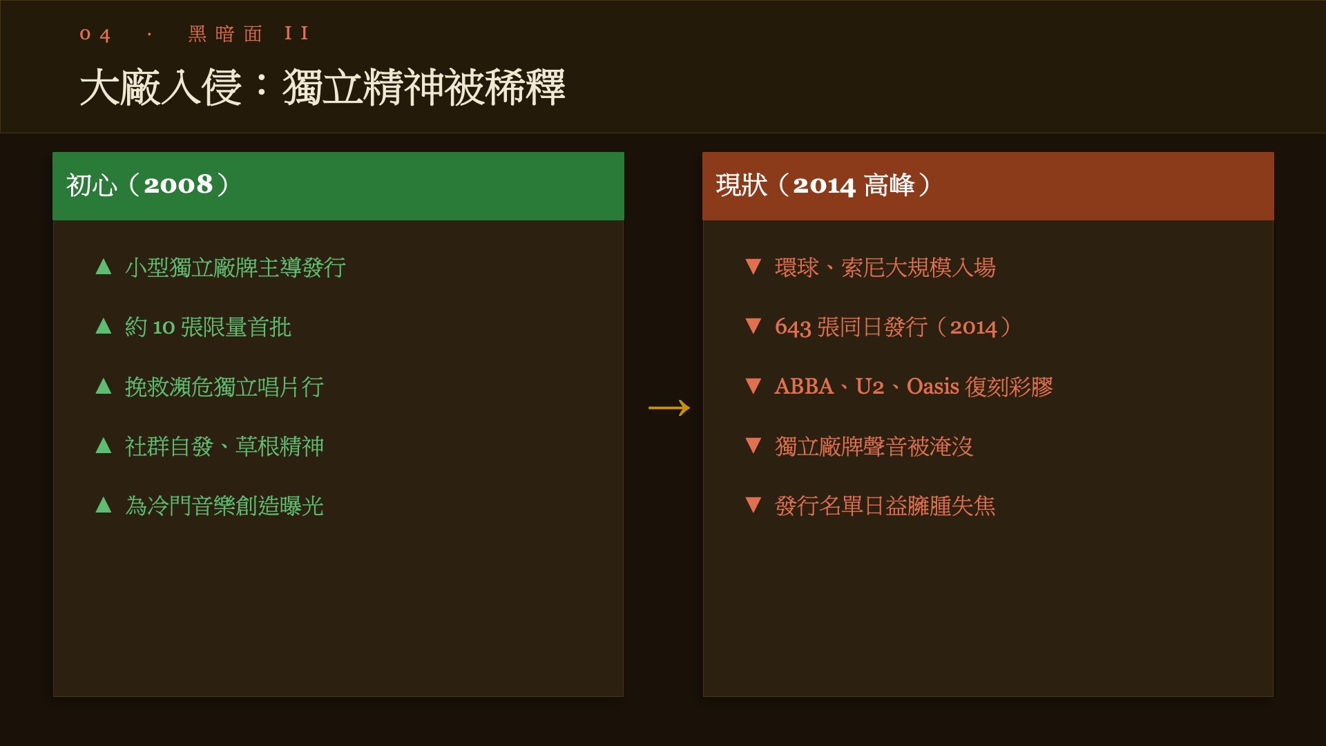RSD 誕生之初,是小型獨立廠牌對抗主流市場的武器。但隨著黑膠復甦帶來的商業利潤,環球、索尼等大型唱片公司嗅到了機會,開始大規模投入 RSD 發行——從 ABBA、U2、Oasis 的重製版彩膠,到各種早已爛熟的經典專輯復刻。