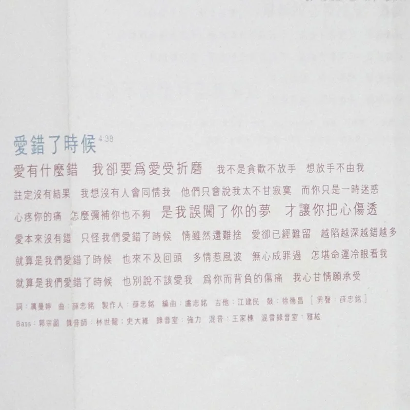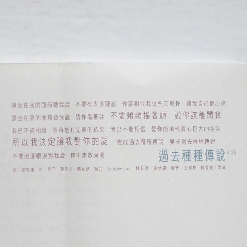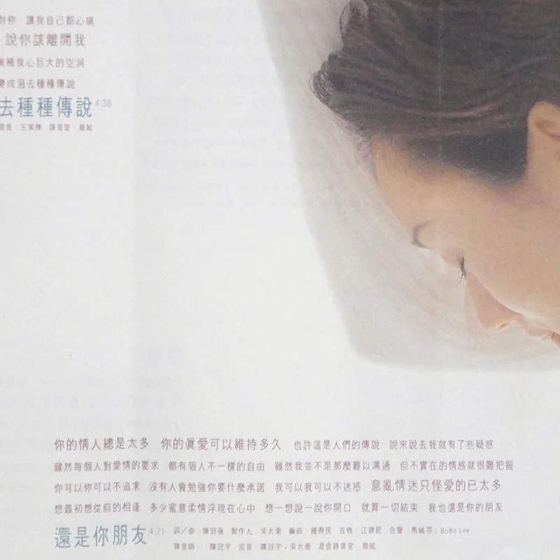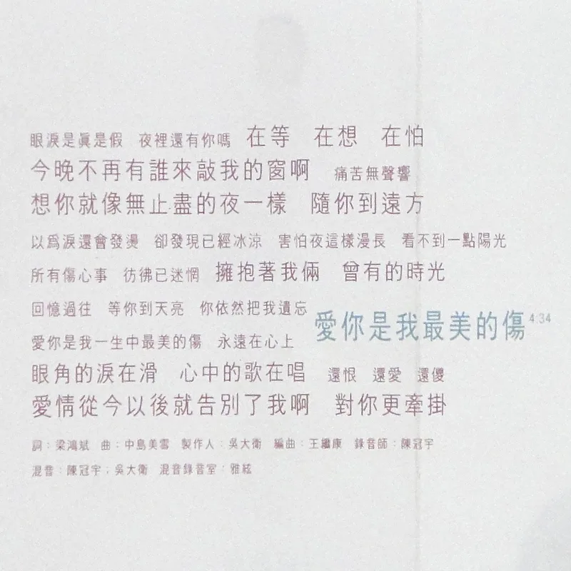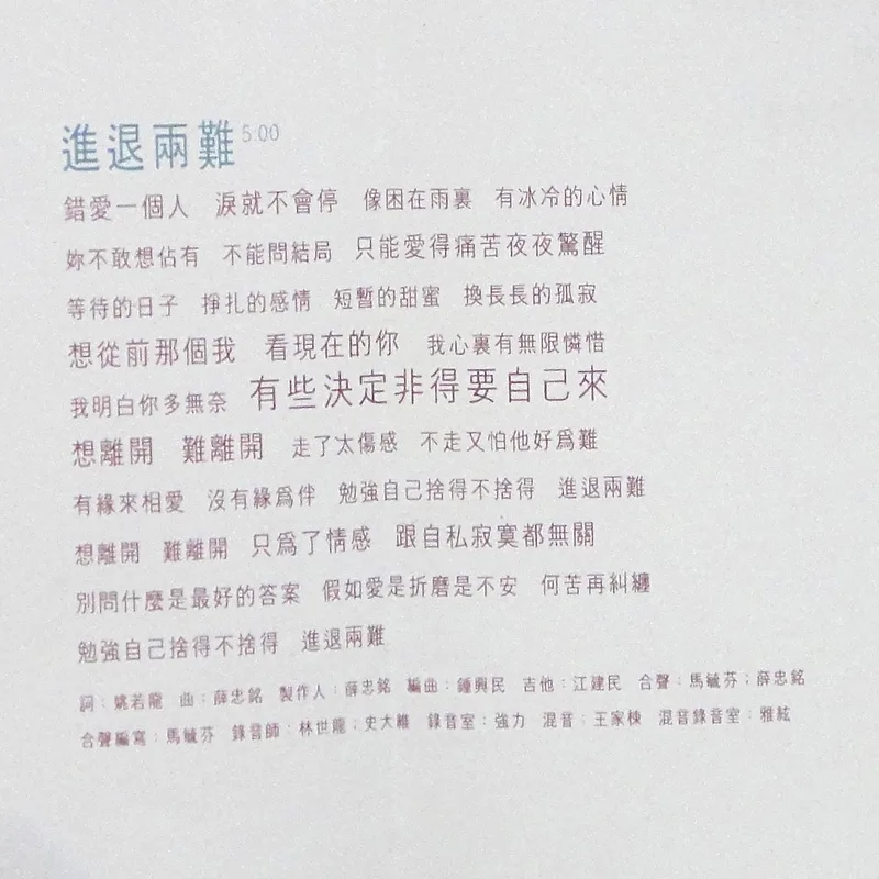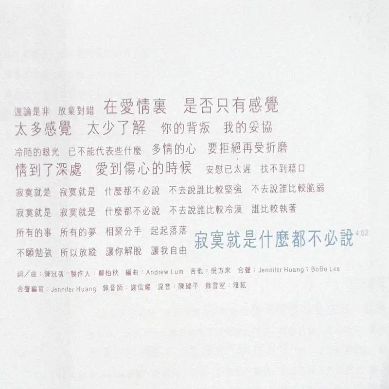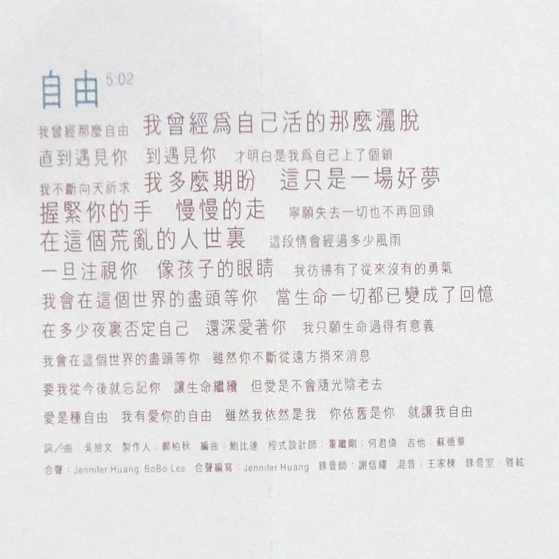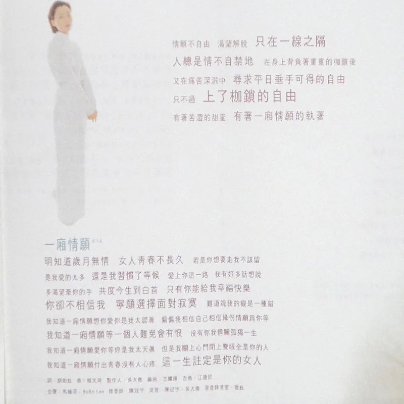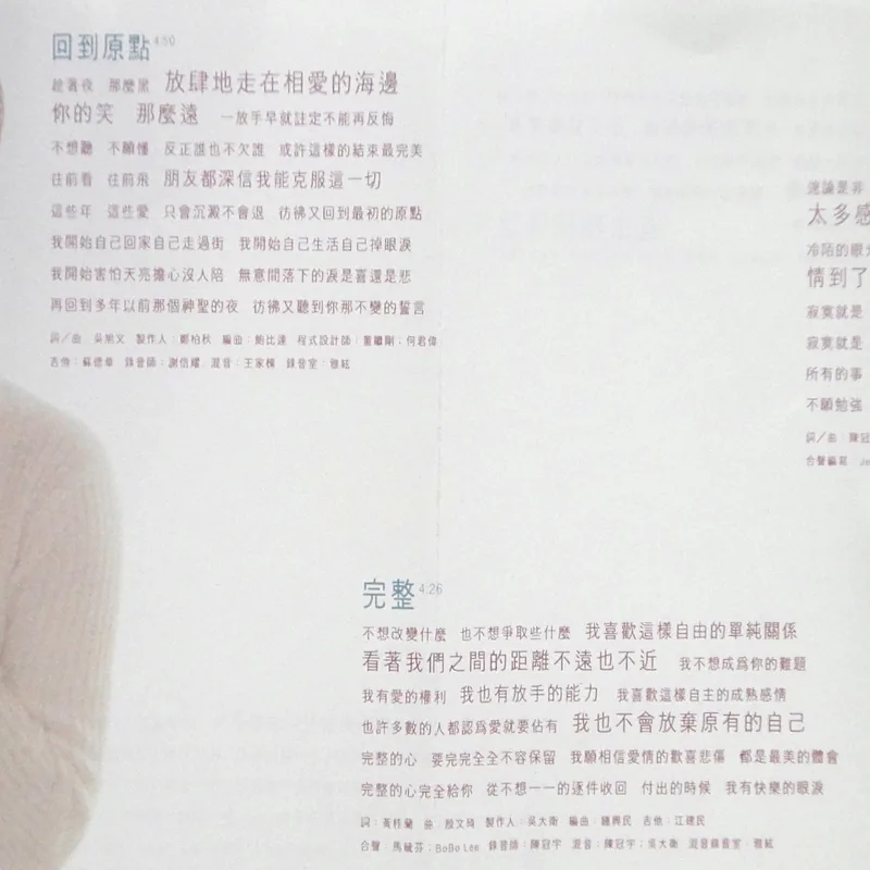 【完整曲目】 1. 〈自由〉 詞曲:吳旭文 編曲:鮑比達 製作人:鄭伯秋 2. 〈一廂情願〉 詞:胡如虹/曲:殷文琦 編曲:王繼康 製作人:吳大衛 備註:中視八點檔《情定少林寺》片尾曲 3. 〈愛錯了時候〉(對唱:坣娜/薛忠銘) 詞:厲曼婷/曲:薛忠銘 編曲:盧志銘 製作人:薛忠銘 4. 〈過去種種傳說〉 詞:鄔裕康/曲:郭蘅祈 編曲:Andrew Lum 製作人:鄭伯秋 5. 〈還是你朋友〉 詞曲:陳冠蒨 編曲:鍾興民 製作人:吳大衛 6. 〈回到原點〉 詞曲:吳旭文 編曲:鮑比達 製作人:鄭伯秋 7. 〈完整〉 詞:黃桂蘭/曲:殷文琦 編曲:鍾興民 製作人:吳大衛 8. 〈寂寞就是什麼都不必說〉 詞曲:陳冠蒨 編曲:Andrew Lum 製作人:鄭柏秋 9. 〈進退兩難〉 詞:姚若龍/曲:薛忠銘 編曲:鍾興民 製作人:薛忠銘 10. 〈愛你是我最美的傷〉 詞:梁鴻斌/曲:中島美雪 編曲:王繼康 製作人:吳大衛 備註:原曲=中島みゆき〈眠らないで〉/收錄專輯=《LOVE OR NOTHING》 【專輯團隊】 發行人:鄭柏秋 監製:鄭柏秋 統籌:陳智德 製作行政統籌:賈漢生 製作行政:陳淮煙 協力製作:KEN、張培聖 文案:梁鴻斌 攝影:林炳存 美術設計:陳鴻騰 無虫 化妝:連士良 髮型:KELVIN(溯) 企劃:呂理傑 企劃執行:國語事業二處 王瑞英 宣傳統籌:張峻瑋 宣傳執行:林宜慧、鄭麗甄、張素芳 專案活動:鄭健男 發行日期:1996年2月