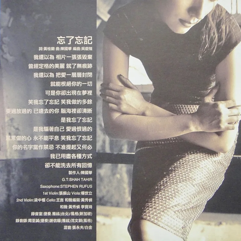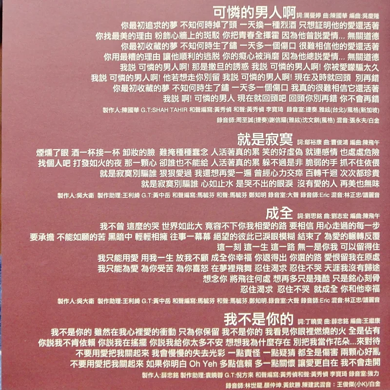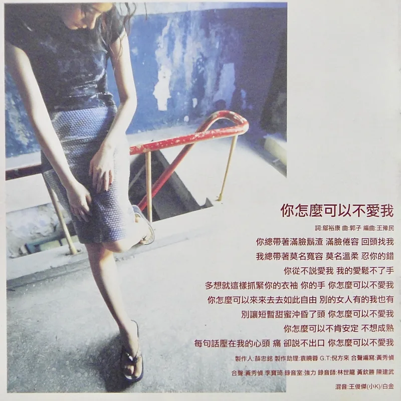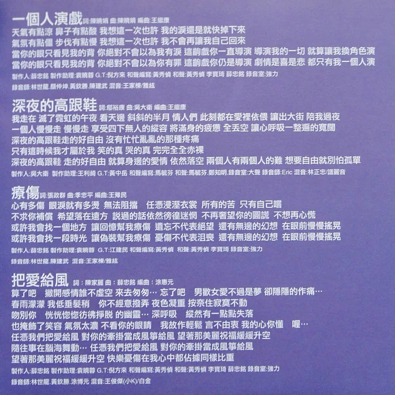 【專輯曲序】 1. 〈你怎麼可以不愛我〉 詞:鄔裕康/曲:郭子(郭蘅祈) 編曲:王豫民 2. 〈一個人演戲〉 詞曲:陳曉娟 編曲:王繼康 3. 〈深夜的高跟鞋〉 詞:鄔裕康/曲:吳大衛 編曲:王繼康 4. 〈療傷〉 詞:張政群/曲:季忠平 編曲:王豫民 5. 〈把愛給風〉 詞:陳家麗/曲:薛忠銘 編曲:凃惠元 6. 〈忘了忘記〉 詞:黃桂蘭/曲:陳國華 編曲:吳慶隆 7. 〈可憐的男人啊〉 詞:厲曼婷/曲:陳國華 編曲:吳慶隆 8. 〈就是寂寞〉 詞:鄔裕康/曲:曹俊鴻 編曲:陳飛午 9. 〈成全〉 詞:劉思銘/曲:劉志宏 編曲:陳飛午 10. 〈我不是你的〉 詞:丁曉雯/曲:薛忠銘 編曲:王繼康 【專輯團隊】 ⊕監製:陳聖柏 ⊕統籌:陳智德 ⊕製作統籌:賈漢生 ⊕協力製作:朱古力 ⊕企劃統籌:楊人一 ⊕企劃:徐玉婷 ⊕執行企劃:黃智麟 ⊕專案:鄭健男 ⊕專案:李雅玫 ⊕宣傳統籌:圓圓 ⊕媒體宣傳: 陳智峰、黃宛菁、沈曉媛、李雅玫 ⊕造型:徐玉婷 ⊕服裝設計:陳頌聲 ⊕化妝髮型:張嘉仁、小薇 ⊕髮型:KELVIN ⊕攝影:屠樹禮 ⊕平面設計:吳建羲 ⊕MTV導演:楊寶源 ⊕發行日期:1997年9月 ⊕特別感謝: 風間徹、高見伸一、鈴木健太郎、廖德發、郭文祥