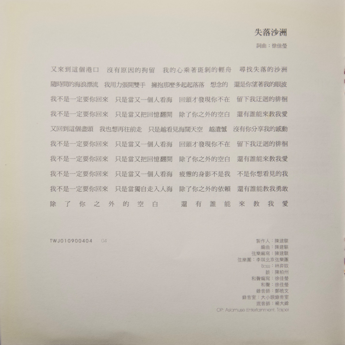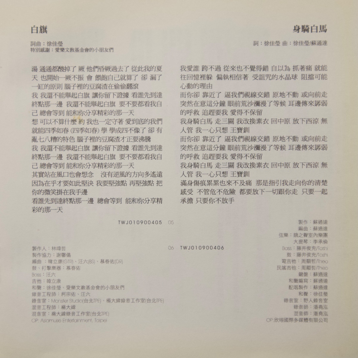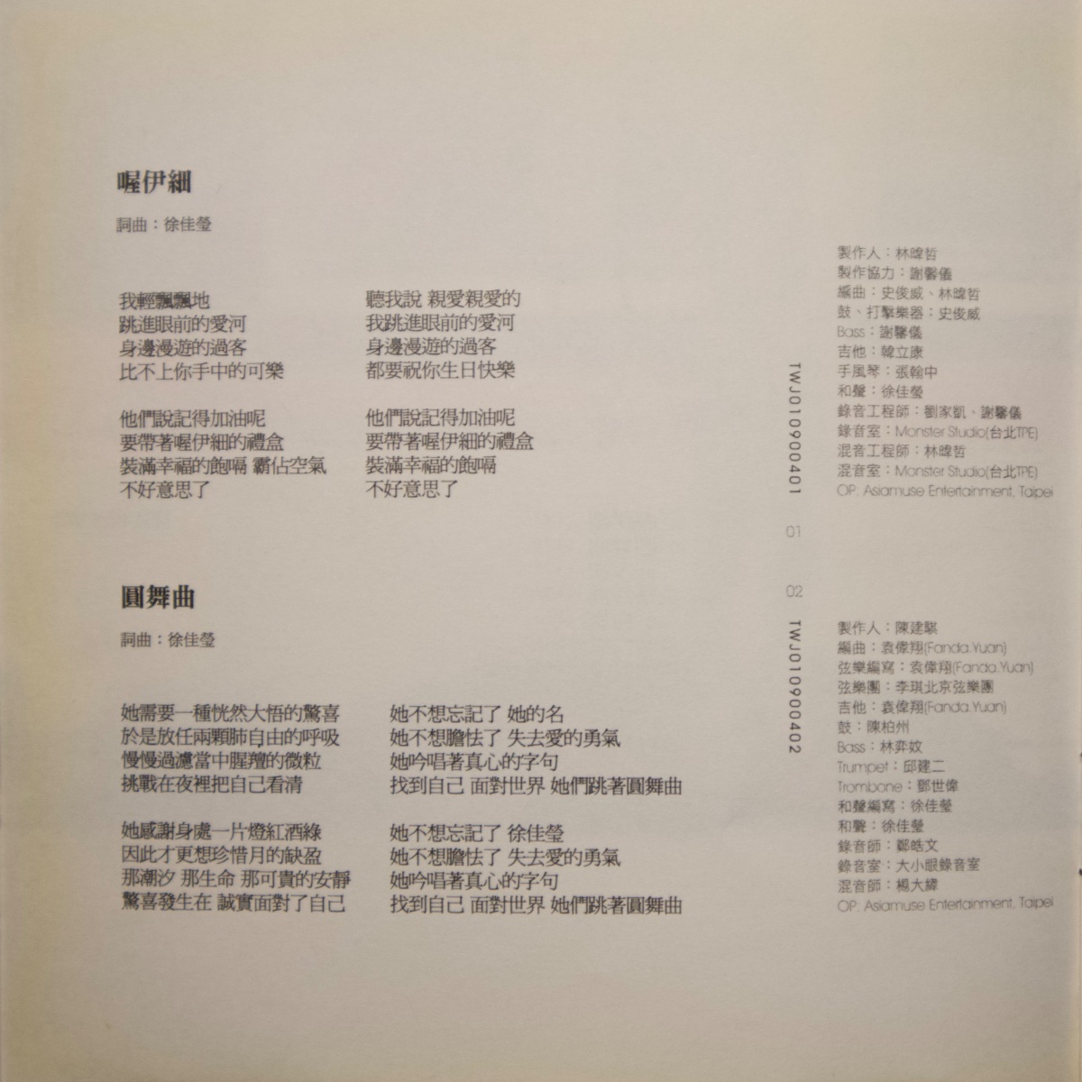 【完整曲目】 全專輯詞曲創作以徐佳瑩為主,以下僅標示有特別註記之曲目: 1. 〈喔伊細〉 — 3:42 2. 〈圓舞曲〉 — 4:21 3. 〈VIP〉 — 3:35 4. 〈失落沙洲〉 — 4:59 5. 〈白旗〉 — 3:29 特別感謝:愛樂文教基金會的小朋友們 6. 〈身騎白馬〉 — 5:13 曲:徐佳瑩、蘇通達 7. 〈一樣的月光〉 — 4:00 8. 〈明知故犯〉 — 4:58 9. 〈出口〉 — 3:06 10. 〈哼情歌〉 — 3:40 11. 〈沒鎖門〉(Bonus Track/MSN 10週年形象主題曲)— 3:07 · · · 【專輯團隊】 發行:亞神音樂娛樂股份有限公司 監製:徐舫、李文亭 經紀公司:金星娛樂事業有限公司 藝人經紀人:經紀部副總監 郭子綺/經紀 張亦定 母帶後期處理製作人:楊大緯錄音室 母帶後期處理工程師:楊大緯錄音室 母帶後期處理錄音室:楊大緯錄音室 A&R統籌:葛大為 藝人經紀:唐瑤玉 企劃:潘恩琪 文案:潘恩琪 媒體統籌:唐瑤玉 平面宣傳:莊東翰 電台宣傳:劉欣怡 新聞聯繫部:吳婉萍 業務發展部:董顯堯/李志元/賴婷怡/林婉玉 造型:方綺倫 化妝:姚純美(封面、MV/身騎白馬、失落沙洲、哼情歌) 髮型:ZOOM HAIR SPLENDY(封面、MV/身騎白馬、失落沙洲、哼情歌) 攝影:余靜萍 MV導演:黃中平(身騎白馬、喔伊細)、徐筠軒(失落沙洲)、林書宇(哼情歌) 發行日期:2009年5月