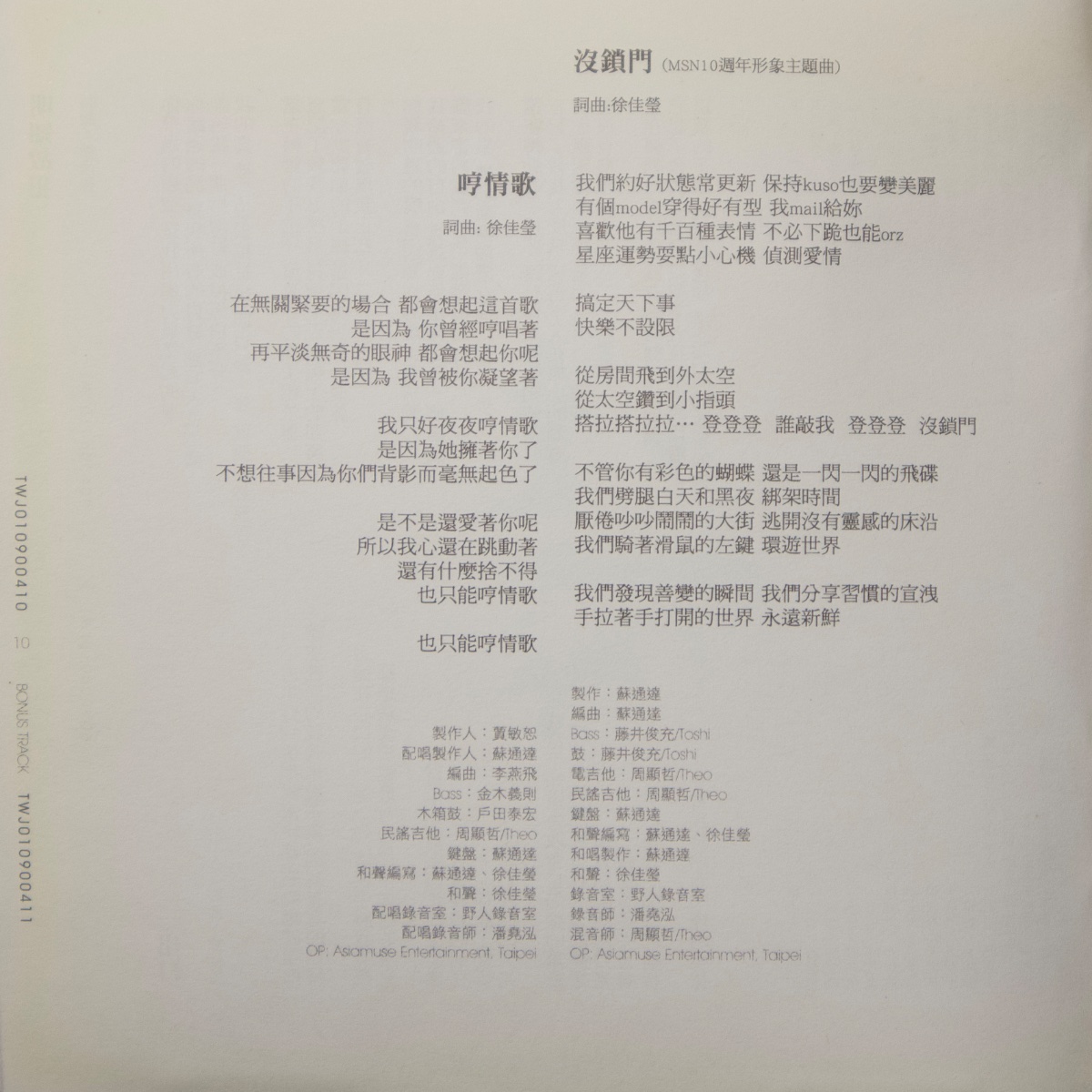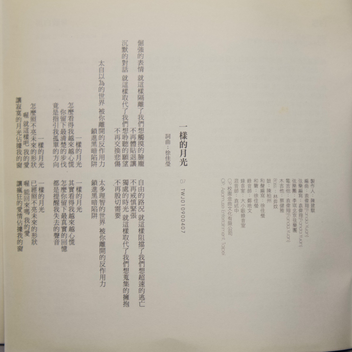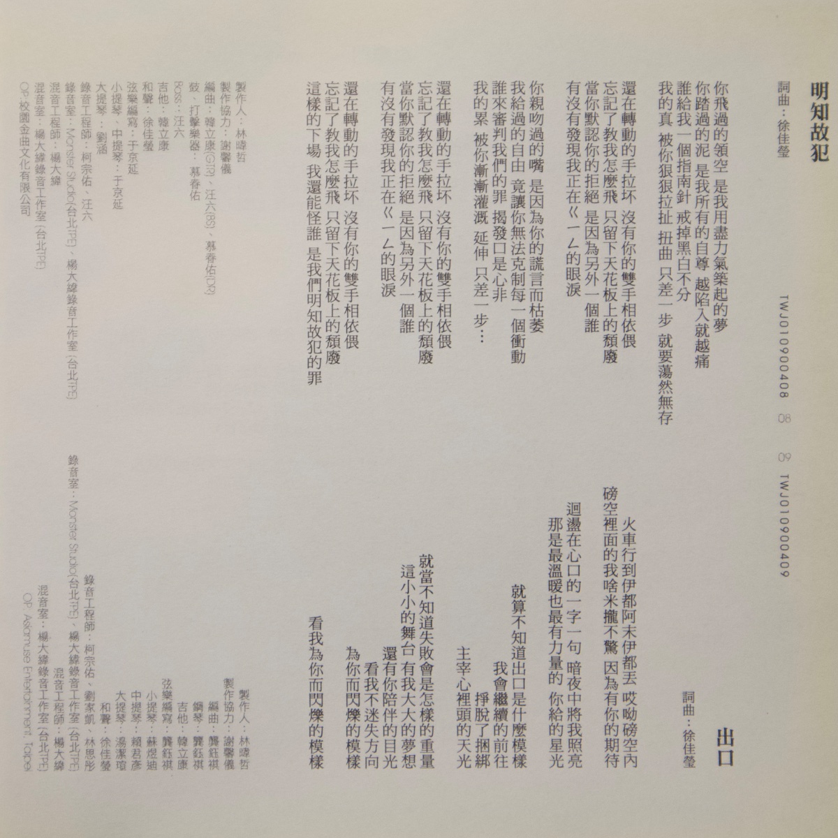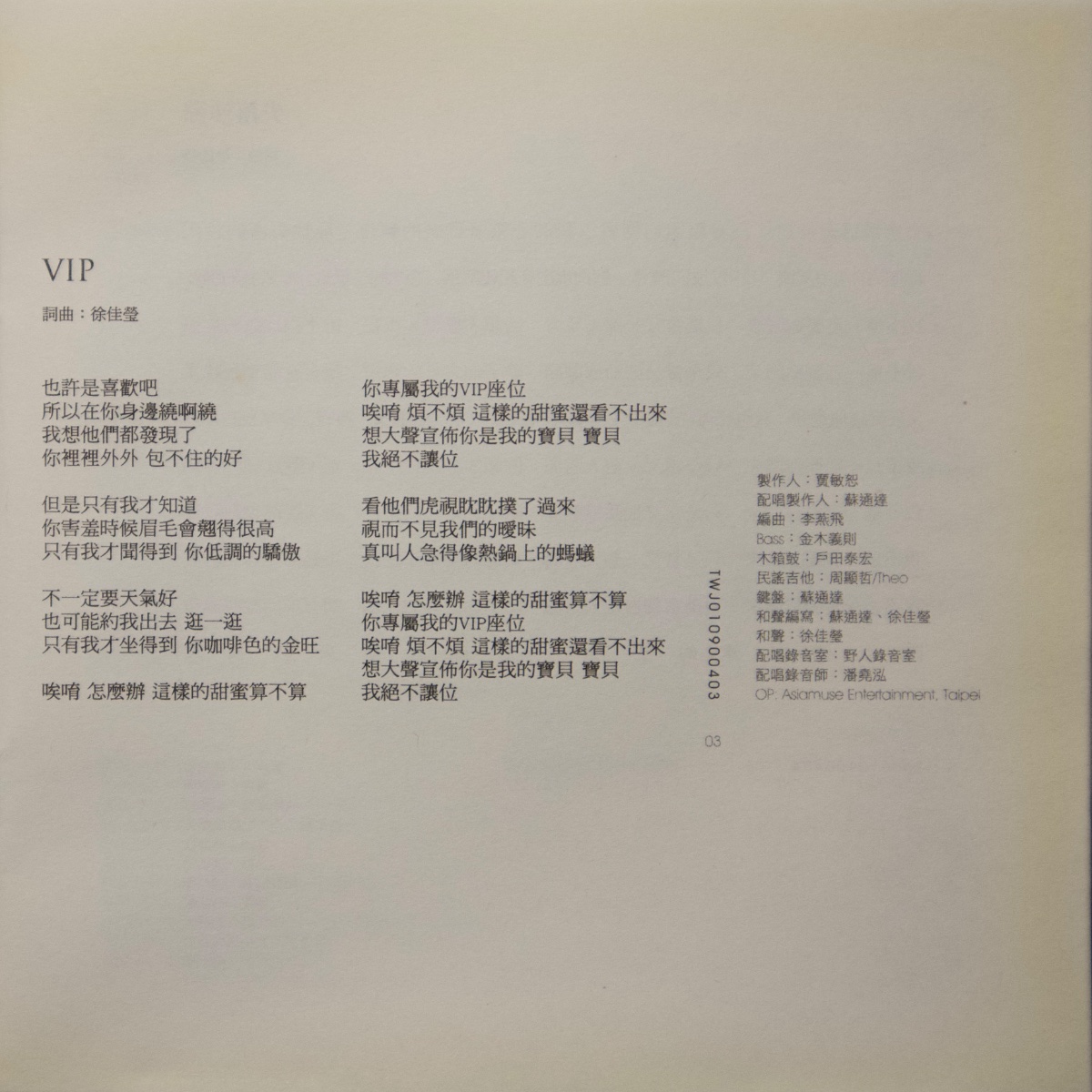 【完整曲目】 全專輯詞曲創作以徐佳瑩為主,以下僅標示有特別註記之曲目: 1. 〈喔伊細〉 — 3:42 2. 〈圓舞曲〉 — 4:21 3. 〈VIP〉 — 3:35 4. 〈失落沙洲〉 — 4:59 5. 〈白旗〉 — 3:29 特別感謝:愛樂文教基金會的小朋友們 6. 〈身騎白馬〉 — 5:13 曲:徐佳瑩、蘇通達 7. 〈一樣的月光〉 — 4:00 8. 〈明知故犯〉 — 4:58 9. 〈出口〉 — 3:06 10. 〈哼情歌〉 — 3:40 11. 〈沒鎖門〉(Bonus Track/MSN 10週年形象主題曲)— 3:07 · · · 【專輯團隊】 發行:亞神音樂娛樂股份有限公司 監製:徐舫、李文亭 經紀公司:金星娛樂事業有限公司 藝人經紀人:經紀部副總監 郭子綺/經紀 張亦定 母帶後期處理製作人:楊大緯錄音室 母帶後期處理工程師:楊大緯錄音室 母帶後期處理錄音室:楊大緯錄音室 A&R統籌:葛大為 藝人經紀:唐瑤玉 企劃:潘恩琪 文案:潘恩琪 媒體統籌:唐瑤玉 平面宣傳:莊東翰 電台宣傳:劉欣怡 新聞聯繫部:吳婉萍 業務發展部:董顯堯/李志元/賴婷怡/林婉玉 造型:方綺倫 化妝:姚純美(封面、MV/身騎白馬、失落沙洲、哼情歌) 髮型:ZOOM HAIR SPLENDY(封面、MV/身騎白馬、失落沙洲、哼情歌) 攝影:余靜萍 MV導演:黃中平(身騎白馬、喔伊細)、徐筠軒(失落沙洲)、林書宇(哼情歌) 發行日期:2009年5月