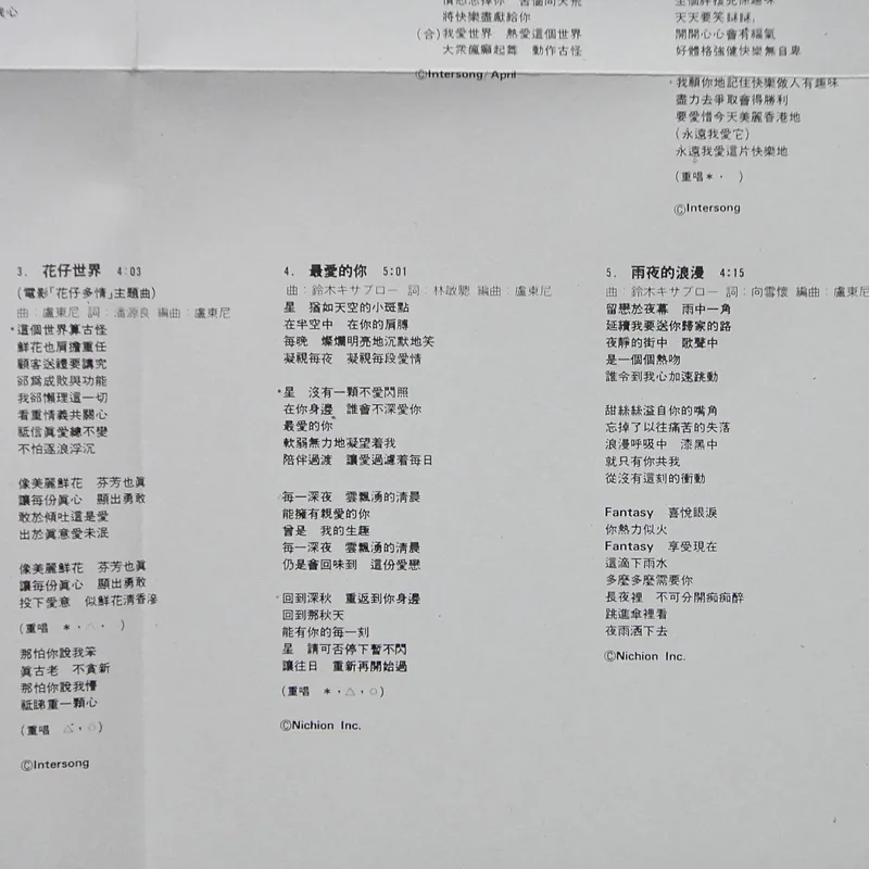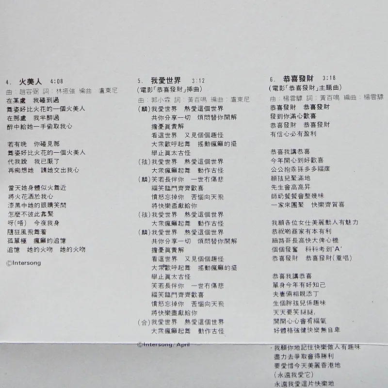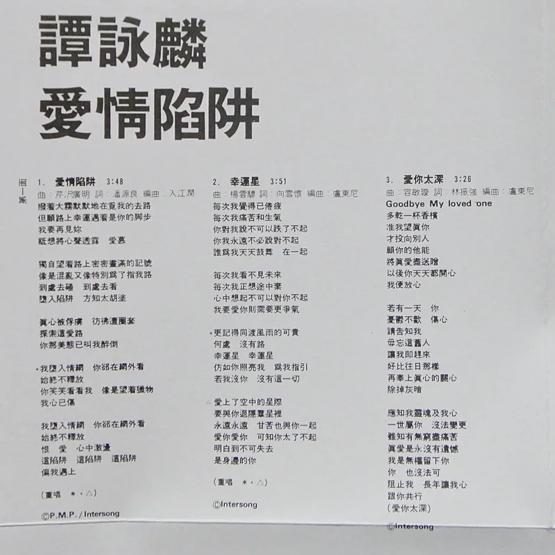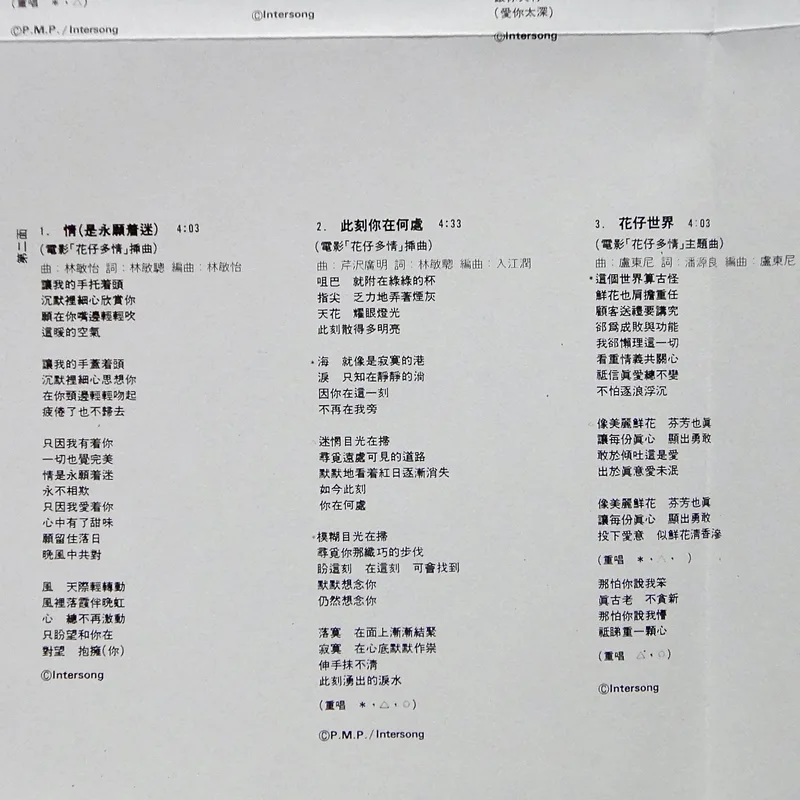 【專輯曲序】 1. 〈愛情陷阱〉 詞:潘源良/曲:芹澤廣明 編曲:入江潤 2. 〈幸運星〉 詞:向雪懷/曲:楊雲驃 編曲:盧東尼 3. 〈愛你太深〉 詞:林振強/曲:容敏璇 編曲:盧東尼 4. 〈火美人〉 詞:林振強/曲:趙容弼 編曲:盧東尼 備註:OT:趙容弼〈단발머리(短髪)〉 5. 〈我愛世界〉 詞:黃百鳴/曲:郭小霖 編曲:盧東尼 備註:電影《恭喜發財》插曲 6. 〈恭喜發財〉 詞:黃百鳴/曲:楊雲驃 編曲:楊雲驃 備註:電影《恭喜發財》主題曲 7. 〈情(是永遠著迷)〉 詞:林敏驄/曲:林敏怡 編曲:林敏怡 備註:電影《花仔多情》插曲 8. 〈此刻你在何處〉 詞:林敏驄/曲:芹澤廣明 編曲:入江潤 備註:電影《花仔多情》插曲 9. 〈花仔世界〉 詞:潘源良/曲:盧東尼 編曲:盧東尼 備註:電影《花仔多情》主題曲 10. 〈最愛的你〉 詞:林敏驄/曲:鈴木キサブロー 編曲:盧東尼 備註:OT:倉橋ルイ子〈ラストシーンに愛をこめて〉 11. 〈雨夜的浪漫〉 詞:向雪懷/曲:鈴木キサブロー 編曲:盧東尼 備註:OT:布施明〈ファンタジー Fantasy〉(季選) 【專輯團隊】 鍵琴:林敏怡、盧東尼、永田一郎 中西康晴 低音結他:單立文、富倉安生、渡邊直樹 結他:楊雲驃、周華年、松原正樹 土方隆行 電結他:北島健二 鼓:Donald Ashley、貝砂和照 敲擊:鳴島英治、管原裕紀、黃祖輝 色士風:Ding Bas、沢井原兒 電子合成器:迫田到 和音:畫子、細L、B.G.文、冰心、米高、阿倫 錄音:關維麟、葉廣權、中崎功、家守久雄 監製:關維麟 攝影:盧景華 化妝:Judy Leung 鳴謝:SPARKLE 「香港作曲家及作詞家協會」會員: 向雪懷、林敏怡、林敏聰、林振強、楊雲驃、潘源良、黃百鳴 All recordings, vocal dibbing and mixing at Dragon Studio, PolyGram Hong Kong, except A-1, A-3, B-3, B-4 music recorded at Hito Kuchizaka Studio, Canyon Records Inc. Japan. ℗1985 PolyGram Records Ltd Hong Kong ©2004 Universal Music Ltd. Marketed by Universal Music Ltd. Hong Kong/Singapore/Malaysia.