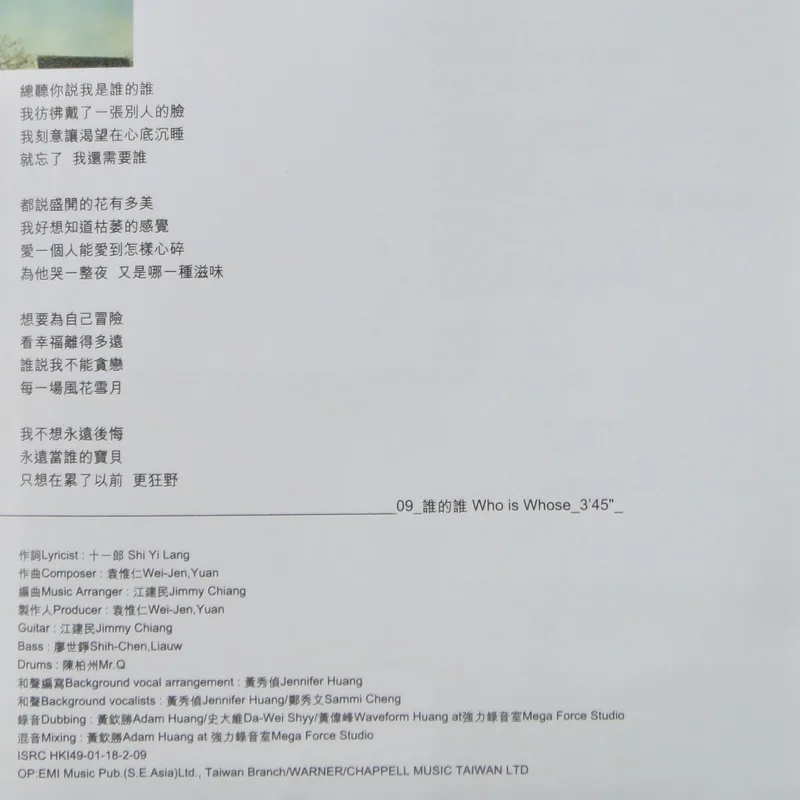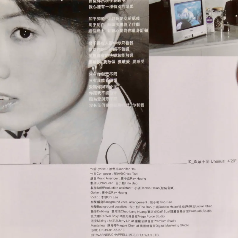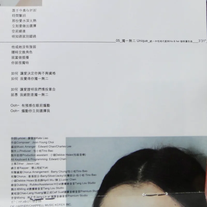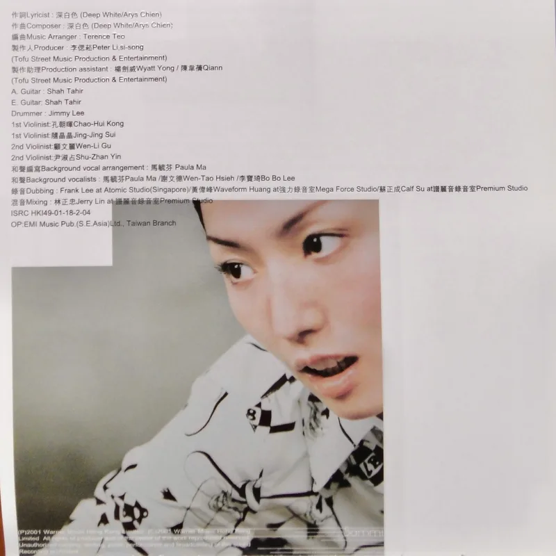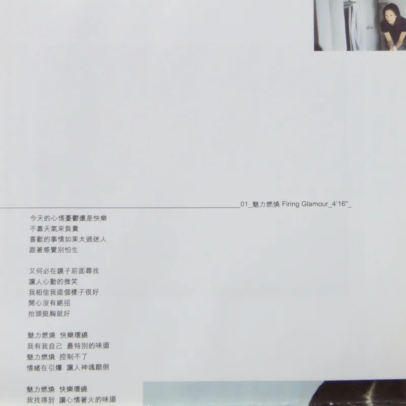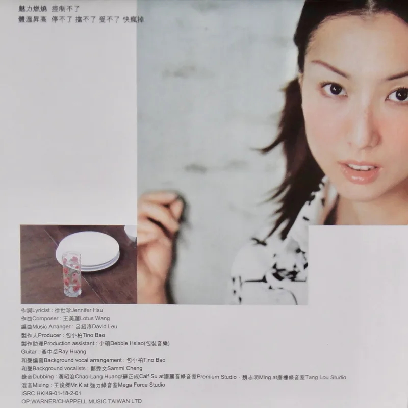 【專輯曲序】 1. 〈魅力燃燒〉 詞:徐世珍/曲:王美蓮 編曲:呂紹淳 2. 〈何必〉 詞曲:袁惟仁 編曲:屠穎 3. 〈When The Morning Comes〉 詞曲:深白色 編曲:呂紹淳 4. 〈完整〉 詞曲:深白色 編曲:Terence Teo 5. 〈獨一無二〉(增山裕紀合唱) 詞:廖瑩如/曲:崔俊英 編曲:Edward Chan 備註:改編自李貞賢〈哇〉;粵語版本為〈獨家試唱〉;統一中性時代飲料 His& 咖啡廣告曲 6. 〈沒感覺〉 詞曲:潘協慶 編曲:黃中岳 7. 〈未來〉 詞:吳依錚/曲:蕭賀碩 編曲:黃韻玲 8. 〈我只要現在〉 詞:廖瑩如/曲:羅方佑 編曲:張翰群 9. 〈誰的誰〉 詞:十一郎/曲:袁惟仁 編曲:江建民 10. 〈與眾不同〉 詞:徐世珍/曲:蔡坤奇 編曲:黃中岳 (限量特別版 Bonus CD) 1. 〈不能承受的感動〉 詞:林夕/曲:陳輝陽 編曲:陳輝陽 備註:電影《瘦身男女》中文主題曲;粵語版本為〈終身美麗〉 2. 〈眉飛色舞(Club Remix版)〉 詞:廖瑩如/曲:崔俊英 3. 〈獨一無二(Remix版)〉 詞:廖瑩如/曲:崔俊英 【專輯團隊】 發行/華納音樂國際股份有限公司 發行人/周建輝 監製/陳澤杉 音樂總監/包小柏 製作統籌/吳依錚 製作企劃/徐光義 企宣統籌/李文亭 企劃/吳怡哲 企劃協力/陳昭惠 文案/吳怡哲 媒體採購及海外統籌/安國榮 媒體統籌/陳正剛 平面媒體/查立飛 電台媒體/鄭麗甄 專案經紀統籌/季聲珊 專案經紀/林明蓉、馮淑惠 活動專案統籌/周逸敏 行銷專案副理/林信佑 行政/黃緯緹 網路專員/小蠻 造型/Ti Ti Kwan(HK) 化妝/Zing(HK) 髮型/Billy Choi Of In Hair Culture(HK) 美術設計/周正道、陳嵩嵐(9d Visual Creation) 攝影/黃中平 導演/賴偉康[獨一無二] 黃中平[完整+未來] 林錦和[魅力燃燒+何必] 母帶後期處理錄音師/陳梅苓 母帶後期處理錄音室/異術錄音室 發行日期/2001年5月 特別感謝/統一-his & her咖啡座・SK-II潔面布・錢櫃KTV・V-MIX KTV