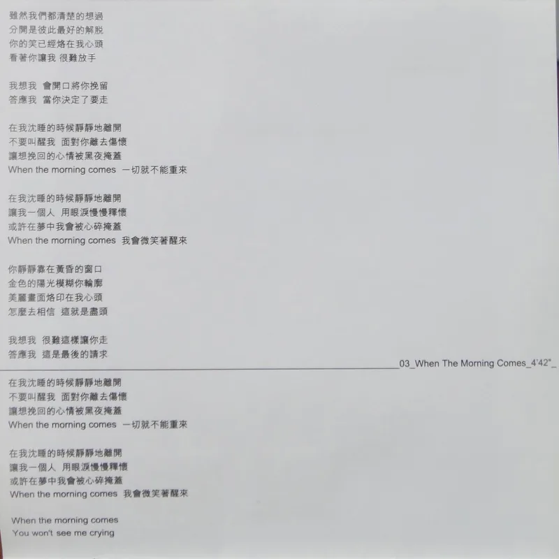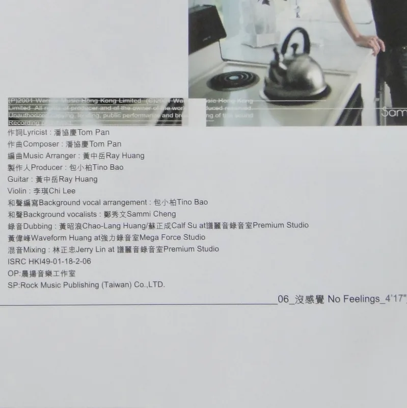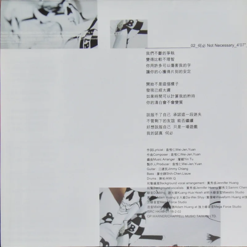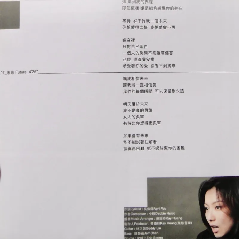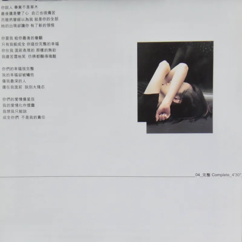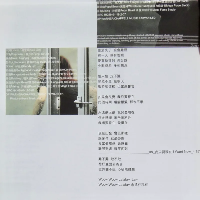 【專輯曲序】 1. 〈魅力燃燒〉 詞:徐世珍/曲:王美蓮 編曲:呂紹淳 2. 〈何必〉 詞曲:袁惟仁 編曲:屠穎 3. 〈When The Morning Comes〉 詞曲:深白色 編曲:呂紹淳 4. 〈完整〉 詞曲:深白色 編曲:Terence Teo 5. 〈獨一無二〉(增山裕紀合唱) 詞:廖瑩如/曲:崔俊英 編曲:Edward Chan 備註:改編自李貞賢〈哇〉;粵語版本為〈獨家試唱〉;統一中性時代飲料 His& 咖啡廣告曲 6. 〈沒感覺〉 詞曲:潘協慶 編曲:黃中岳 7. 〈未來〉 詞:吳依錚/曲:蕭賀碩 編曲:黃韻玲 8. 〈我只要現在〉 詞:廖瑩如/曲:羅方佑 編曲:張翰群 9. 〈誰的誰〉 詞:十一郎/曲:袁惟仁 編曲:江建民 10. 〈與眾不同〉 詞:徐世珍/曲:蔡坤奇 編曲:黃中岳 (限量特別版 Bonus CD) 1. 〈不能承受的感動〉 詞:林夕/曲:陳輝陽 編曲:陳輝陽 備註:電影《瘦身男女》中文主題曲;粵語版本為〈終身美麗〉 2. 〈眉飛色舞(Club Remix版)〉 詞:廖瑩如/曲:崔俊英 3. 〈獨一無二(Remix版)〉 詞:廖瑩如/曲:崔俊英 【專輯團隊】 發行/華納音樂國際股份有限公司 發行人/周建輝 監製/陳澤杉 音樂總監/包小柏 製作統籌/吳依錚 製作企劃/徐光義 企宣統籌/李文亭 企劃/吳怡哲 企劃協力/陳昭惠 文案/吳怡哲 媒體採購及海外統籌/安國榮 媒體統籌/陳正剛 平面媒體/查立飛 電台媒體/鄭麗甄 專案經紀統籌/季聲珊 專案經紀/林明蓉、馮淑惠 活動專案統籌/周逸敏 行銷專案副理/林信佑 行政/黃緯緹 網路專員/小蠻 造型/Ti Ti Kwan(HK) 化妝/Zing(HK) 髮型/Billy Choi Of In Hair Culture(HK) 美術設計/周正道、陳嵩嵐(9d Visual Creation) 攝影/黃中平 導演/賴偉康[獨一無二] 黃中平[完整+未來] 林錦和[魅力燃燒+何必] 母帶後期處理錄音師/陳梅苓 母帶後期處理錄音室/異術錄音室 發行日期/2001年5月 特別感謝/統一-his & her咖啡座・SK-II潔面布・錢櫃KTV・V-MIX KTV