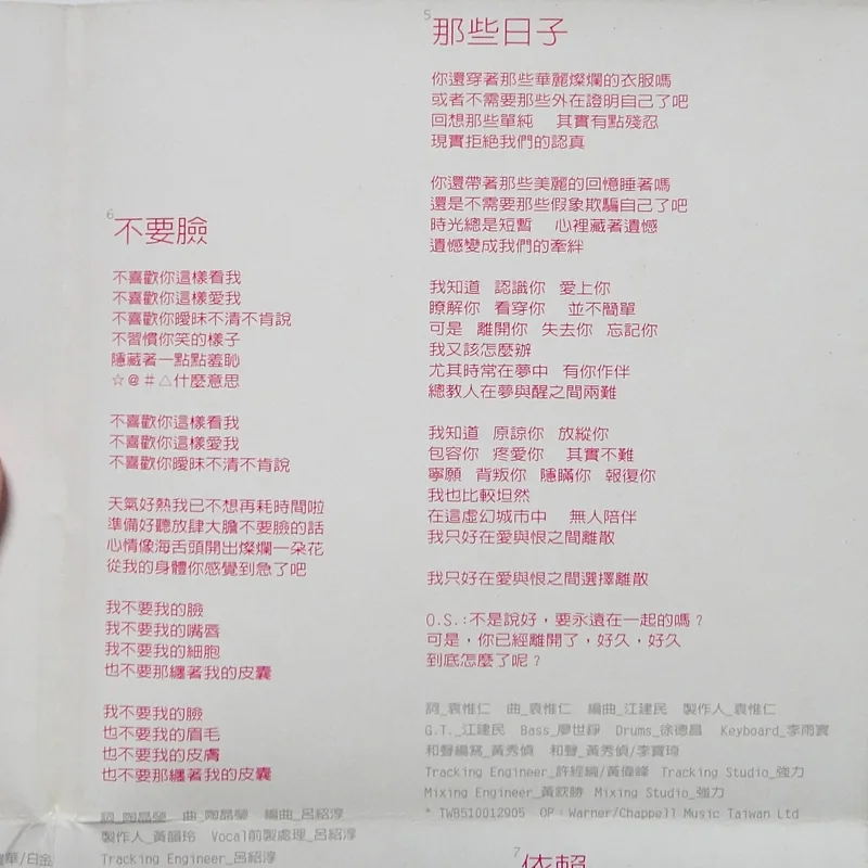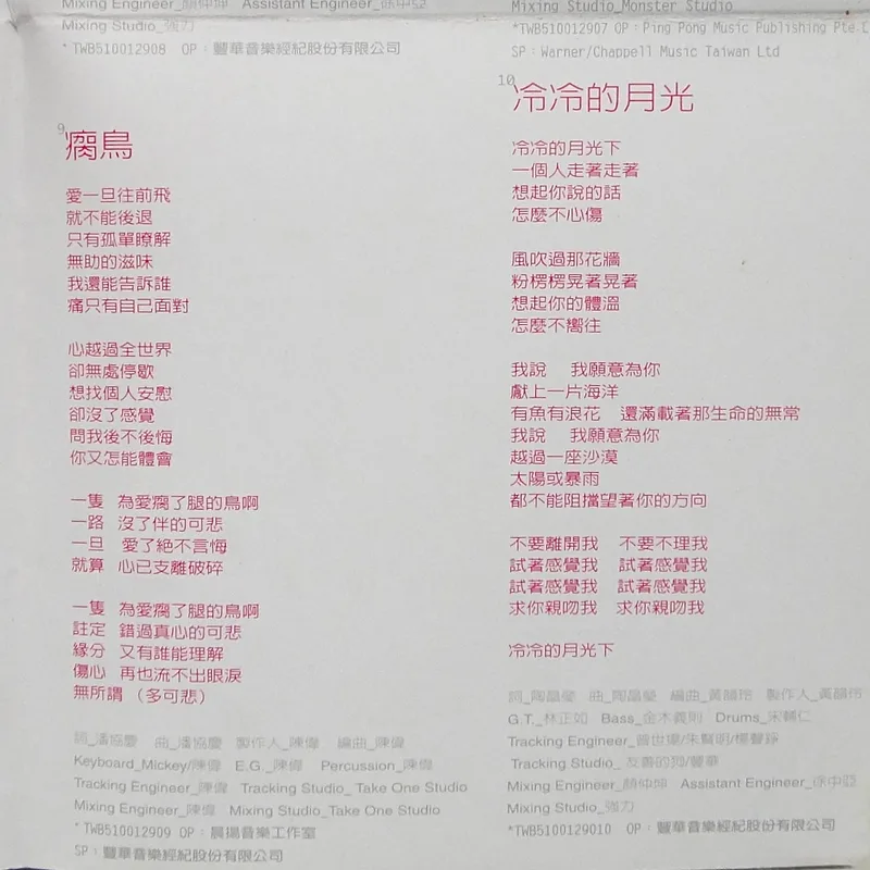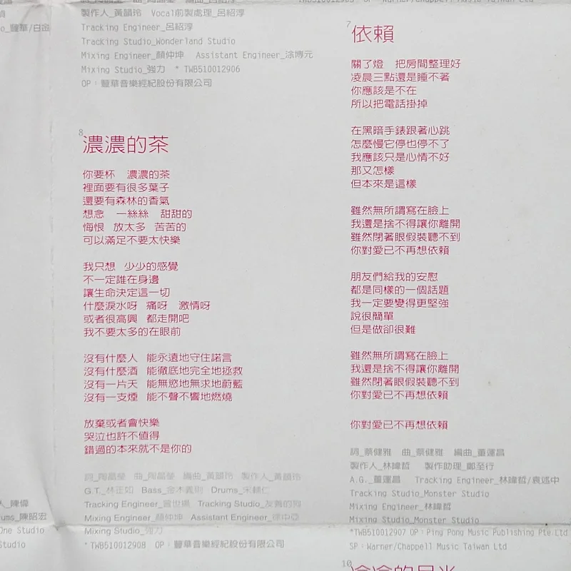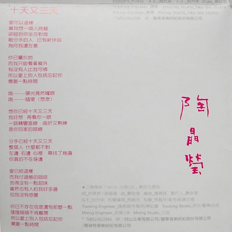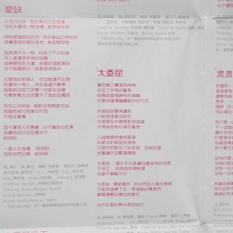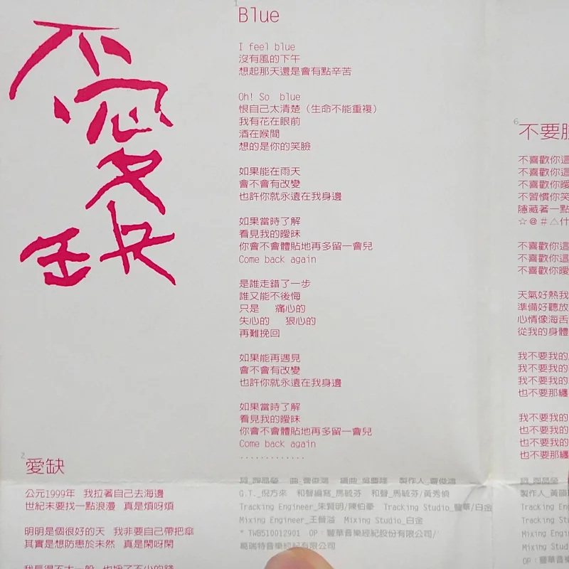 【專輯曲序】 1.〈Blue〉 詞:陶晶瑩/曲:曹俊鴻 編曲:吳慶隆 2.〈愛缺〉 詞曲:童孔 編曲:林暐哲 3.〈太委屈〉 詞曲:鄭華娟 編曲:Mickey、陳偉 4.〈十天又三天〉 三陽機車「Smile 心情125」廣告主題曲 詞:許常德、陶晶瑩/曲:曹俊鴻 編曲:鍾興民 5.〈那些日子〉 詞曲:袁惟仁 編曲:江建民 6.〈不要臉〉 詞曲:陶晶瑩 編曲:呂紹淳 7.〈依賴〉 詞曲:蔡健雅 編曲:董運昌 8.〈濃濃的茶〉 詞曲:陶晶瑩 編曲:黃韻玲 9.〈瘸鳥〉 詞曲:潘協慶 編曲:陳偉 10.〈冷冷的月光〉 詞曲:陶晶瑩 編曲:陳偉 【專輯團隊】 發行:陳復明 監製:陳志遠 策劃:李世忠 製作統籌:彭素秋 製作協力:楊新玲、紹泰盤、墨高慧 Mastering Engineer:Stephen Marcussen Masterin studio:Stephen Marcussen Mastering.LLC 行銷統籌:彭素秋 企宣召集:謝天齊 企劃:蕭玉玲、墨高慧、張芳菱、林恬欣 媒體執行:電台.陳怡君、活動.高坤成、電視.楊凱竹、平面.陳秋珍、行銷.許婉怡、行政.謝佩儒 ArtDinection:Nick 造型:曾瓊鶯 髮型:Andy(EROS 4) 化妝:葉曉菁 攝影:余靜萍 平面設計:Nick 音樂錄影帶導演:賴偉康(愛缺、十天又三天、太委屈、依賴) 發行日期:2000年9月 豐華唱片股份有限公司 發行
