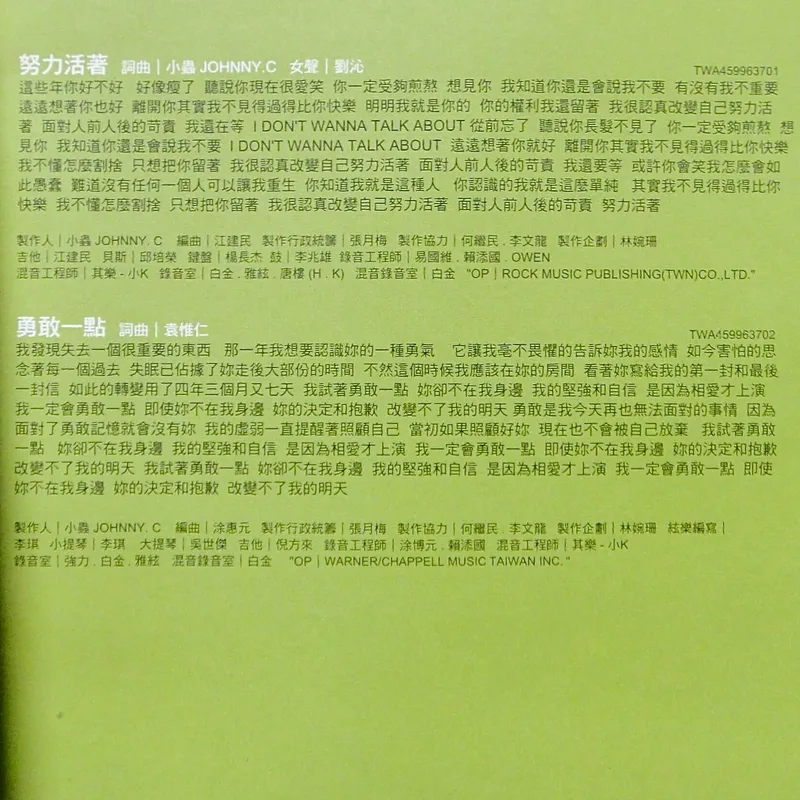 趙傳《勇敢一點》發行於 1999 年 10 月,是一張把「撐住」唱得很真實的專輯。主打歌〈勇敢一點〉用不煽情的方式講放手與自尊,〈努力活著〉則像在低潮時給人的一句打氣。整張專輯的視覺反覆出現仙人掌意象,象徵在艱難環境裡仍要活下去、甚至開花的韌性。 【專輯曲序】 1. 〈努力活著〉 女聲:劉沁 詞曲:小蟲 編曲:江建民 2. 〈勇敢一點〉 詞曲:袁惟仁 編曲:涂惠元 3. 〈老想妳〉 詞曲:小蟲 編曲:江建民 4. 〈我沒有錢〉 詞曲:小蟲 編曲:江建民 5. 〈深海〉 詞:許常德/曲:尤景文 編曲:涂惠元 6. 〈小孩〉 詞:姚謙/曲:劉天健 編曲:梁伯君 7. 〈局外人〉 詞:張美純/曲:黃卓穎 編曲:張瑞成 8. 〈變色魚〉 詞:娃娃/曲:陳子鴻 編曲:許華強 9. 〈一個人〉 詞:易家揚/曲:黃怡 編曲:吳慶隆 10. 〈掙扎〉 詞:十方/曲:顏毓添 編曲:許華強 【專輯團隊】 發行/滾石國際音樂股份有限公司 製作企劃宣傳/火山音樂 發行人/段鍾潭 監製/吳正忠 統籌/梁序倫 林貴敏 製作人/小蟲(1.2.3.4.5) 徐德昌(6) 黃怡(7.8.9.10) 母帶後製處理製作人/小蟲 母帶後製處理工程師/其樂、小K 母帶後製處理錄音室/白金錄音室 企宣統籌/彭羿琴 企劃/余宗正 吳怡哲 文字/余宗正 吳怡哲 專案統籌/鍾秀瑛 媒體執行/電視-張瑞娟、電台-梁莊娜 平面-廖佩玲、行政-何香漪 藝人助理/陳淑惠 平面攝影/黃中平 平面設計/王智弘(日光王子設計聯盟) 影像處理/日光王子設計聯盟 造型/火山音樂企劃部 化妝髮型/林淑貞 音樂錄影帶導演/黃中平(勇敢一點)(努力活著) 發行日期/1999年10月15日