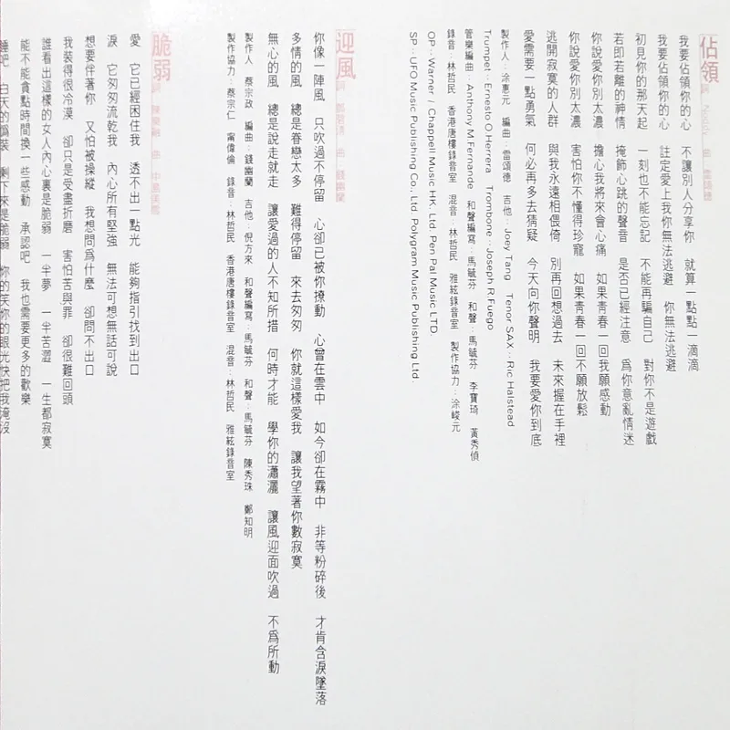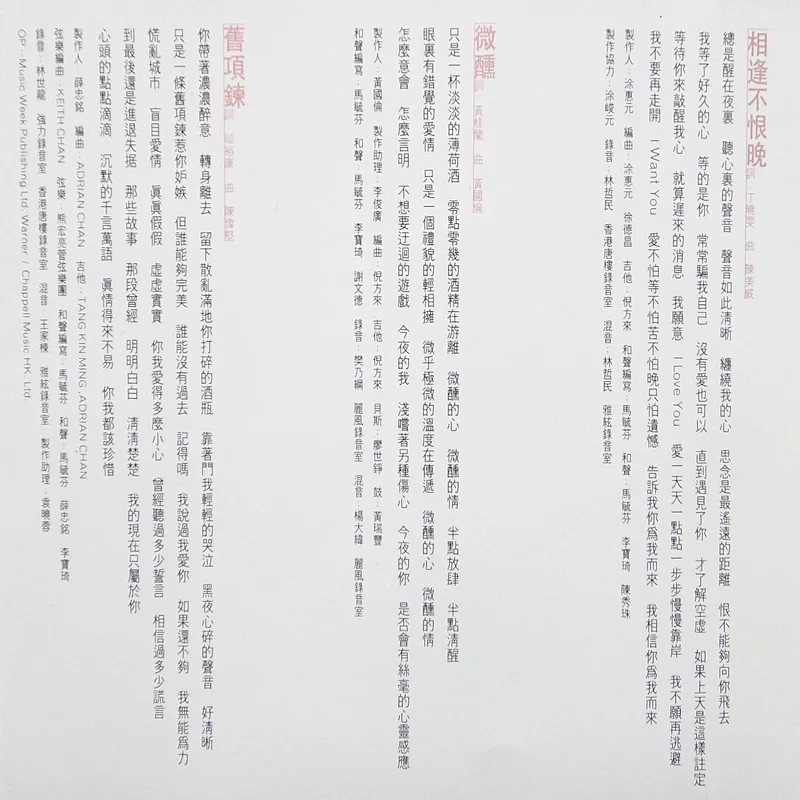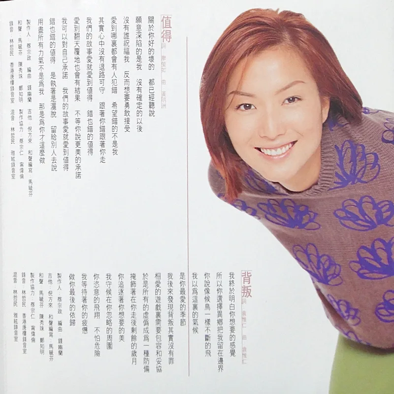 鄭秀文《值得》是一張很典型的「90 年代中後期華語情歌」代表作:旋律好記、情緒克制,但每一句都像把心事整理好才拿出來說。很多人先是因為主打〈值得〉認識它,但整張聽下來你會發現,它不只是一首歌紅而已,而是把「愛過、痛過、還是要繼續往前」這種成熟的傷感,做成一整張很耐聽的情緒線。 這張專輯也很適合拿來看鄭秀文那個時期的魅力:唱腔不灑狗血,反而越冷靜越有力,像在對自己說話。加上製作面在當年已經很精緻,抒情歌的編曲層次、空間感、人聲的距離都抓得剛剛好,所以就算你不是「粉絲」,也很容易被它的氛圍帶走。 如果你只想用一句話形容:《值得》像是一封寫給自己的情書,內容不是求對方回頭,而是提醒自己:曾經那麼認真,也是一種值得。 【專輯曲序】 1. 〈值得〉 詞:廖瑩如/曲:黃明洲 編曲:錢幽蘭 2. 〈背叛〉 詞曲:袁惟仁 編曲:錢幽蘭 3. 〈相逢不恨晚〉 詞:丁曉雯/曲:陳美威 編曲:徐德昌、涂惠元 4. 〈微醺〉 詞:黃桂蘭/曲:黃國倫 編曲:倪方來(並列:Guitar) 5. 〈舊項鍊〉(Discogs 顯示字形:舊頊鍊) 詞:鄔裕康/曲:陳偉堅 編曲:Adrian Chan(另含:弦樂編寫 Keith Chan) 6. 〈曾是你的寶貝〉 詞:陳樂融/曲:馮穎琪 編曲:Robert Seng 7. 〈無所謂〉 詞:何厚華/曲:黃國倫 編曲:屠穎 8. 〈小心女人 (Cinderella)〉 詞:陳祥義/曲:林慕德、陳澤忠 編曲:Randall、陳澤忠(銅管編寫 Ted Lo) 9. 〈依靠〉 詞:黃祖蔭/曲:林東松 編曲:屠穎 10. 〈佔領〉 詞:Noddy/曲:雷頌德 編曲:雷頌德(另含:銅管編寫 Anthony M. Fernandes) 11. 〈迎風〉 詞:鄧碧清/曲:錢幽蘭 編曲:錢幽蘭 12. 〈脆弱〉 詞:陳樂融/曲:中島美雪 編曲:陳志康