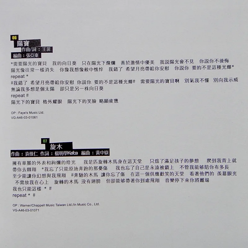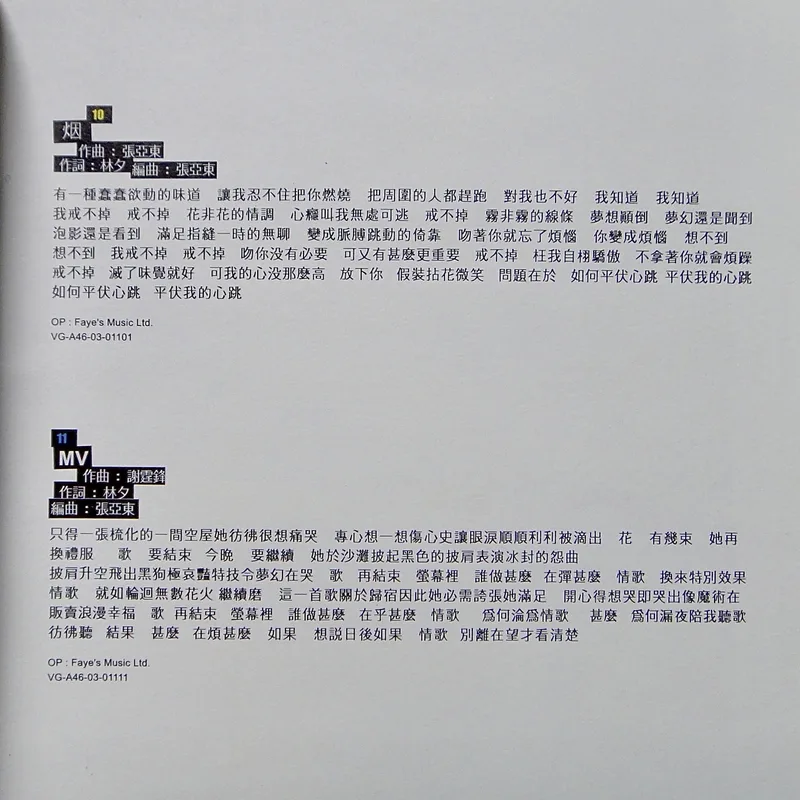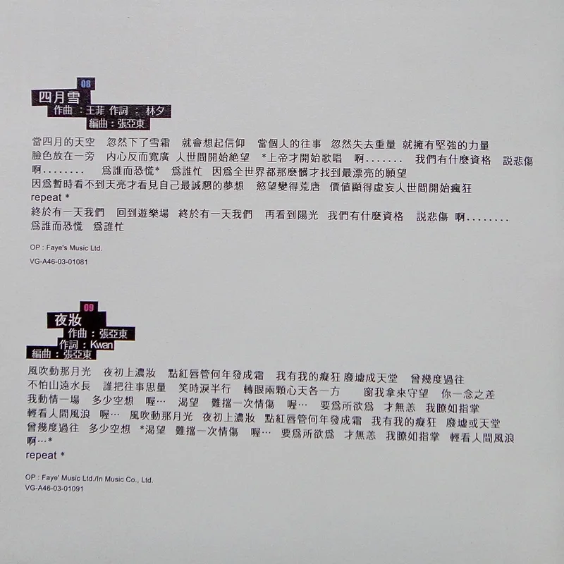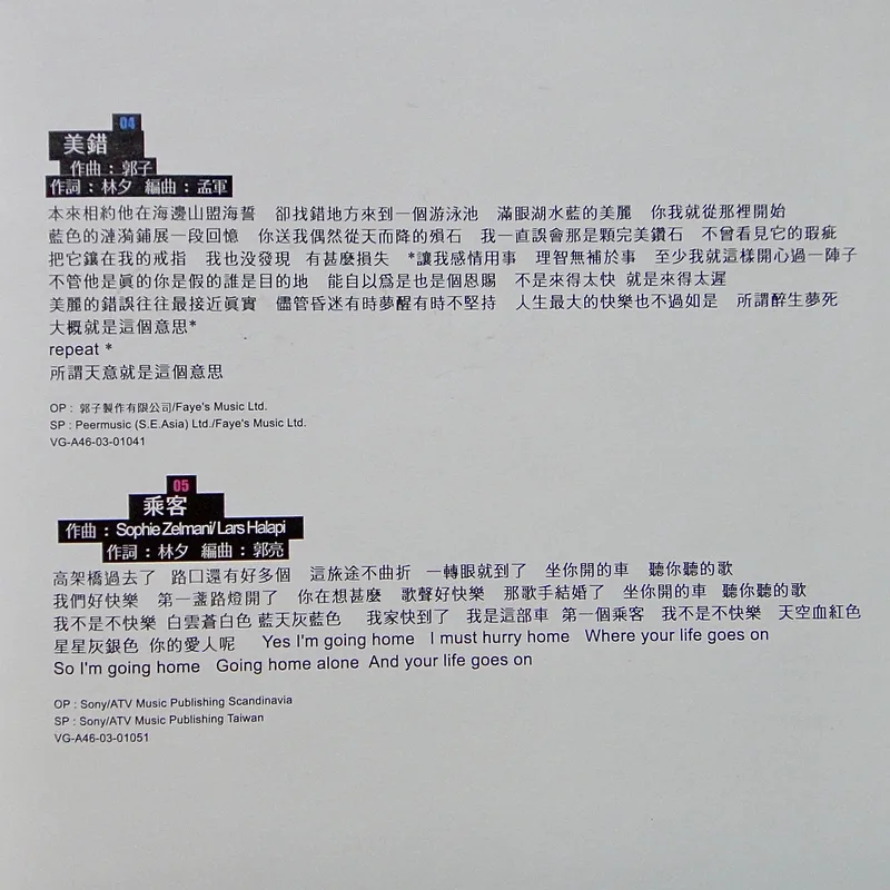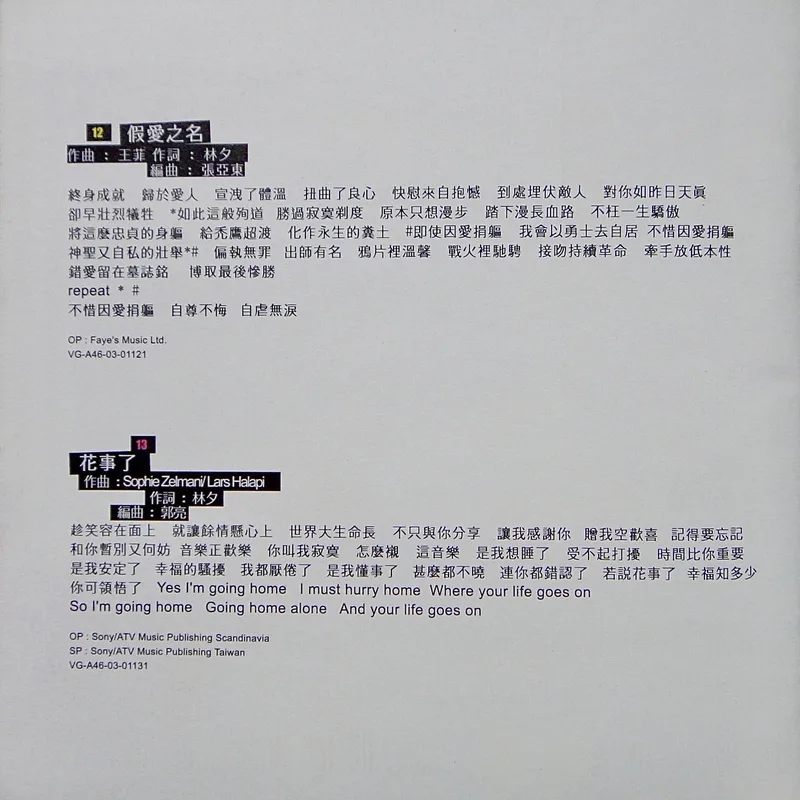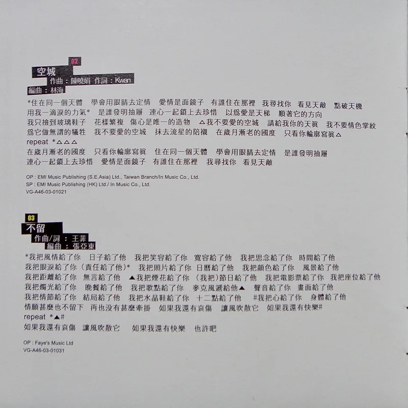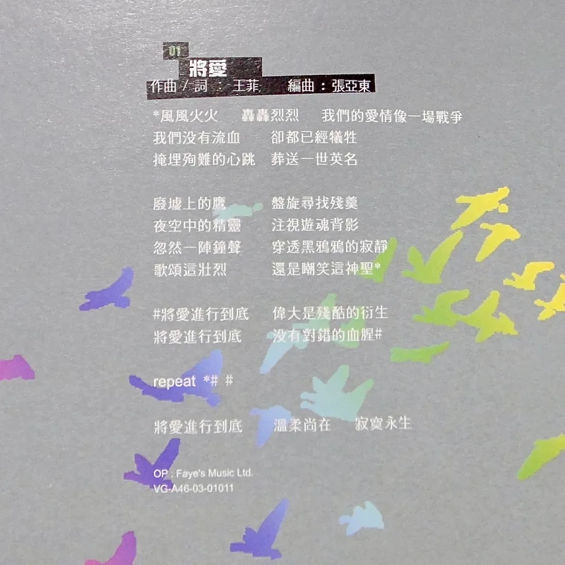 王菲《將愛》是她在 2003 年 11 月推出的國語專輯,由王菲與張亞東共同製作。整張歌走一種很乾淨、很留白的質感,旋律不喧嘩,但情緒很深,像把愛、孤單與決心都收進冷靜的聲線裡慢慢說。從〈將愛〉、〈空城〉到〈乘客〉、〈不留〉,你會聽見她把「愛」唱得不甜不鬧,而是一種清醒、克制、卻很堅定的選擇。 【專輯曲序】 1. 〈將愛〉 詞曲:王菲 編曲:張亞東 2. 〈空城〉 詞:Kwan/曲:陳曉娟 編曲:林海 3. 〈不留〉 詞曲:王菲 編曲:張亞東 4. 〈美錯〉 詞:林夕/曲:郭子 編曲:孟軍 5. 〈乘客〉 詞:林夕/曲:Sophie Zelmani/Lars Halapi 編曲:郭亮 6. 〈陽寶〉 詞曲:王菲 編曲:張亞東 7. 〈旋木〉 詞:楊明學/曲:袁惟仁 編曲:黃中嶽 8. 〈四月雪〉 詞:林夕/曲:王菲 編曲:張亞東 9. 〈夜妝〉 詞:Kwan/曲:張亞東 編曲:張亞東 10. 〈煙〉 詞:林夕/曲:張亞東 編曲:張亞東 11. 〈MV〉(粵語) 詞:林夕/曲:謝霆鋒 編曲:張亞東 12. 〈假愛之名〉(〈將愛〉粵語版) 詞:林夕/曲:王菲 編曲:張亞東 13. 〈花事了〉(〈乘客〉粵語版) 詞:林夕/曲:Sophie Zelmani/Lars Halapi 編曲:郭亮 【專輯團隊】 出版發行:新力哥倫比亞音樂股份有限公司 出版人:崔震東 出品:銀魚音樂有限公司 In Music Co., Ltd. 出品人:邱瓈寬 製作:Able Music (BVI) Ltd. 專輯製作人:王菲 & 張亞東 藝人經理:陳家琪 錄音工程師:張亞東 混音工程師:李軍 & 張亞東 錄音/混音錄音室:噴氣機(北京) 弦樂四重奏錄音工程師:金少剛 & 瞿然 弦樂錄音室:Oasis Studio(北京) 弦樂:亞洲愛樂樂團(Beijing Asia philharmonic strings) 母帶後期工程師:李振權 母帶後期助理工程師:王舒屏/鄭格銜 母帶後期錄音室:Digital Art Mastering(台北) 行銷/宣傳總監:李焯雄 形象統籌/專輯美術統籌:Ti Ti Kwan 平面設計/封套製作:Kitty Chan 攝影:Cheung Man Wah/Join Art 化妝:Zing 髮型:Ben Lee MV 導演:鄺盛(將愛、旋木)/黃中平(不留、乘客)/林錦和(空城) 發行日期:2003 年 11 月