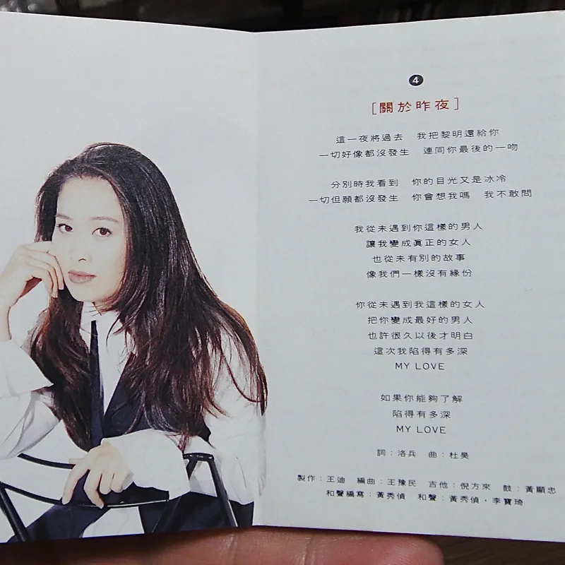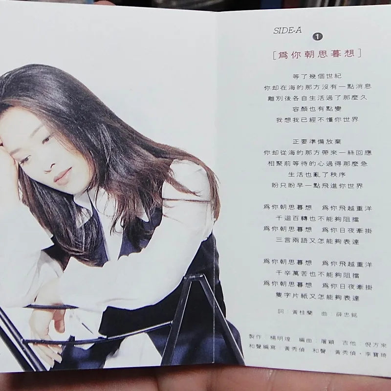 那英的《為你朝思暮想》是她 1994 年在福茂唱片發行的國語專輯,共收錄 10 首歌,專輯全長約 45 分鐘。這張作品可以說是她在台灣華語市場早期很重要的一步,還帶著一點 90 年代初期情歌專輯特有的細膩和克制,但那英的聲音已經很明顯不一樣了。不是那種很甜的抒情路線,而是一開口就有重量,也有情緒。 如果後來大家熟悉的是《白天不懂夜的黑》那種更成熟、更有代表性的那英,那《為你朝思暮想》其實就像是她正式站穩之前的前奏。你會聽見她已經有那種很會唱苦、很能把感情唱深的特質,只是整體氣質還比較靠近 90 年代福茂系的華語流行美學,安靜一點,也比較內斂。 【專輯曲序】 1. 〈為你朝思暮想〉 詞:黃桂蘭/曲:薛忠銘 編曲:屠穎 2. 〈醒時作夢〉 詞曲:鄭華娟 編曲:屠穎 3. 〈心甘情願〉 詞:天玉、Michael/曲:蘇越 編曲:王迪 4. 〈我來 因為你在〉 詞:何啟弘/曲:Jeremy 編曲:Jeremy 5. 〈善變〉 詞:潘麗玉/曲:Jeremy 編曲:Jeremy 6. 〈欲走還留〉 詞:黃桂蘭/曲:陳冠蒨 編曲:屠穎 7. 〈女人就是這樣成熟的〉 詞:洛兵/曲:蘇越 編曲:王迪 8. 〈妥協之歌〉 詞曲:楊明煌 編曲:屠穎 9. 〈關於昨夜〉 詞:洛兵/曲:杜昊 編曲:王豫民 10. 〈自由〉 詞:王中言/曲:凌偉文 編曲:屠穎 【專輯團隊】 發行:福茂音樂股份有限公司 監製:張耕宇 企宣總監:賴郁芬 製作人:楊明煌、王迪(大陸) 製作助理:蘇淑如 錄音師:林世龍、許經綸、黃偉峰(台北強力)、林正忠、黃卓璿、蔡鴻謀(台北白金)、楊大煒(台北麗風)、王迪(大陸百花) 混音工程:林正忠(台北白金) Mastering:嚴建勳 企劃統籌:黃桂蘭 企劃:Micheal 髮型:Sammy、姚純美 化妝:姚純美 平面統籌:林曼玲 電視統籌:吳青竣 媒體執行:陳世偉、石文君、陳桂如、曾珺萍、陳子貞 出版日期: 1994年1月
