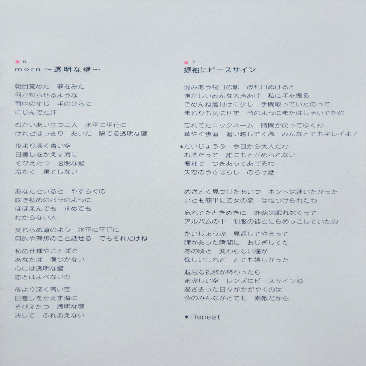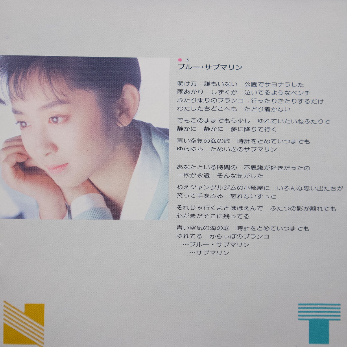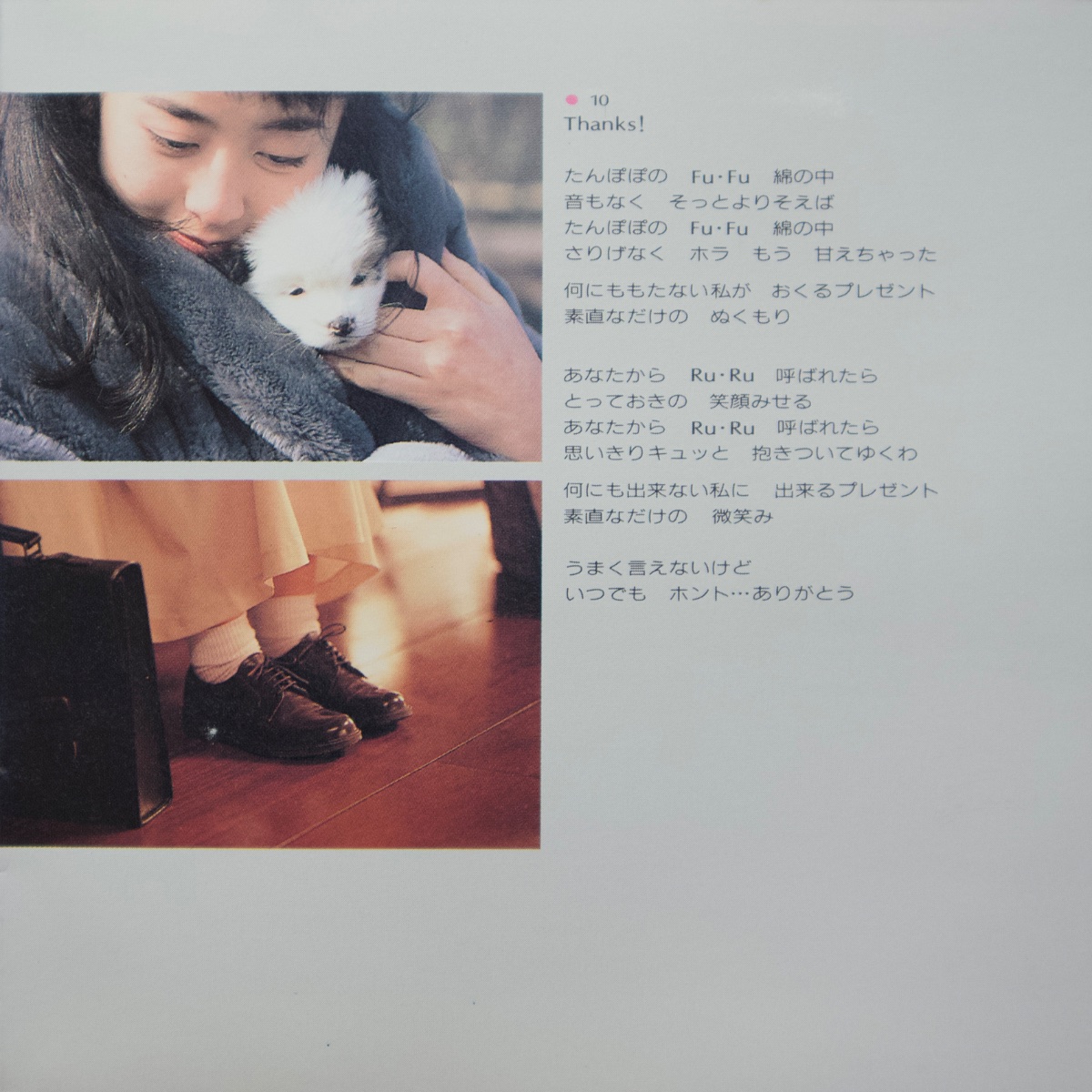 【完整曲目】 1. 〈終りの気配〉 詞:斉藤由貴/曲:山口美央子 編曲:武部聡志 備註:NEC「春のハローC&Cまつり」廣告曲(CM ソング) 2. 〈少女時代〉 詞曲:原由子 編曲:武部聡志 3. 〈ブルー・サブマリン〉 詞:谷山浩子/曲:岡本朗 編曲:武部聡志 4. 〈かわいい あたし〉 詞:斉藤由貴/曲:MAYUMI 編曲:武部聡志 5. 〈Christmas Night〉 詞:斉藤由貴/曲:岡本朗 編曲:武部聡志 6. 〈morn ~透明な壁~〉 詞:斉藤由貴/曲:武部聡志 編曲:武部聡志 7. 〈振袖にピースサイン〉 詞:田口俊/曲:崎谷健次郎 編曲:武部聡志 8. 〈3年目〉 詞:斉藤由貴/曲:岡本朗 編曲:武部聡志 9. 〈「さよなら」〉 詞:斉藤由貴/曲:原由子 編曲:武部聡志 備註:東寶電影《「さよなら」の女たち》主題歌 10. 〈Thanks!〉 詞:斉藤由貴/曲:MAYUMI 編曲:武部聡志 --- 【製作團隊】 - 導演:Kaz Nagaoka - 助理導演:Miho Sata - 聲音製作人:武部聡志 - 概念/企劃製作人:斉藤由貴 - 混音工程師:Toppy Iizumi - 錄音工程師:Yoshikazu Nakabayashi - 錄音團隊:Hiroji Bando/Hiroki Iijima/Ichiro Kitaoka - 經紀/管理:Tomokazu Ichimura/Takuya Ida/Katsumi Yoshifuji - 樂手統籌:Fumio Miyata - 視覺設計:Hakubun Arai - 攝影:Motoshi Nishio(封面)/Hakubun Arai(內頁) - 造型:Hiromi Shintani - 髮妝:Makiko Takahashi - 錄音室:Take One Studio/Music Inn Studio/Sound Valley Studio/Hitokuchizaka Studio/Kawaguchiko Studio - 錄音期間:1986 年 10 月~1988 年 2 月