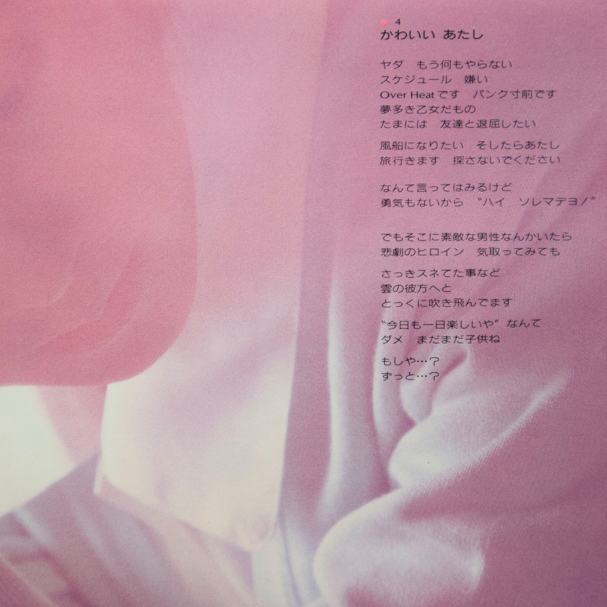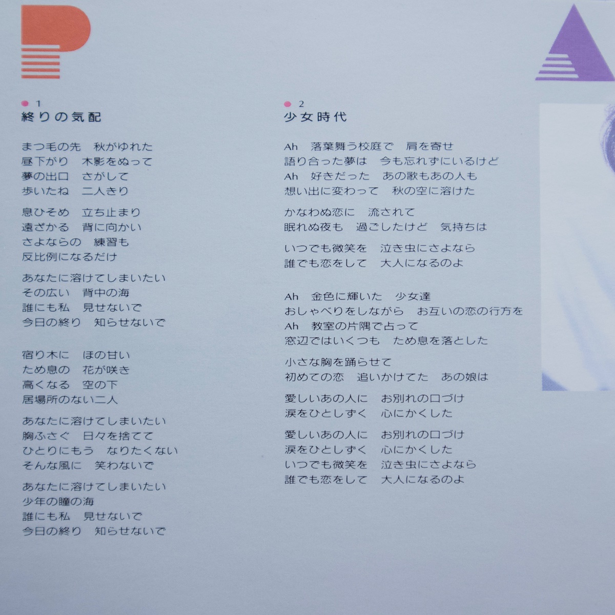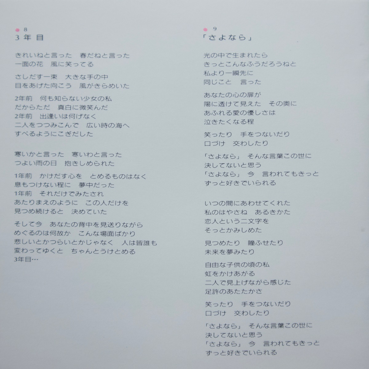 【完整曲目】 1. 〈終りの気配〉 詞:斉藤由貴/曲:山口美央子 編曲:武部聡志 備註:NEC「春のハローC&Cまつり」廣告曲(CM ソング) 2. 〈少女時代〉 詞曲:原由子 編曲:武部聡志 3. 〈ブルー・サブマリン〉 詞:谷山浩子/曲:岡本朗 編曲:武部聡志 4. 〈かわいい あたし〉 詞:斉藤由貴/曲:MAYUMI 編曲:武部聡志 5. 〈Christmas Night〉 詞:斉藤由貴/曲:岡本朗 編曲:武部聡志 6. 〈morn ~透明な壁~〉 詞:斉藤由貴/曲:武部聡志 編曲:武部聡志 7. 〈振袖にピースサイン〉 詞:田口俊/曲:崎谷健次郎 編曲:武部聡志 8. 〈3年目〉 詞:斉藤由貴/曲:岡本朗 編曲:武部聡志 9. 〈「さよなら」〉 詞:斉藤由貴/曲:原由子 編曲:武部聡志 備註:東寶電影《「さよなら」の女たち》主題歌 10. 〈Thanks!〉 詞:斉藤由貴/曲:MAYUMI 編曲:武部聡志 --- 【製作團隊】 - 導演:Kaz Nagaoka - 助理導演:Miho Sata - 聲音製作人:武部聡志 - 概念/企劃製作人:斉藤由貴 - 混音工程師:Toppy Iizumi - 錄音工程師:Yoshikazu Nakabayashi - 錄音團隊:Hiroji Bando/Hiroki Iijima/Ichiro Kitaoka - 經紀/管理:Tomokazu Ichimura/Takuya Ida/Katsumi Yoshifuji - 樂手統籌:Fumio Miyata - 視覺設計:Hakubun Arai - 攝影:Motoshi Nishio(封面)/Hakubun Arai(內頁) - 造型:Hiromi Shintani - 髮妝:Makiko Takahashi - 錄音室:Take One Studio/Music Inn Studio/Sound Valley Studio/Hitokuchizaka Studio/Kawaguchiko Studio - 錄音期間:1986 年 10 月~1988 年 2 月