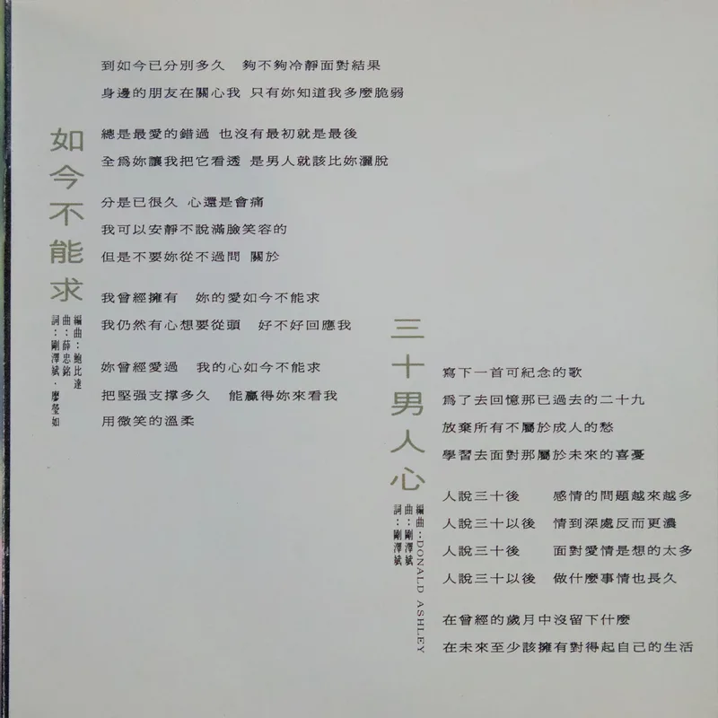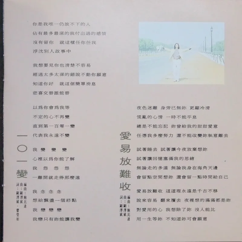 剛澤斌《愛 ■ 易放難收》:一張被低估的九○年代情歌專輯 在九○年代初的台灣流行音樂裡,市場變化很快,歌手來來去去,唱片公司也不斷重組。很多作品曾經進入市場,卻沒有被完整保存下來;多年後回頭看,反而更能發現其中一些專輯的價值,不在當年的聲量,而在它留下來的質地。 剛澤斌的《愛易放難收》就是這樣的一張作品。根據內頁,這張專輯由立得唱片發行,編號 LDR-0001,版權年份為 1993 年。它不只是剛澤斌作為歌手的重要專輯,同時也是一張很能代表當年華語流行音樂製作方式的唱片:創作者本人深度參與,編曲陣容多元,錄音與製作跨越台灣、新加坡、香港與日本,甚至連視覺拍攝都帶有跨地域合作的痕跡。從這些細節來看,《愛易放難收》並不是一張隨手完成的作品,而是一張有完整製作企圖的專輯。 更重要的是,這張專輯讓人看見剛澤斌不只是演唱者,也是核心創作者與製作人。十首作品裡,多數詞曲都由他親自參與完成,整張專輯的情緒主軸也十分集中,圍繞著失去、懷念、壓抑、成熟與放不下等情感展開。它不是年輕氣盛的情歌,而是比較靠近成年人心境的作品。放在九○年代華語流行音樂的脈絡裡,這種氣質其實很值得重新被看見。 【曲序與創作名單】 1. 〈101變〉 詞:剛澤斌、廖瑩如/曲:剛澤斌 編曲:鮑比達 2. 〈愛 ■ 易放難收〉 詞:剛澤斌/曲:剛澤斌 編曲:鮑比達 3. 〈善待我的溫柔〉 詞:剛澤斌/曲:濱田省吾 編曲:郭峰 4. 〈讓你走〉 詞:剛澤斌、廖瑩如/曲:玉置浩二 編曲:Donald Ashley 5. 〈感受〉 詞:剛澤斌/曲:剛澤斌 編曲:郭峰 6. 〈靠你更近〉 詞:剛澤斌/曲:剛澤斌 編曲:鮑比達 7. 〈釋放愛情〉 詞:剛澤斌/曲:剛澤斌 編曲:林志德 8. 〈如今不能求〉 詞:剛澤斌、廖瑩如/曲:薛忠銘 編曲:鮑比達 9. 〈三十男人心〉 詞:剛澤斌/曲:剛澤斌 編曲:Donald Ashley 10. 〈想想可惜〉 詞:剛澤斌/曲:剛澤斌 編曲:郭峰 【幕後陣容】 - 唱片公司:立得唱片 - 專輯編號:LDR-0001 - 版權年份:℗ 1993/© 1993 立得唱片事業有限公司 - 出品:王祥基、嚴建國 - 監製:黃世森、張月嬌 - 製作總監:陳美威 - 製作人:剛澤斌 - 製作協力:許寰樑(新加坡)、半田克之(日本) - 混音:剛澤斌、陳美威、王家棟、何慶堂 - 合聲編寫:黃秀偵 - 合聲:陳美威、薛忠銘、黃秀偵、鄭知明 - 吉他:Martin Pereire、鍾慶鴻、蘇德華 - Bass:林志宏 - Soprano Sax:Ding Bas Bas(〈愛易放難收〉) - 鼓手:Donald Ashley - 錄音室: MIDI CITY BOSS STUDIO(新加坡) SOUND STATION SONY MUSIC ENTERTAINMENT(CBS)(香港) ONKIO HAUS INC.(日本) 加合錄音室(台灣) - 企劃總監:黃惠珠 - 企宣統籌:廖瑩如 - 文案:廖瑩如 - 企宣:立得唱片企宣部 - 造型:高莉莎(印度)、廖瑩如(台北) - 化妝髮型:高莉莎(印度)、林美利(台北) - 攝影:十月影視(印度)、林炳存(台北) - MTV 導演:李經華(印度)、吳思達(台北) - 平面設計:Album Design Unit 【重新認識《愛 ■ 易放難收》】 如果從一般聽眾的角度重新聽《愛易放難收》,最容易感受到的,是這張專輯很安靜,也很誠實。 它沒有把情緒做得特別外放,也不是那種用大起大落去抓耳朵的專輯。相反地,它比較像是一整張慢慢往心裡走的作品。從〈愛易放難收〉、〈感受〉、〈如今不能求〉、〈想想可惜〉到〈三十男人心〉,整張專輯都在寫一種已經經歷過感情、也已經知道感情不會總照人期待發展之後,留下來的心情。那不是青春期式的衝動,而是比較成熟的遺憾、比較內斂的痛,還有一種明明知道應該放手,卻始終沒有真正放下的拉扯。 這張專輯的另一個特色,是剛澤斌很明顯把自己的創作性格放在前面。這不是一張單純依靠外來收歌拼湊而成的作品,而是能聽出歌手本人審美與情緒方向的專輯。即使其中有兩首作品來自日本作曲家的旋律來源,整體聽感仍然相當一致。〈善待我的溫柔〉的原曲可對應到浜田省吾的〈もうひとつの土曜日〉,〈讓你走〉則可確認作曲為玉置浩二,現有資料多指向安全地帶的作品脈絡。這兩首歌放進專輯裡,不會顯得突兀,反而很自然地融入整張唱片的抒情氣氛,也讓人看見九○年代台灣流行音樂如何把日本旋律重新轉化為本地情感敘事的一部分。 如果要說《愛 ■ 易放難收》最值得重聽的地方,我會認為是它的分寸感。它不靠激烈取勝,也不刻意把悲傷放大,而是把每一種情緒都收在剛剛好的位置。像〈三十男人心〉這樣的歌名,幾乎已經把整張專輯的核心說得很明白。它寫的不只是愛情本身,而是人到了某個年紀之後,怎麼理解愛情、怎麼承受失去、又怎麼在失去之後繼續生活。這種主題放在今天聽,仍然有它的穿透力。 從歷史位置來看,《愛 ■ 易放難收》未必是九○年代華語流行音樂裡最廣為人知的經典,但它很可能是一張被低估的成熟之作。它讓人看到一位創作歌手如何把個人的感情經驗、製作判斷與當時的流行音樂工業結合起來,做出一張有一致性、有情緒溫度,也有時代感的專輯。很多專輯是當年就很紅,很多專輯則是要過很多年,才會被真正聽懂。《愛 ■ 易放難收》更像是後者。