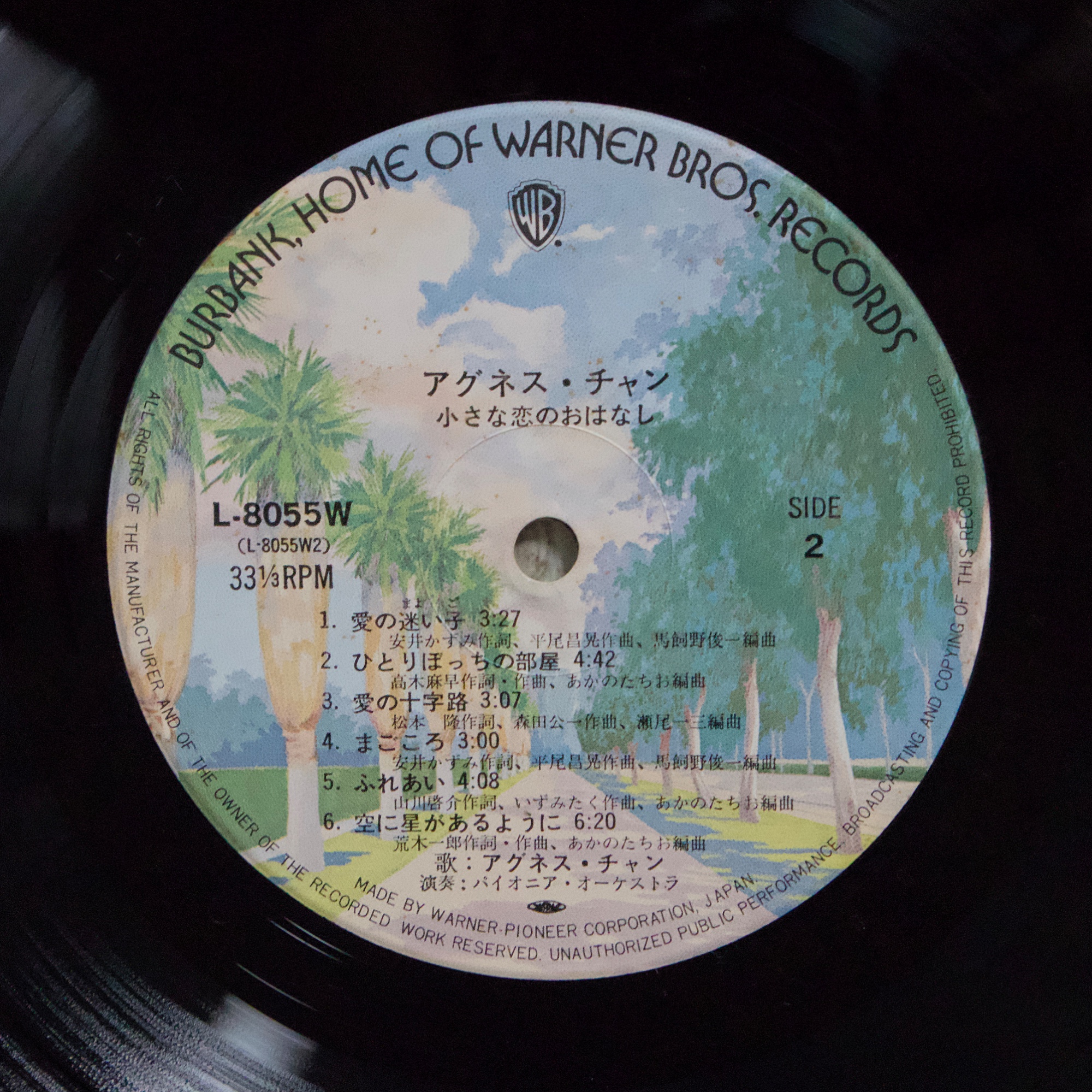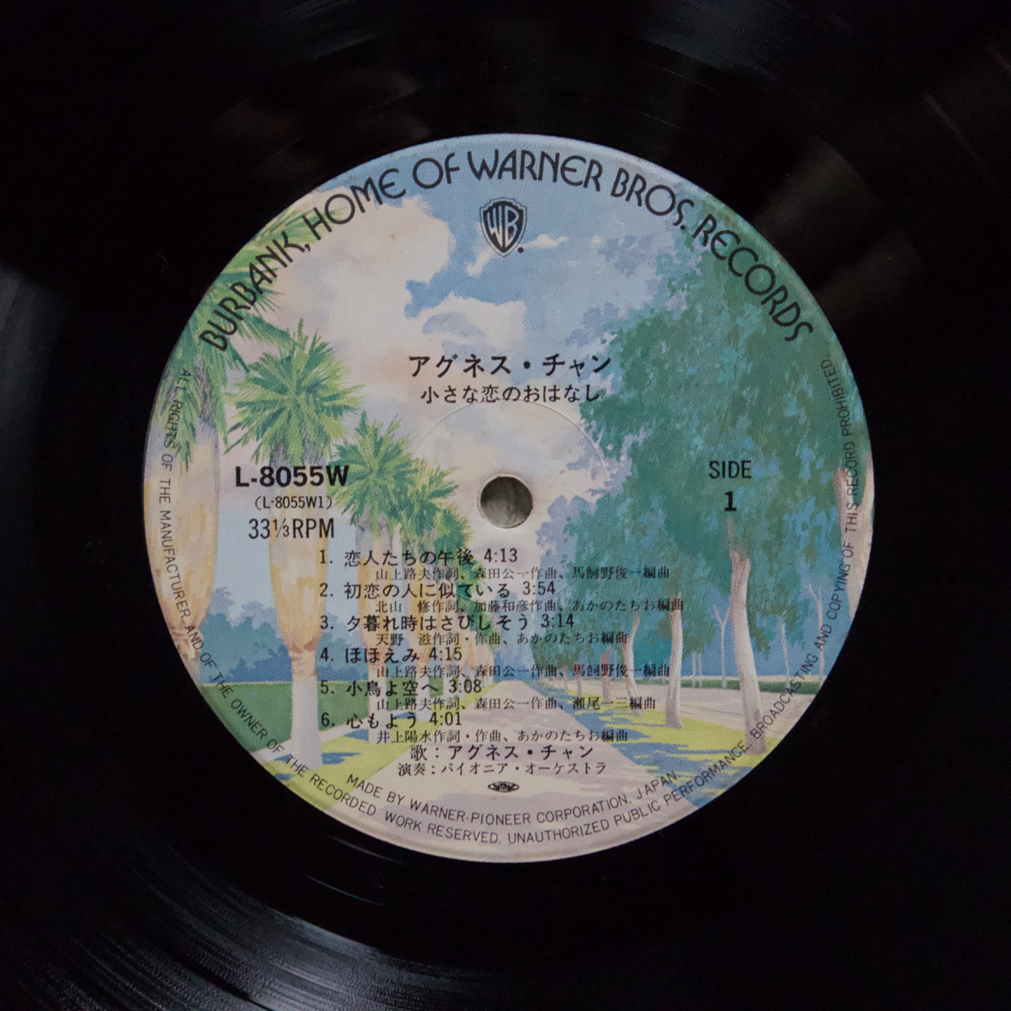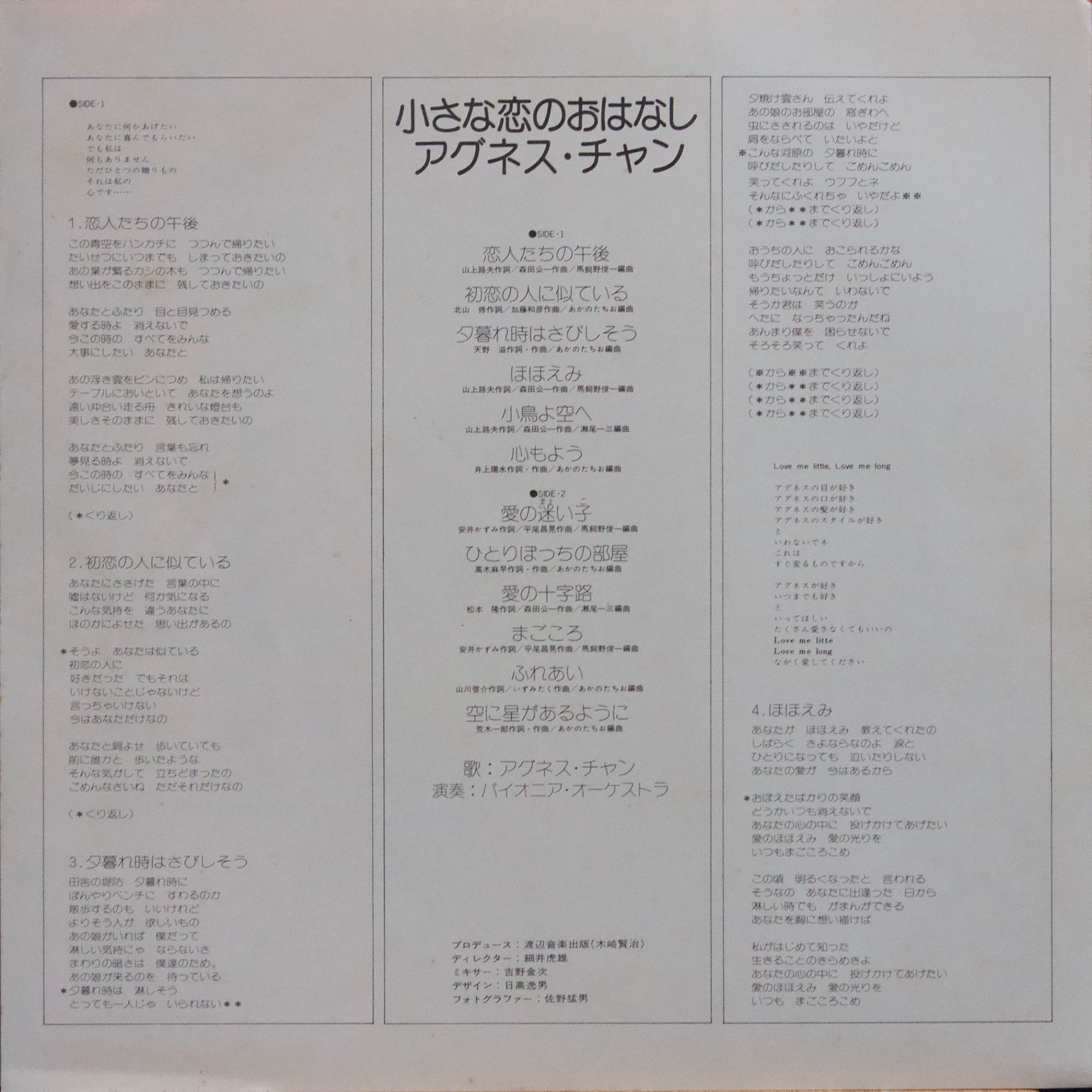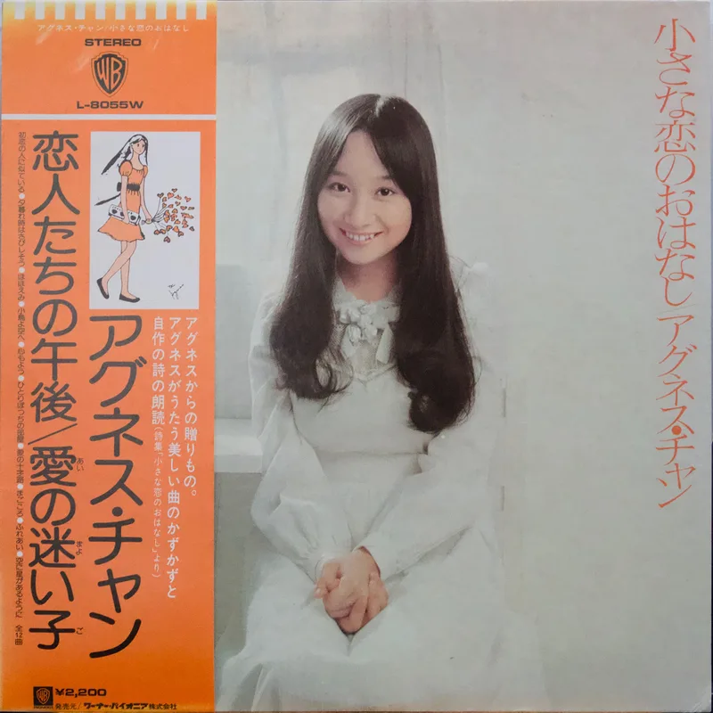 《小さな恋のおはなし》是 Agnes Chan(アグネス・チャン)1975 年 4 月 25 日在日本由 Warner-Pioneer 發行的錄音室專輯,品番 L-8055W。這張專輯發行於她在日本樂壇已經建立高人氣之後,因此不只是單純延續少女偶像形象的作品,也可以看成她七○年代中期日本時期的重要專輯之一。 從曲目與創作者名單來看,這張專輯不是單一創作人包辦的作品,而是集合了當時日本主流流行音樂圈多位重要詞曲作者與編曲者。山上路夫、森田公一、平尾昌晃、松本隆、井上陽水、荒木一郎,以及馬飼野俊一、瀬尾一三、あかのたちお等人的名字都出現在專輯裡,顯示它有很鮮明的七○年代日本流行音樂工業輪廓。 就內容來看,這張專輯帶有明顯的翻唱與再詮釋性質。像〈心もよう〉、〈ふれあい〉、〈空に星があるように〉這些歌,本身就來自當時已有知名度的日本作品,因此《小さな恋のおはなし》除了呈現 Agnes Chan 的聲音特色,也反映出當時日本唱片市場如何透過選曲與重新詮釋,去延續她清新、柔和、青春感很強的歌手形象。 如果用今天的角度來看,這張專輯的價值不只是在 Agnes Chan 的個人作品列表裡占有一席之地,也在於它很完整地保存了七○年代日本流行唱片的選曲邏輯、製作方式與偶像美學。它不是靠強烈戲劇性取勝,而是用細緻、溫柔、略帶感傷的氣質,把那個年代的青春抒情感留了下來。 【曲序與創作名單】 1. 〈恋人たちの午後〉 詞:山上路夫/曲:森田公一 編曲:馬飼野俊一 2. 〈初恋の人に似ている〉 詞:北山修/曲:加藤和彦 編曲:あかのたちお 3. 〈夕暮れ時はさびしそう〉 詞:天野滋/曲:天野滋 編曲:あかのたちお 4. 〈ほほえみ〉 詞:山上路夫/曲:森田公一 編曲:馬飼野俊一 5. 〈小鳥よ空へ〉 詞:山上路夫/曲:森田公一 編曲:瀬尾一三 6. 〈心もよう〉 詞:井上陽水/曲:井上陽水 編曲:あかのたちお 7. 〈愛の迷い子〉 詞:安井かずみ/曲:平尾昌晃 編曲:馬飼野俊一 8. 〈ひとりぼっちの部屋〉 詞:高木麻早/曲:高木麻早 編曲:あかのたちお 9. 〈愛の十字路〉 詞:松本隆/曲:森田公一 編曲:瀬尾一三 10. 〈まごころ〉 詞:安井かずみ/曲:平尾昌晃 編曲:馬飼野俊一 11. 〈ふれあい〉 詞:山川啓介/曲:いずみたく 編曲:あかのたちお 12. 〈空に星があるように〉 詞:荒木一郎/曲:荒木一郎 編曲:あかのたちお 【幕後陣容】 歌:アグネス・チャン 演奏:パイオニア・オーケストラ プロデュース:渡辺音楽出版社(木崎賢治) ディレクター:細井克雄 ミキサー:富野紀之 デザイン:日高義男 フォトグラファー:佐野滋男