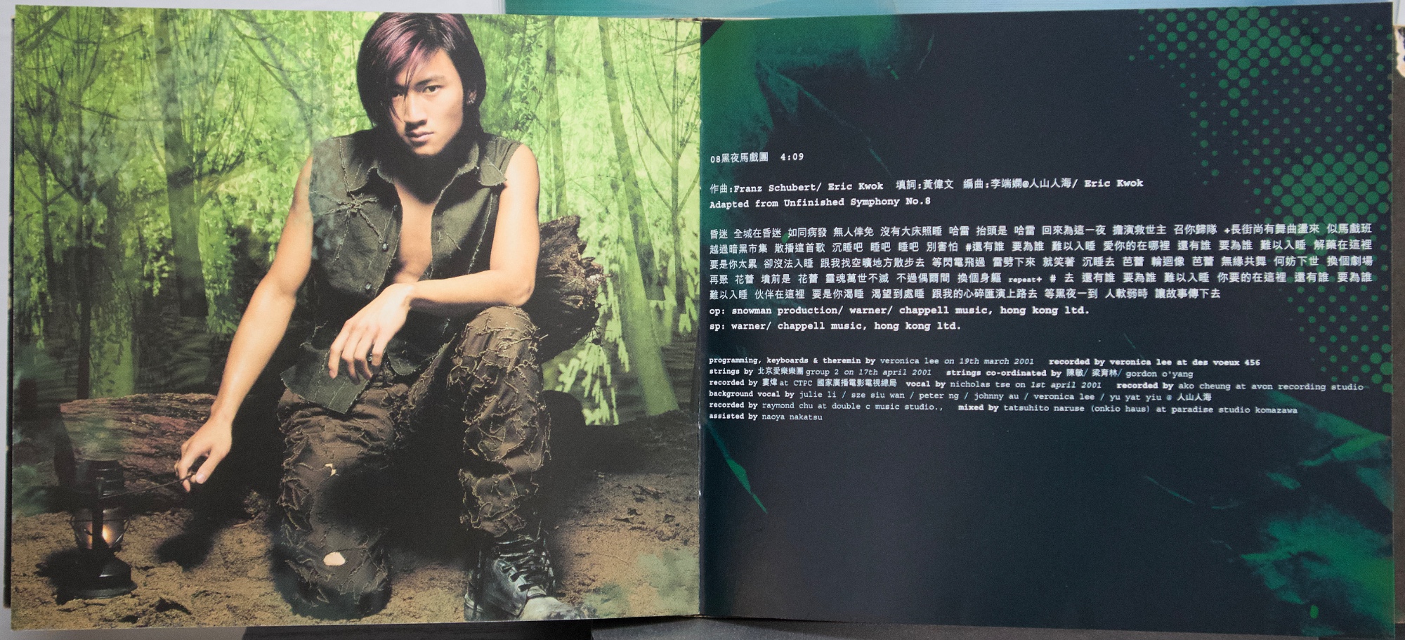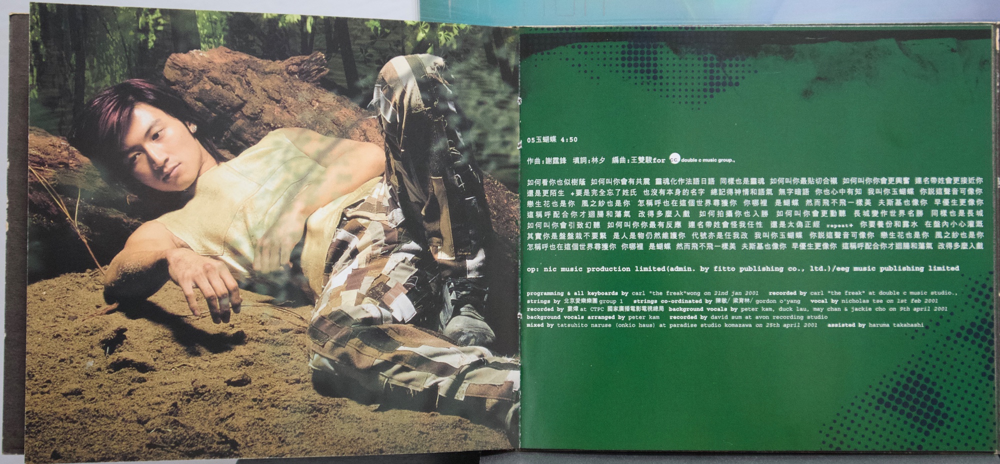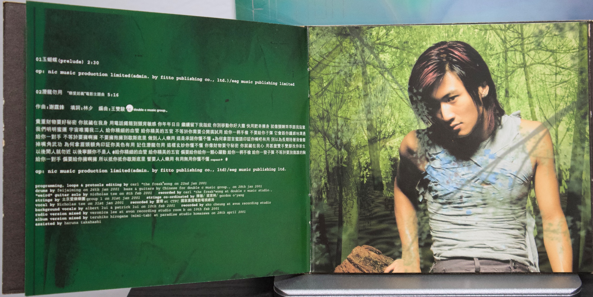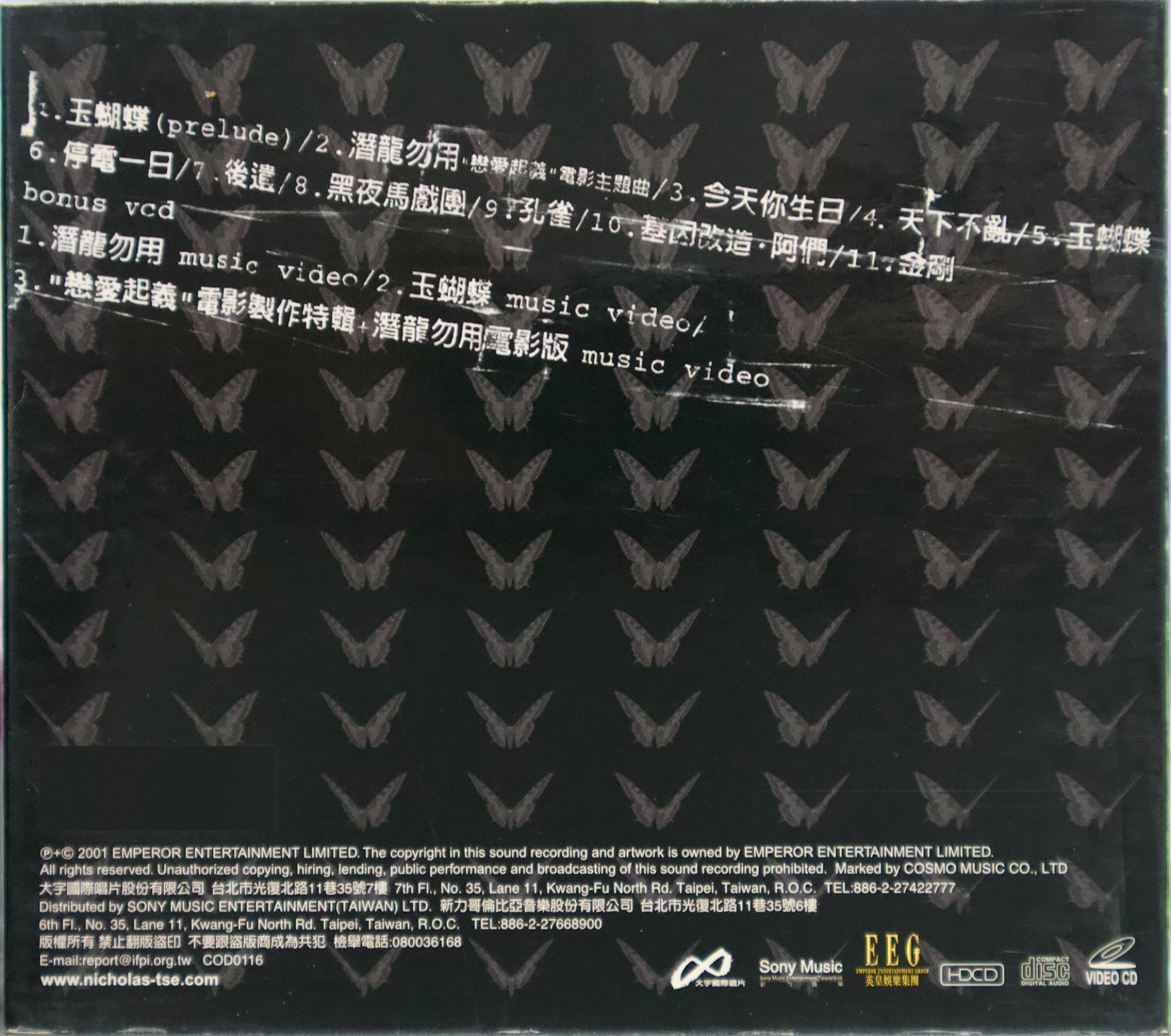 謝霆鋒《玉蝴蝶》(2001) 2001 年發行的《玉蝴蝶》,在謝霆鋒的音樂生涯中具有關鍵位置。這張專輯發行時,他已經是香港最受矚目的年輕歌手之一,但《玉蝴蝶》的意義並不只在人氣,而在於他開始全面參與創作與製作,專輯聲音與概念的完整度明顯提升。從搖滾編制、弦樂配置到跨地錄音與日本母帶後製,這張專輯呈現出當時香港主流唱片仍具備的大型製作能力,也顯示謝霆鋒不再只是演唱別人作品的歌手,而是逐漸轉向專輯型創作者。 專輯的聲音結構由王雙駿與謝霆鋒共同建立,整體以搖滾為骨架,但大量加入弦樂與空間感編曲,使音樂不只停留在樂隊聲響,而帶有更接近電影配樂與室內樂的層次。北京愛樂樂團分組錄製弦樂,並依不同歌曲風格配置不同弦樂組別;母帶則在日本完成,使整張專輯在聲音質地上與一般同期粵語流行專輯有所區隔。再加上 SUGIZO 參與兩首作品,使專輯同時出現港式搖滾與日系氛圍搖滾的聲音差異,讓《玉蝴蝶》在 2000 年代初的香港流行音樂中顯得相當獨特。 若從專輯內容來看,《玉蝴蝶》並不是單一情歌專輯,而是一張結構完整的專輯作品。從序曲形式的〈玉蝴蝶(Prelude)〉開始,到專輯中段的主打區,再到後段較概念化與戲劇性的作品,整張專輯的情緒與聲音密度逐漸變化。〈玉蝴蝶〉與〈潛龍勿用〉奠定專輯的核心位置,而〈黑夜馬戲團〉、〈基因改造.阿們〉等作品則讓專輯出現更強烈的概念與畫面感,使整張唱片在流行性之外,也保留了相當程度的創作野心。多年之後再回頭看,《玉蝴蝶》之所以常被視為謝霆鋒的代表專輯之一,並不只是因為同名曲流行,而是因為這張專輯完整記錄了他從偶像歌手走向創作與製作導向音樂人的過程。 【專輯曲序】 1.〈玉蝴蝶(prelude)〉 曲:謝霆鋒 備註:本頁內頁未見另列填詞、編曲欄位 2.〈潛龍勿用〉 詞:林夕/曲:謝霆鋒 編曲:王雙駿 備註:電影《戀愛起義》主題曲 3.〈今天你生日〉 詞:林夕/曲:SUGIZO 製作人:SUGIZO 4.〈天下不亂〉 詞:黃偉文/曲:Chinese 編曲:Chinese 備註:電影《我的野蠻同學》歌曲 5.〈玉蝴蝶〉 詞:林夕/曲:謝霆鋒 編曲:王雙駿 備註:〈一點紅〉粵語版 6.〈停電一日〉 詞:周耀輝/曲:Chinese 編曲:Chinese 7.〈後遺〉 詞:林夕/曲:SUGIZO 製作人:SUGIZO 備註:〈瘟疫〉粵語版 8.〈黑夜馬戲團〉 詞:黃偉文/曲:Franz Schubert、Eric Kwok 編曲:李端嫻(人山人海)、Eric Kwok 備註:Adapted from Unfinished Symphony No. 8 9.〈孔雀〉 詞:黃偉文/曲:金培達 編曲:劉祖德 10.〈基因改造.阿們〉 詞:周耀輝/曲:胡波 編曲:Chinese 11.〈金剛〉 詞:黃偉文/曲:曾加謀 編曲:王雙駿 【專輯團隊】 北京愛樂樂團 group 1(〈潛龍勿用〉/〈玉蝴蝶〉/〈停電一日〉) violin:崔曉雷、王泓、劉玉琪、陳怡、胡丹、后昆年、陳欣、李博彥、陳曉偉、李沛、羅林、簡蓓、彭珂、吳陽 viola:曹飛、李明、張安祥、毛新光、童衛東 cello:趙學廉、馬瑛、黃遠澤、郭利、吳春林 contra bass:張旭明、邵世岐 北京愛樂樂團 group 2(〈基因改造.阿們〉/〈黑夜馬戲團〉) violin:曾城、莫琦、王洋、崔曉雷、劉玉琪、陳怡、后昆年、李沛、羅林、簡蓓、彭珂、吳陽、楊瑩、賈梅 viola:曹飛、李明、張安祥、毛新光 cello:趙學廉、郭筱姮、黃遠澤、關正躍 contra bass:張旭明、邵世岐 全碟製作:王雙駿、謝霆鋒 第 3、7 首製作:SUGIZO 母帶後製:Yuka Koizumi 母帶後製協力:Yumi Takeuchi 特別鳴謝:Mama Workshop、Tsutomu Nakamura 出品人:李進 市場及媒體統籌:Lam Wai Hon A&R:Tony Kong、Stanley Leung、Gordon O'Yang 宣傳(電台):Herman Tse、Lai Tze Leung、Ewin Lee 宣傳(電視):Horace Wai、Keith Wong 藝人管理:Polly Pang、Chow Chu Fai 創作及後期製作:James Lam、Vikki Lee、Winnie Chan 美術指導、電腦繪圖、平面設計及美術製作:模擬城市 形象及服裝:Tomas Chan 攝影:Sam Wong 髮型:Ricky Kwok 化妝:Donald Chiu 台灣 出品:大宇國際唱片股份有限公司 Presented by:COSMO MUSIC CO. LTD. 出品人:林利南 營運統籌:林垂言 企劃統籌:賴泳玲 企劃助理:賴文亞 平面設計:黃瓊瑤、林昇 媒體統籌:陳偉明 媒體執行:張敏琦、李定福、朱婷琪、陳怡琳、王勤涵、劉奕顯 海外媒體執行:陳瑞明、謝其評 發行日期:2001 年 5 月 【重新認識《玉蝴蝶》】 如果今天重新從頭聽一次《玉蝴蝶》,會發現它最迷人的地方,其實不是某一首特別紅的歌,而是整張專輯的聲音世界非常完整。從序曲開始,弦樂與空間感就建立了一種帶距離感的氛圍,接著搖滾編制進入,再到中段抒情主打,最後再走向較戲劇與概念化的作品,整張專輯像一個聲音與情緒逐漸展開的過程,而不是單純的歌曲集合。 在聲音上,這張專輯同時存在幾種不同的方向。由王雙駿與謝霆鋒建立的主體,保留了他一貫的搖滾底色,但弦樂比例非常高,而且不是只作背景,而是直接參與情緒推進,使歌曲聽起來有一種接近電影配樂的層次。SUGIZO 製作的兩首歌則帶來不同於香港流行樂的空間感與吉他聲響,使專輯中段出現另一種較冷的音色。再加上〈黑夜馬戲團〉引用古典旋律的做法,使整張專輯在流行、搖滾、古典與概念之間來回移動。 幾首關鍵作品可以作為重新進入這張專輯的入口。〈玉蝴蝶〉幾乎集合了整張專輯的聲音特色,是旋律、歌詞與弦樂配置最平衡的一首作品;〈潛龍勿用〉則代表謝霆鋒最具爆發力的搖滾面貌;〈黑夜馬戲團〉讓專輯出現強烈畫面與戲劇感;〈基因改造.阿們〉則把專輯帶到更概念性的