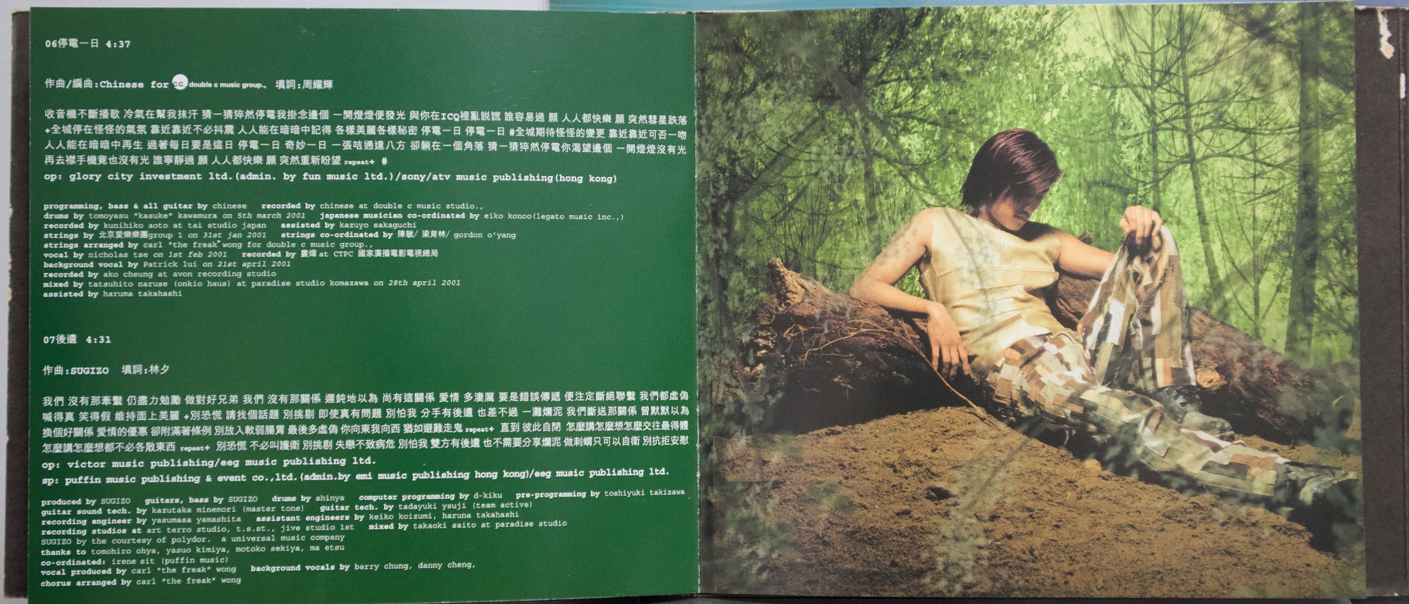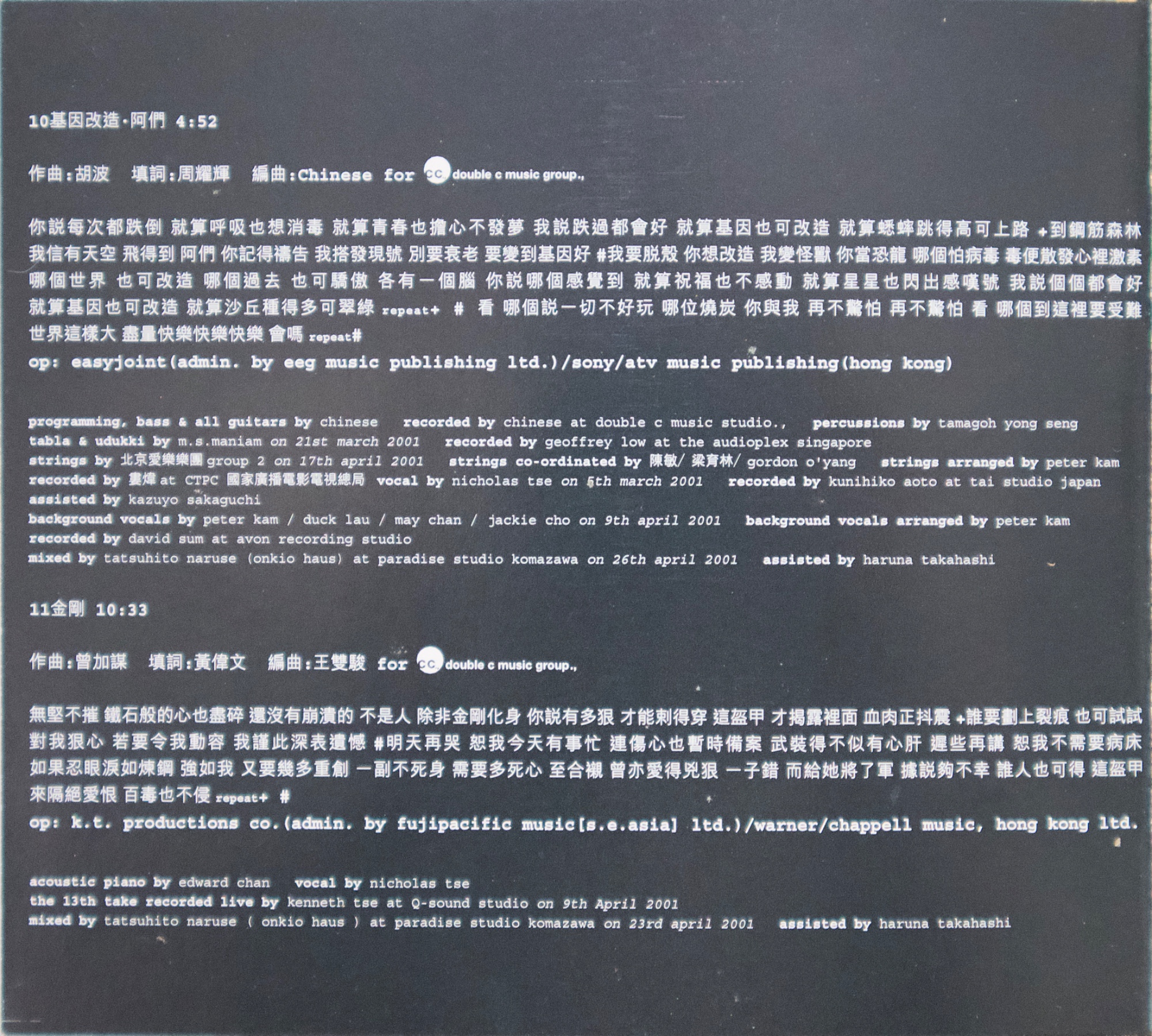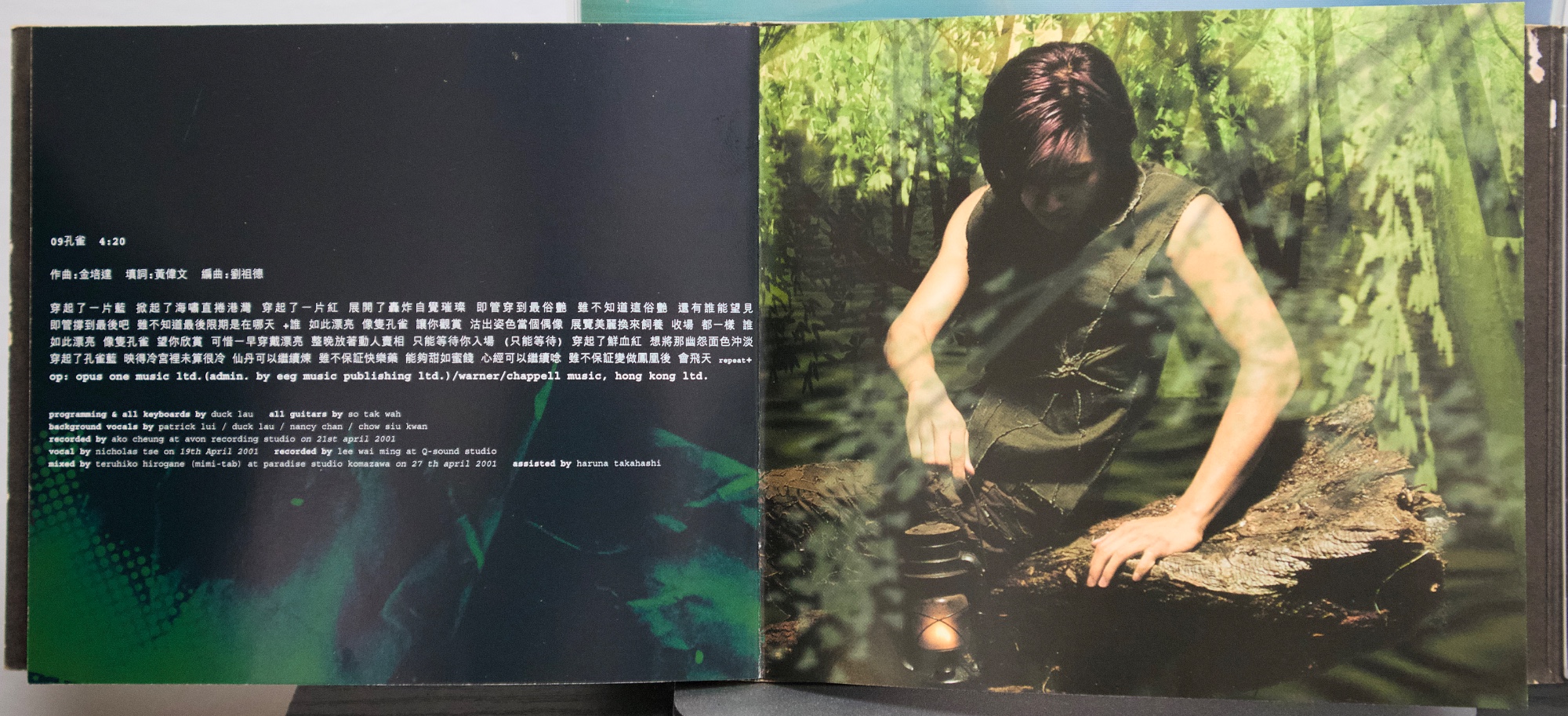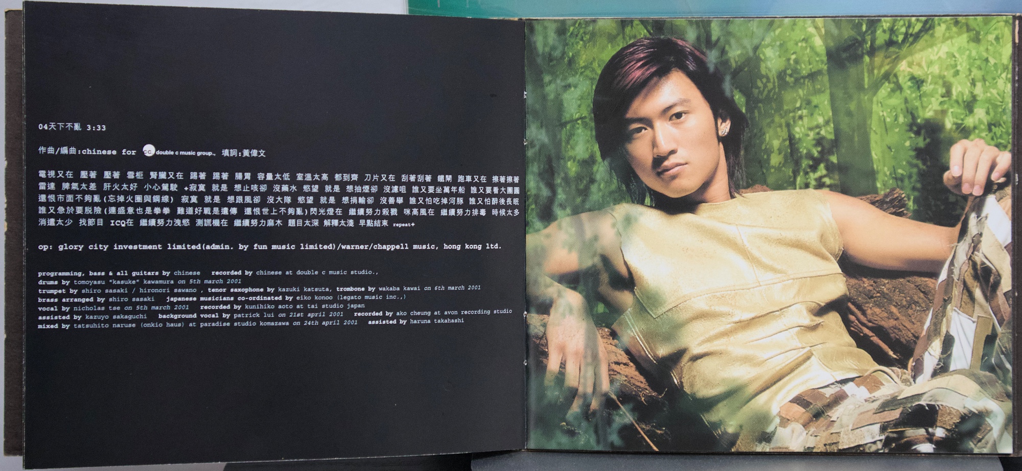 謝霆鋒《玉蝴蝶》(2001) 2001 年發行的《玉蝴蝶》,在謝霆鋒的音樂生涯中具有關鍵位置。這張專輯發行時,他已經是香港最受矚目的年輕歌手之一,但《玉蝴蝶》的意義並不只在人氣,而在於他開始全面參與創作與製作,專輯聲音與概念的完整度明顯提升。從搖滾編制、弦樂配置到跨地錄音與日本母帶後製,這張專輯呈現出當時香港主流唱片仍具備的大型製作能力,也顯示謝霆鋒不再只是演唱別人作品的歌手,而是逐漸轉向專輯型創作者。 專輯的聲音結構由王雙駿與謝霆鋒共同建立,整體以搖滾為骨架,但大量加入弦樂與空間感編曲,使音樂不只停留在樂隊聲響,而帶有更接近電影配樂與室內樂的層次。北京愛樂樂團分組錄製弦樂,並依不同歌曲風格配置不同弦樂組別;母帶則在日本完成,使整張專輯在聲音質地上與一般同期粵語流行專輯有所區隔。再加上 SUGIZO 參與兩首作品,使專輯同時出現港式搖滾與日系氛圍搖滾的聲音差異,讓《玉蝴蝶》在 2000 年代初的香港流行音樂中顯得相當獨特。 若從專輯內容來看,《玉蝴蝶》並不是單一情歌專輯,而是一張結構完整的專輯作品。從序曲形式的〈玉蝴蝶(Prelude)〉開始,到專輯中段的主打區,再到後段較概念化與戲劇性的作品,整張專輯的情緒與聲音密度逐漸變化。〈玉蝴蝶〉與〈潛龍勿用〉奠定專輯的核心位置,而〈黑夜馬戲團〉、〈基因改造.阿們〉等作品則讓專輯出現更強烈的概念與畫面感,使整張唱片在流行性之外,也保留了相當程度的創作野心。多年之後再回頭看,《玉蝴蝶》之所以常被視為謝霆鋒的代表專輯之一,並不只是因為同名曲流行,而是因為這張專輯完整記錄了他從偶像歌手走向創作與製作導向音樂人的過程。 【專輯曲序】 1.〈玉蝴蝶(prelude)〉 曲:謝霆鋒 備註:本頁內頁未見另列填詞、編曲欄位 2.〈潛龍勿用〉 詞:林夕/曲:謝霆鋒 編曲:王雙駿 備註:電影《戀愛起義》主題曲 3.〈今天你生日〉 詞:林夕/曲:SUGIZO 製作人:SUGIZO 4.〈天下不亂〉 詞:黃偉文/曲:Chinese 編曲:Chinese 備註:電影《我的野蠻同學》歌曲 5.〈玉蝴蝶〉 詞:林夕/曲:謝霆鋒 編曲:王雙駿 備註:〈一點紅〉粵語版 6.〈停電一日〉 詞:周耀輝/曲:Chinese 編曲:Chinese 7.〈後遺〉 詞:林夕/曲:SUGIZO 製作人:SUGIZO 備註:〈瘟疫〉粵語版 8.〈黑夜馬戲團〉 詞:黃偉文/曲:Franz Schubert、Eric Kwok 編曲:李端嫻(人山人海)、Eric Kwok 備註:Adapted from Unfinished Symphony No. 8 9.〈孔雀〉 詞:黃偉文/曲:金培達 編曲:劉祖德 10.〈基因改造.阿們〉 詞:周耀輝/曲:胡波 編曲:Chinese 11.〈金剛〉 詞:黃偉文/曲:曾加謀 編曲:王雙駿 【專輯團隊】 北京愛樂樂團 group 1(〈潛龍勿用〉/〈玉蝴蝶〉/〈停電一日〉) violin:崔曉雷、王泓、劉玉琪、陳怡、胡丹、后昆年、陳欣、李博彥、陳曉偉、李沛、羅林、簡蓓、彭珂、吳陽 viola:曹飛、李明、張安祥、毛新光、童衛東 cello:趙學廉、馬瑛、黃遠澤、郭利、吳春林 contra bass:張旭明、邵世岐 北京愛樂樂團 group 2(〈基因改造.阿們〉/〈黑夜馬戲團〉) violin:曾城、莫琦、王洋、崔曉雷、劉玉琪、陳怡、后昆年、李沛、羅林、簡蓓、彭珂、吳陽、楊瑩、賈梅 viola:曹飛、李明、張安祥、毛新光 cello:趙學廉、郭筱姮、黃遠澤、關正躍 contra bass:張旭明、邵世岐 全碟製作:王雙駿、謝霆鋒 第 3、7 首製作:SUGIZO 母帶後製:Yuka Koizumi 母帶後製協力:Yumi Takeuchi 特別鳴謝:Mama Workshop、Tsutomu Nakamura 出品人:李進 市場及媒體統籌:Lam Wai Hon A&R:Tony Kong、Stanley Leung、Gordon O'Yang 宣傳(電台):Herman Tse、Lai Tze Leung、Ewin Lee 宣傳(電視):Horace Wai、Keith Wong 藝人管理:Polly Pang、Chow Chu Fai 創作及後期製作:James Lam、Vikki Lee、Winnie Chan 美術指導、電腦繪圖、平面設計及美術製作:模擬城市 形象及服裝:Tomas Chan 攝影:Sam Wong 髮型:Ricky Kwok 化妝:Donald Chiu 台灣 出品:大宇國際唱片股份有限公司 Presented by:COSMO MUSIC CO. LTD. 出品人:林利南 營運統籌:林垂言 企劃統籌:賴泳玲 企劃助理:賴文亞 平面設計:黃瓊瑤、林昇 媒體統籌:陳偉明 媒體執行:張敏琦、李定福、朱婷琪、陳怡琳、王勤涵、劉奕顯 海外媒體執行:陳瑞明、謝其評 發行日期:2001 年 5 月 【重新認識《玉蝴蝶》】 如果今天重新從頭聽一次《玉蝴蝶》,會發現它最迷人的地方,其實不是某一首特別紅的歌,而是整張專輯的聲音世界非常完整。從序曲開始,弦樂與空間感就建立了一種帶距離感的氛圍,接著搖滾編制進入,再到中段抒情主打,最後再走向較戲劇與概念化的作品,整張專輯像一個聲音與情緒逐漸展開的過程,而不是單純的歌曲集合。 在聲音上,這張專輯同時存在幾種不同的方向。由王雙駿與謝霆鋒建立的主體,保留了他一貫的搖滾底色,但弦樂比例非常高,而且不是只作背景,而是直接參與情緒推進,使歌曲聽起來有一種接近電影配樂的層次。SUGIZO 製作的兩首歌則帶來不同於香港流行樂的空間感與吉他聲響,使專輯中段出現另一種較冷的音色。再加上〈黑夜馬戲團〉引用古典旋律的做法,使整張專輯在流行、搖滾、古典與概念之間來回移動。 幾首關鍵作品可以作為重新進入這張專輯的入口。〈玉蝴蝶〉幾乎集合了整張專輯的聲音特色,是旋律、歌詞與弦樂配置最平衡的一首作品;〈潛龍勿用〉則代表謝霆鋒最具爆發力的搖滾面貌;〈黑夜馬戲團〉讓專輯出現強烈畫面與戲劇感;〈基因改造.阿們〉則把專輯帶到更概念性的