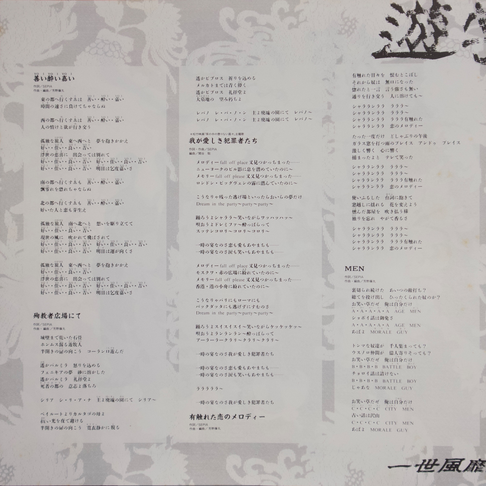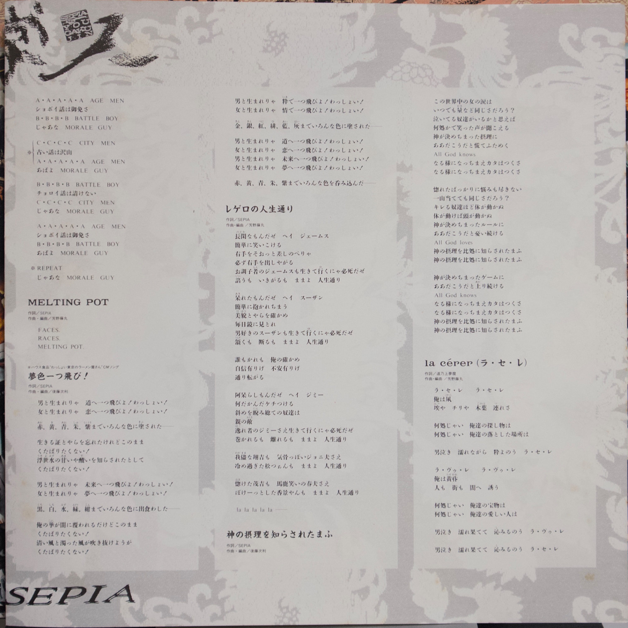 一世風靡SEPIA —《遊学人》(1987) 1980年代的日本娛樂圈出現過一種非常特殊的團體形態:他們既不是純粹歌手,也不是純粹演員,而是結合舞台表演、戲劇、電視、音樂與舞蹈的跨界表演團體。一世風靡SEPIA正是在這樣的背景下誕生的團體,而《遊学人》正是他們音樂活動中極具代表性的專輯之一。專輯發行於1987年11月28日,由ALFA MOON旗下的MOON RECORDS發行,正值日本泡沫經濟時代前夜,都市文化、夜生活、男性生活風格與都會感音樂大量興起,這張專輯正是那個時代氣氛的縮影。 一世風靡SEPIA原本來自舞台團體「劇男一世風靡」,團員多活躍於舞台劇與電視劇,其中包括後來成為著名演員的哀川翔、柳葉敏郎等人。與一般偶像團體不同,他們的音樂作品帶有強烈戲劇性與男性群像風格,歌曲內容常圍繞男人、城市、命運、人生、罪與愛等主題。《遊学人》這張專輯在音樂製作上由吉他手兼製作人芳野藤丸擔任核心人物,並有後藤次利、關谷聰等知名音樂人參與編曲與演奏,使整體音樂風格融合都會流行、放克、舞曲、歌謠與戲劇配樂感,形成一種非常具有舞台感與敘事性的音樂風格。 專輯名稱《遊学人》本身帶有「在世界與人生中漂泊、學習、行走的人」之意,這個概念也貫穿整張專輯的歌詞與氣氛。從〈MEN〉、〈我が愛しき犯罪者たち〉到〈レゲロの人生通り〉等歌曲,都呈現出一種帶有浪人、都市流浪者與男性群像戲劇感的敘事氛圍。專輯不只是流行音樂作品,更像是一齣以音樂構成的舞台劇或電影原聲帶,這也是一世風靡SEPIA作品與一般流行樂最大的不同之處。 【專輯曲序】 1.〈善い酔い嘉い〉 詞:SEPIA/曲:芳野藤丸 編曲:芳野藤丸 2.〈殉教者広場にて〉 詞:SEPIA/曲:芳野藤丸 編曲:芳野藤丸 3.〈我が愛しき犯罪者たち〉 詞:SEPIA/曲:SEPIA 編曲:関谷聡 4.〈有触れた恋のメロディー〉 詞:SEPIA/曲:芳野藤丸 編曲:芳野藤丸 5.〈MEN〉 詞:SEPIA/曲:芳野藤丸 編曲:芳野藤丸 6.〈MELTING POT〉 詞:SEPIA/曲:芳野藤丸 編曲:芳野藤丸 7.〈夢色一つ飛び!〉 詞:SEPIA/曲:後藤次利 編曲:後藤次利 8.〈レゲロの人生通り〉 詞:SEPIA/曲:芳野藤丸 編曲:芳野藤丸 9.〈神の摂理を知らされたまふ〉 詞:SEPIA/曲:後藤次利 編曲:後藤次利 10.〈la cérep(ラ・セ・レ)〉 詞:道乃上夢麿/曲:芳野藤丸 編曲:芳野藤丸 【專輯團隊】 製作人:遠藤音、SEPIA Executive Producer:小杉理宇造 Disk Mastering Engineer:谷口英二 Remix:矢野慎一 設計:POLARIS Inc. 攝影:PROJECT TEAM “Sigi” 【重新認識《遊学人》】 《遊学人》之所以值得重新聆聽,不只是因為它屬於80年代日本流行音樂的一個時代產物,而是因為它呈現了一種現在已經很少見的「團體敘事型專輯」。整張專輯不像一般流行專輯以情歌或單曲為核心,而更像是一個關於男人、城市與人生的群像故事。歌曲之間的氣氛與主題相互連結,使整張專輯聽起來像一部音樂電影。 在聲音與編曲上,專輯帶有非常濃厚的80年代日本都會音樂風格,結合放克節奏、銅管編曲、合成器音色與戲劇式和聲,既有城市夜晚的華麗感,也有舞台劇般的戲劇張力。芳野藤丸的製作讓音樂帶有SHOGUN與AOR風格的影子,同時又加入戲劇與群唱元素,使一世風靡SEPIA的音樂具有強烈的男性群像與戲劇舞台氣氛。 如果要從幾首歌開始進入這張專輯,可以從〈夢色一つ飛び!〉開始,這首歌旋律明確,是專輯中較接近流行單曲形式的作品;〈MEN〉則展現了團體的男性群像與舞台感;〈我が愛しき犯罪者たち〉與〈レゲロの人生通り〉則帶有強烈敘事與戲劇氣氛,是專輯世界觀的核心歌曲。透過這幾首歌,可以很快理解整張專輯的氣氛與概念。 整張專輯的情緒並不單純是歡樂或悲傷,而是一種帶有浪人、城市漂泊者與舞台人物的戲劇情緒。這張專輯很適合在夜晚、開車、閱讀或一個人聽完整張專輯時播放,它不是單曲型作品,而是需要從頭聽到尾才能感受到完整世界觀的專輯。 從歷史位置來看,《遊学人》代表了1980年代日本娛樂產業中「舞台團體音樂化」的一個重要例子。一世風靡SEPIA並不是傳統意義上的樂團或偶像,而是一個跨界表演團體,而這張專輯正好記錄了那個年代舞台、戲劇、音樂與電視文化交錯的時代風景。 一世風靡SEPIA本身來自舞台團體「劇男一世風靡」,成員包括哀川翔、柳葉敏郎等人,許多人後來成為知名演員。團體活動時間主要在1980年代中期至末期,他們的作品融合舞台劇、音樂、舞蹈與影像,是當時日本非常具有代表性的跨界男性表演團體之一。《遊学人》不只是他們的一張專輯,更像是一個時代、一群男人與一段日本娛樂文化歷史的紀錄。