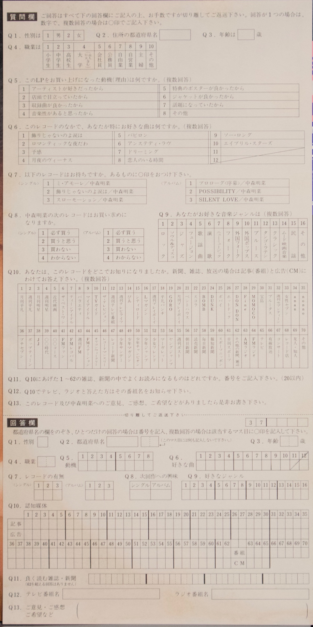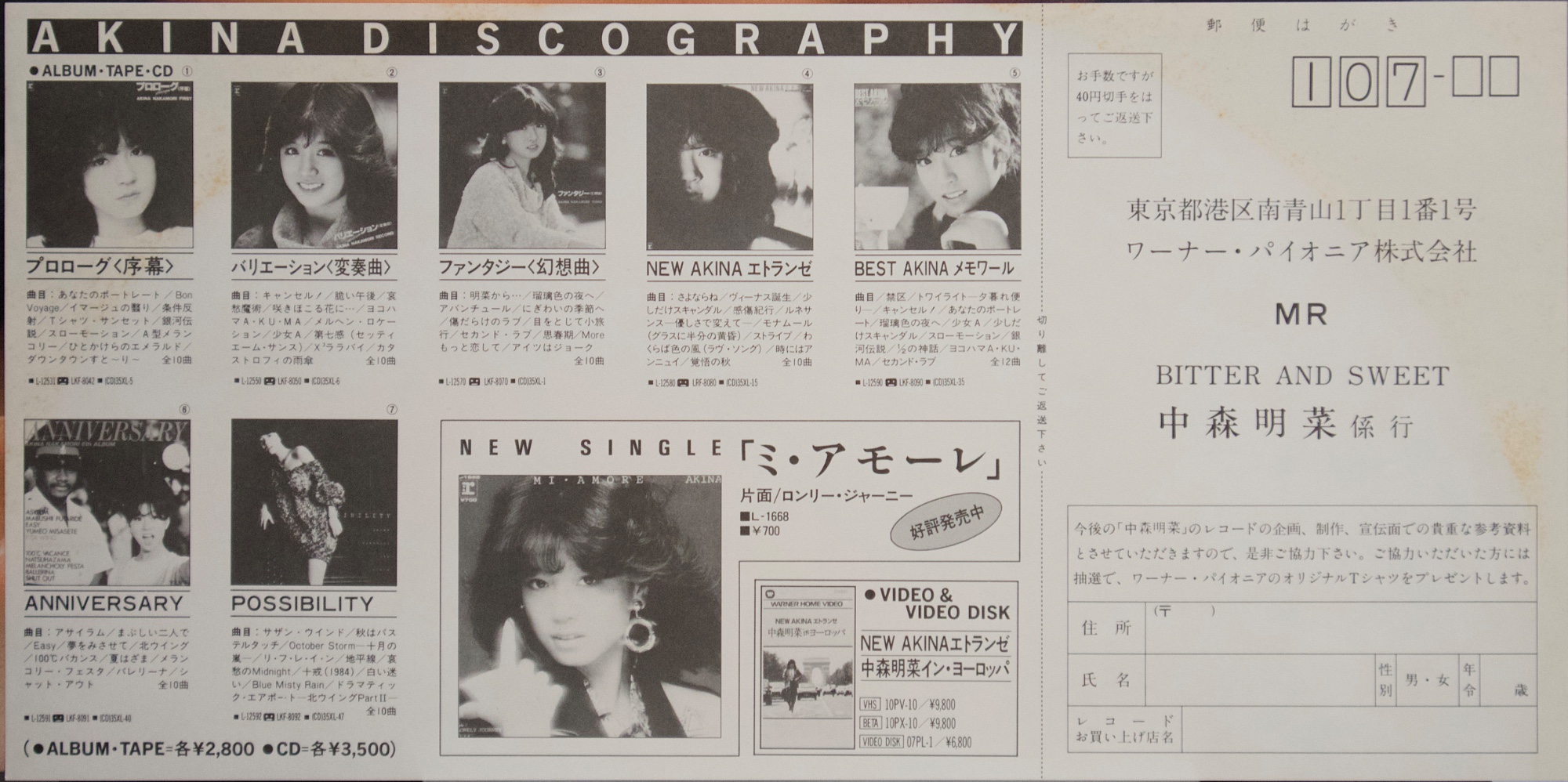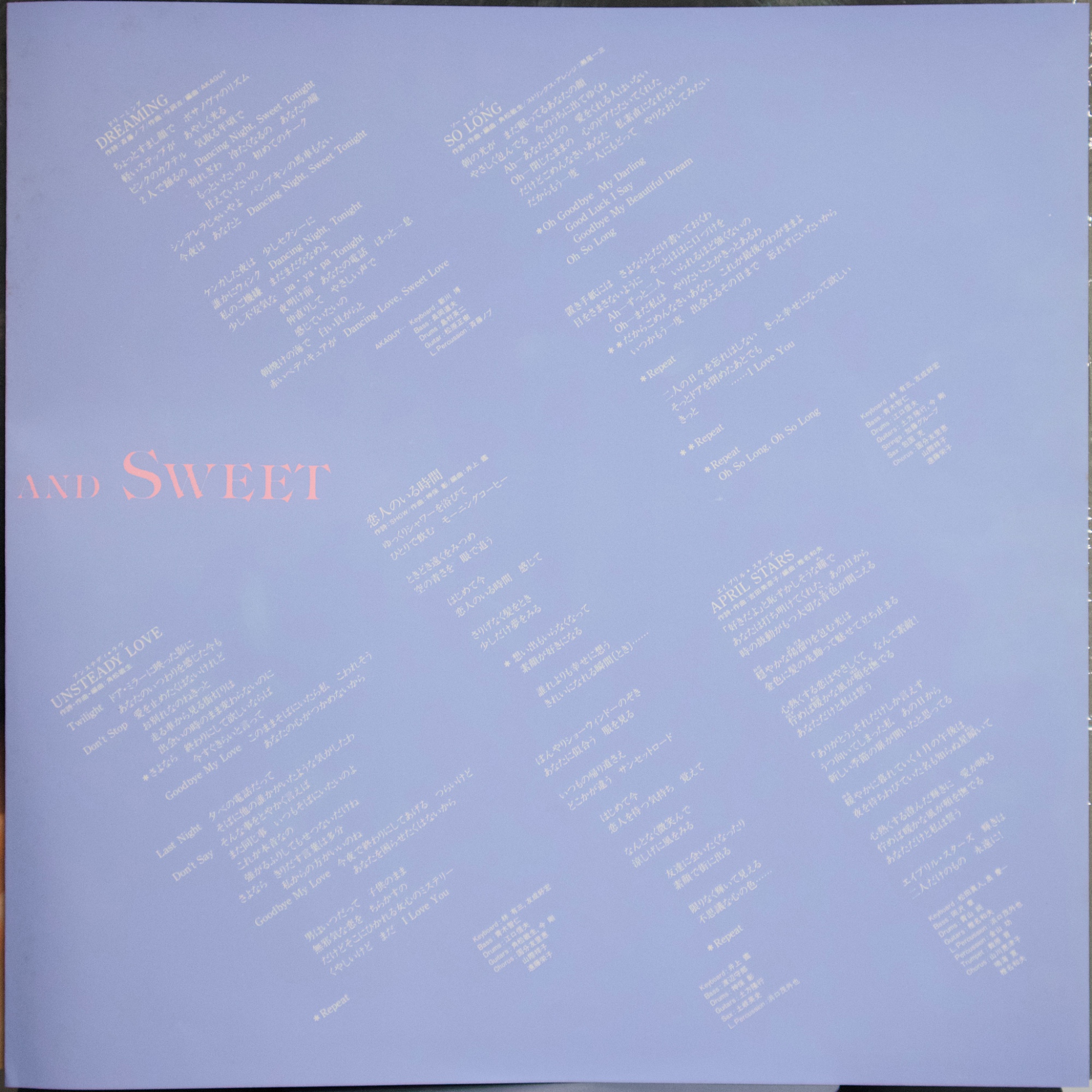 中森明菜《BITTER AND SWEET》(1985) 1985年發行的《BITTER AND SWEET》,是中森明菜在1980年代中期逐步完成音樂轉型的重要專輯之一。從早期偏向偶像歌謠的作品,到《ANNIVERSARY》、《POSSIBILITY》等逐漸成熟的流行專輯之後,中森明菜在這張專輯中確立了更具都會氣息、夜晚情緒與成熟女性形象的音樂方向。1980年代中期正是日本流行音樂高度成熟的時期,City Pop、AOR、Fusion 與 Singer-Songwriter 等不同音樂風格與錄音室製作體系交會發展,許多一線作曲家、編曲家與錄音室樂手共同參與流行專輯製作。《BITTER AND SWEET》正是在這樣的音樂環境下完成的一張專輯,不僅收錄〈飾りじゃないのよ涙は〉、〈予感〉等代表作品,也展現出中森明菜由偶像歌手轉變為專輯型歌手的過程。若放在她整體專輯脈絡中來看,這張作品位於早期偶像形象與後期更具戲劇性與藝術性作品之間,是一張具有承先啟後意義的重要專輯。 【專輯曲序】 1.〈飾りじゃないのよ涙は〉 詞:井上陽水/曲:井上陽水 編曲:萩田光雄 2.〈ロマンティックな夜だわ〉 詞:EPO/曲:EPO 編曲:清水信之 3.〈予感〉 詞:飛鳥涼/曲:飛鳥涼 編曲:椎名和夫 4.〈月夜のヴィーナス〉 詞:松井五郎/曲:松岡直也 編曲:松岡直也 5.〈BABYLON〉 詞:SANDII/曲:久保田利伸 編曲:井上鑑 6.〈UNSTEADY LOVE〉 詞:角松敏生/曲:角松敏生 編曲:角松敏生 7.〈DREAMING〉 詞:斉藤ノブ/曲:与崎古作 編曲:AKAGUY 8.〈恋人のいる時間〉 詞:SHOW/曲:神保彰 編曲:井上鑑 9.〈SO LONG〉 詞:角松敏生/曲:角松敏生 編曲:瀬尾一三 10.〈APRIL STARS〉 詞:吉田美奈子/曲:椎名和夫 編曲:椎名和夫 【專輯團隊】 主要編曲: 萩田光雄 清水信之 椎名和夫 松岡直也 井上鑑 角松敏生 瀬尾一三 AKAGUY 錄音室演奏(Session Musicians): Drums/Bass/Guitar/Keyboards/Synthesizer/Strings/Percussion/Chorus 等錄音室樂手參與各曲錄音 演唱:中森明菜 【重新認識《BITTER AND SWEET》】 《BITTER AND SWEET》之所以值得重聽,不只是因為收錄了幾首知名歌曲,而是在於它是一張完成度很高、具有整體氣氛與專輯結構的作品。這張專輯並不是以單曲為中心的歌曲集合,而是從作曲家選擇、編曲風格到曲序安排,都可以看出是以整張專輯的聆聽體驗為前提來製作的作品。若把中森明菜1980年代的專輯放在一起看,《BITTER AND SWEET》往往被視為她進入成熟期後最具有都會氣息的一張專輯。 這張專輯最特別的地方之一,在於參與創作與編曲的音樂人組成。井上陽水、EPO、飛鳥涼、角松敏生、久保田利伸、松岡直也、井上鑑、椎名和夫、神保彰、吉田美奈子等人分別來自不同的音樂圈,包括Singer-Songwriter、City Pop、AOR、Fusion與錄音室樂手系統。這使得專輯中的每一首歌都有不同的音樂背景與風格來源,但因為都在同一個時代的錄音室製作體系下完成,整體聽感仍然維持一致。從這個角度來看,《BITTER AND SWEET》可以說是一張集合1980年代中期日本都會音樂創作圈的重要作品。 在聲音與編曲上,專輯具有非常鮮明的夜晚都市氣氛。電鋼琴、合成器、乾淨的電吉他與成熟的節奏組構成整張專輯的聲音骨架,錄音室樂手的演奏也讓音樂帶有Fusion與AOR的質感,而中森明菜偏冷、帶距離感的聲線則讓整體氣氛更加成熟而內斂。像〈BABYLON〉、〈UNSTEADY LOVE〉與〈恋人のいる時間〉可以聽到濃厚的都會流行與City Pop氣息,而〈予感〉與〈APRIL STARS〉則保留了抒情歌曲的旋律感與情緒深度,使專輯在節奏與抒情之間保持平衡。 若以黑膠LP曲序來看,這張專輯的結構更加明顯。Side 1 從〈飾りじゃないのよ涙は〉開始,建立都市與戲劇性的氣氛,之後逐漸轉入夜晚與情緒色彩較強的歌曲,最後以〈BABYLON〉收尾,形成較為外向與都市感的前半部。Side 2 則整體情緒轉為較為私密與內向,〈UNSTEADY LOVE〉、〈恋人のいる時間〉與〈SO LONG〉一路將專輯帶入更深的夜晚氛圍,最後由〈APRIL STARS〉作為收尾,使整張專輯像是一段從城市夜晚走向清晨的情緒流動。這種前後兩面的情緒配置,是黑膠時代專輯思維的重要部分,也讓《BITTER AND SWEET》作為一張專輯成立,而不只是歌曲集合。 在中森明菜的專輯歷程中,《BITTER AND SWEET》位於非常關鍵的位置。它不像早期作品仍帶有較明顯的偶像歌謠輪廓,也不像後來的《D404ME》、《CRIMSON》那樣走向更強烈的戲劇性與藝術性,而是處於音樂成熟與聲音風格確立的中心位置。這張專輯既保有流行性,也具有音樂製作上的成熟度,因此多年之後再回頭聆聽,《BITTER AND SWEET》仍然常被視為中森明菜1980年代作品中最具有都會夜色氣質的一張專輯之一。