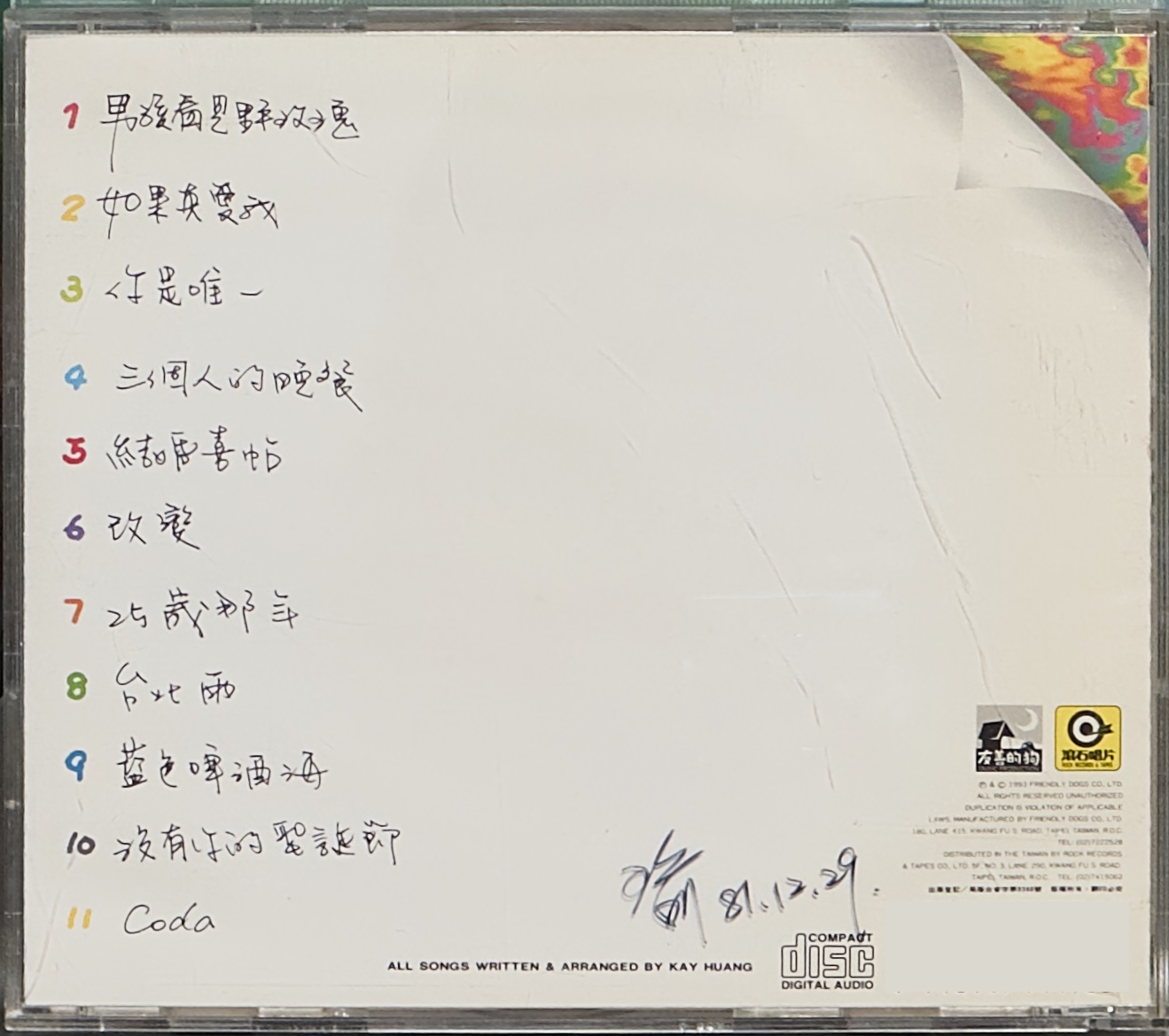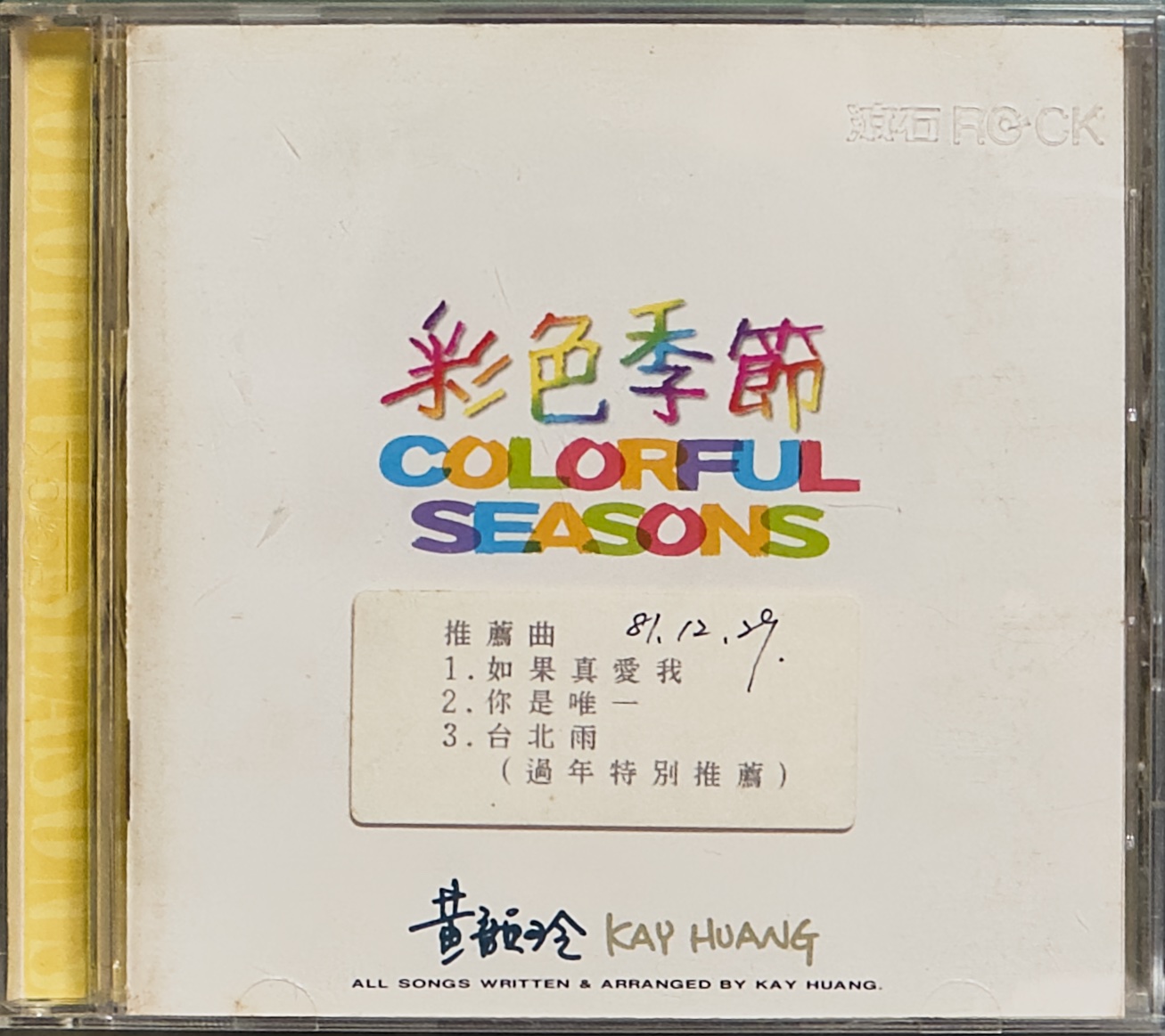 黃韻玲《彩色季節》(1993) 《彩色季節》發行於 1993 年 1 月 1 日,放在黃韻玲的創作軌跡裡看,正好位於《平凡》之後、同年稍晚《做我的朋友》之前,是一張很能說明她九十年代初期音樂方向的作品。這不是一張以歌唱為主的流行專輯,而是一張由黃韻玲主導作曲、編曲、鋼琴與鍵盤演奏的器樂專輯。封面標示「ALL SONGS WRITTEN & ARRANGED BY KAY HUANG」,內頁也進一步確認她負責作曲、編曲、鋼琴與鍵盤樂器,讓這張作品更像一次對自身旋律世界的重新整理與重新照明。 若把它放回當時的台灣流行音樂環境,《彩色季節》顯得相當特別。九十年代初的華語市場仍以歌手、主打歌與歌詞傳唱為核心,但黃韻玲選擇把創作抽離歌唱主體,轉為鋼琴與鍵盤主導的聲音敘事,既保留流行旋律的親近感,也帶出更內斂、更細緻的編曲層次。這樣的做法,既可視為她對前一階段作品的回望,也像是在更成熟的製作條件下,重新定義自己作為創作者與音樂人的位置。 從內頁製作名單來看,這張專輯不只是簡單的鋼琴錄音,而是完成度很高的製作。專輯由李琳與黃韻玲共同製作,並有 Steve Reid 參與協力製作,錄音、混音與母帶後製還延伸到洛杉磯完成,顯示它在聲音質感上有相當明確的追求。也因此,《彩色季節》的重要性不只在於它是黃韻玲少見的純演奏專輯,更在於它把她一向擅長的旋律感、都會氣質與鍵盤語言,濃縮成一張能夠獨立成立的作品。它不是大眾市場最醒目的代表作,卻是理解黃韻玲創作面貌時,很難略過的一張專輯。 【專輯曲序】 1.〈男孩看見野玫瑰〉 2.〈如果真愛我〉 3.〈你是唯一〉 4.〈三個人的晚餐〉 5.〈結婚喜帖〉 6.〈改變〉 7.〈25歲那年〉 8.〈台北雨〉 9.〈藍色啤酒海〉 10.〈沒有你的聖誕節〉 11.〈Coda〉 【專輯團隊】 出品:友善的狗有限公司 製作:友善的狗 製作人:李琳、黃韻玲 協力製作:Steve Reid(Lovin’ It Productions) 助理製作:Mooz Lee 作曲/編曲/鋼琴/鍵盤樂器:黃韻玲 錄音:王基光、王幼華、樊乃綱 錄音室:麗風錄音室(台北) 錄音日期:1992.11.4–1992.11.13 錄音:Steve Reid、Brian Springer 錄音室:Slamm Shack Studio(L.A.) 錄音日期:1992.11.18–1992.11.24 混音:Steve Reid、友善的狗 混音室:Slamm Shack Studio(L.A.) 混音日期:1992.11.27–1992.12.6 母帶後製:Chris Bellman 母帶後製錄音室:Bernie Grundman Mastering(L.A.) 攝影:A+B²(曹啟明、陳金藤、曹啟暉) 設計單位:Vivatt Design Group 平面設計:Punko 企劃宣傳:友善的狗有限公司 發行:滾石有聲出版社有限公司 發行日期:1993.1.1 【重新認識《彩色季節》】 《彩色季節》值得重聽,不是因為它有最強勢的主打歌,而是因為它讓人直接聽見黃韻玲作為創作者的核心。當歌聲被抽掉之後,留下來的就是旋律本身、和聲行進、節奏留白,以及她如何用鋼琴與鍵盤去安排情緒起伏。對熟悉她歌曲的人來說,這張專輯像是把原本已經認識的作品拆開,再用另一種更安靜、更純粹的方式重新說一次;對不熟悉她的人來說,它反而是一個很好的入口,因為你可以先不被歌詞帶走,而是先感受她的旋律到底怎麼成立。 這張專輯最迷人的地方,在於它不是炫技型的演奏唱片。黃韻玲的鋼琴與鍵盤處理,重點不在表面上的密度,而在於她如何讓旋律自然浮現,如何把流行音樂裡本來偏直接的情感,轉成比較有空氣感、有城市夜色感的聲音。整張聽下來,既有都會抒情的輪廓,也有一種九十年代初台灣流行音樂少見的精緻感。從製作名單看得出來,這張專輯在錄音、混音、母帶上都不是草率完成,因此它的器樂層次並不扁平,而是帶著很完整的聲音設計。 若要挑幾首作為進入點,〈三個人的晚餐〉很適合拿來理解這張專輯的再詮釋能力。它不是只把熟悉的旋律照本宣科彈一遍,而是透過器樂化之後的節奏與音色安排,把原本帶有故事感的歌曲,轉成更像回憶流動的畫面。〈台北雨〉則很能代表黃韻玲處理城市情緒的能力,旋律裡有冷色調,也有一點不張揚的感傷。〈藍色啤酒海〉聽來帶著她早期作品裡很鮮明的個人氣味,但在演奏版本裡,又多了一層回望過去的成熟感。至於放在最後的〈Coda〉,則像是刻意留下的一個收束,讓整張專輯不是停在一首歌,而是停在一種氣氛。 《彩色季節》很適合在夜裡、通勤後、或者需要一點安靜陪伴的時候聽。它不是要立刻抓住你,而是會在反覆聆聽裡慢慢顯出它的細節。對喜歡九十年代台灣流行音樂的人,它提供了一個不同角度,去理解當時除了歌手與排行榜之外,還有一批創作者在認真思考聲音本身的可能。對喜歡鋼琴、鍵盤、器樂流行作品的人來說,它也不是背景音樂式的輕巧消費,而是一張有明確個性與審美的作品。 若要說它在黃韻玲生涯中的位置,《彩色季節》像是一個轉身的瞬間。它既回收了她此前創作裡重要的旋律資產,也提前預告了她不會只停留在一般流行女歌手的位置。黃韻玲一直是華語流行音樂裡少數同時具備創作、編曲、製作與演奏能力的人,而這張專輯正好把這些能力集中展現出來。也因此,當我們回頭看九十年代初的她,《彩色季節》不只是旁支作品,而是理解黃韻玲音樂觀的一把很重要的鑰匙。