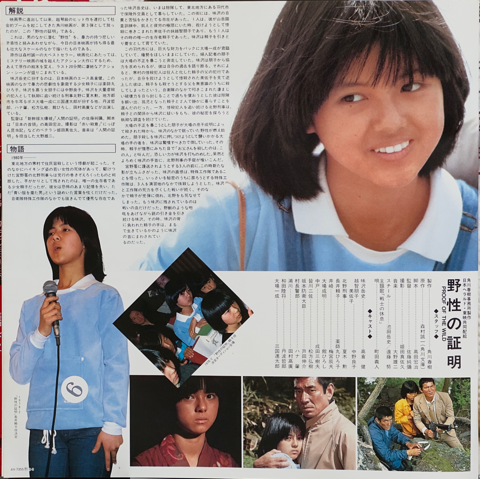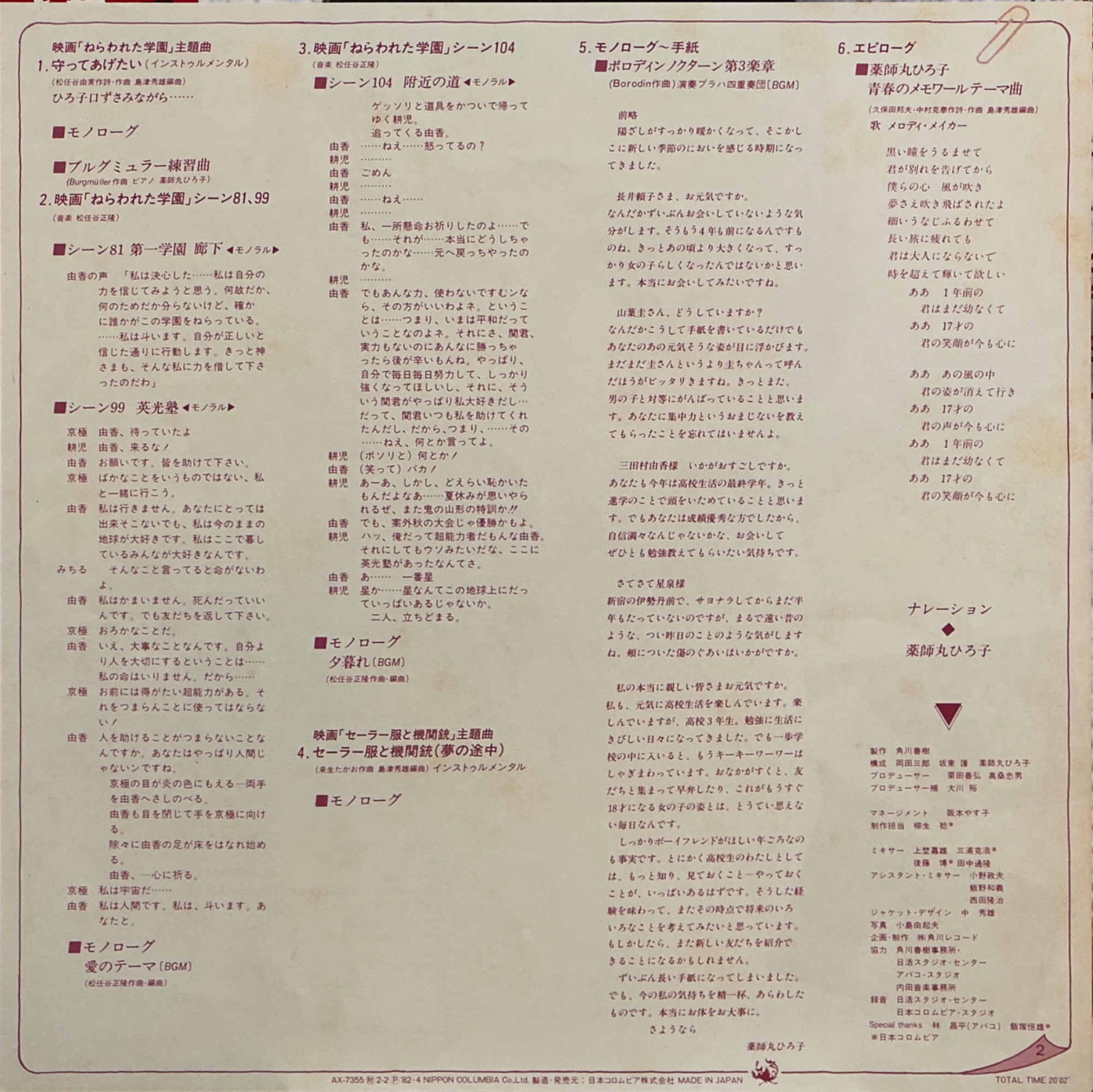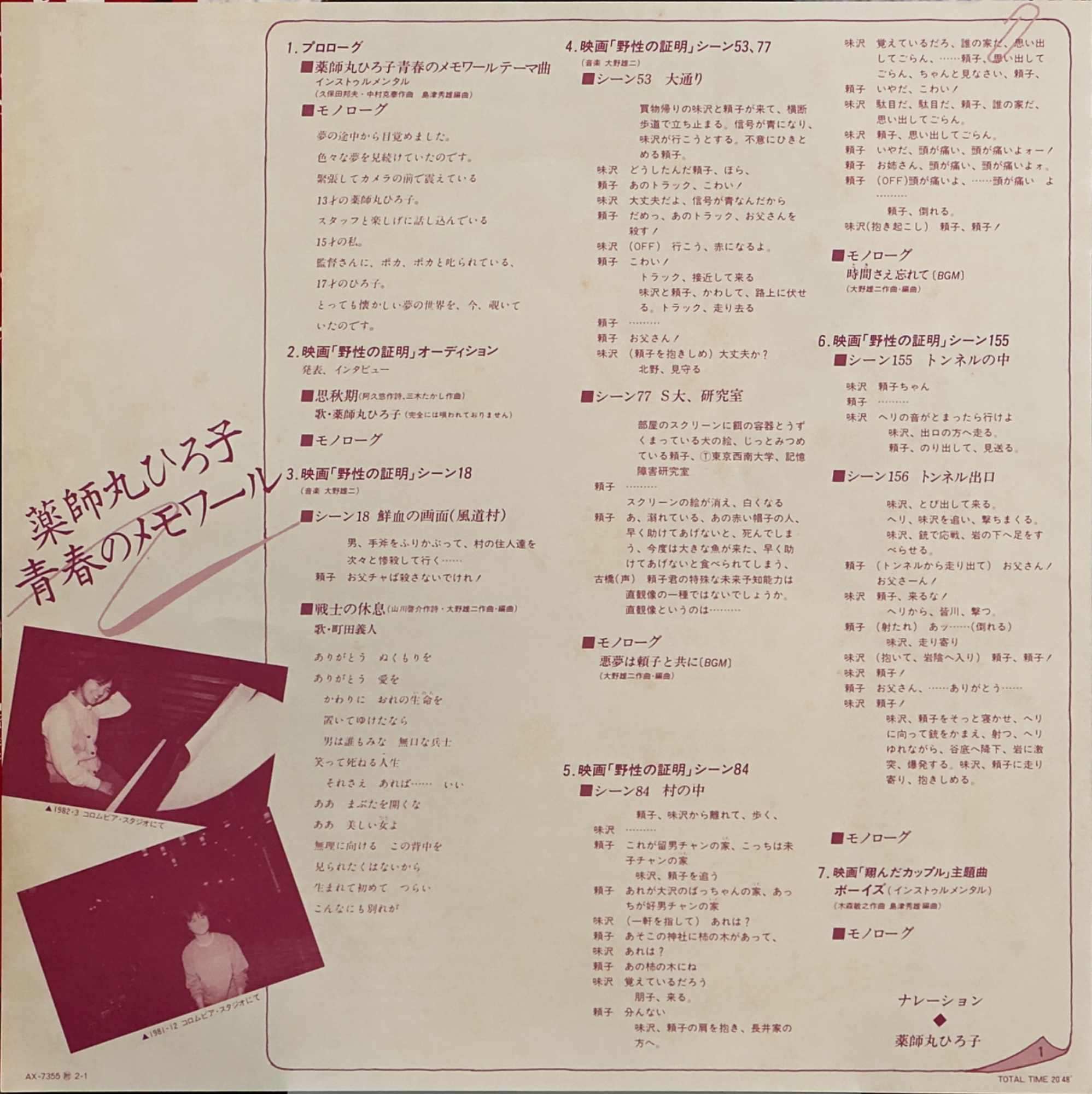 薬師丸ひろ子《青春のメモワール》(1982) 《青春のメモワール》發行於 1982 年 4 月 21 日,正好位在藥師丸ひろ子以電影明星身分迅速走紅的關鍵時期。當時的她仍是 17 歲,卻已經因《野性の証明》《翔んだカップル》《ねらわれた学園》《セーラー服と機関銃》接連建立起鮮明的銀幕形象。也因此,這張作品從一開始就不是一般意義上的新歌專輯,而是一張以她早期電影歷程為主軸整理而成的企劃盤。唱片將電影場景、旁白、背景音樂與主題曲器樂版重新編排,做成一張可以反覆播放的聲音紀錄冊,也讓封面 obi 上的「17歳現在完了」有了非常具體的內容。 要理解這張專輯,先認識它選入的幾部電影很重要。《野性の証明》是藥師丸ひろ子最早被大眾廣泛看見的重要作品,帶有強烈的懸疑與沉重氣氛,也讓她以少女角色的姿態進入角川電影體系。《翔んだカップル》則把她帶進青春片的語境,讓觀眾看見她更貼近日常、更自然的銀幕魅力。《ねらわれた学園》把校園、超能力與青春偶像形象結合起來,進一步強化了她在 1980 年代初日本流行文化中的獨特位置。到了《セーラー服と機関銃》,女高中生與幫派世界相撞的反差設定,則幾乎把她推上時代代表人物的位置。把這四部片連起來看,就會明白《青春のメモワール》不是隨意拼貼,而是在整理她從電影少女走向全民級明星的早期軌跡。 這張唱片的重要性,也正在於它保存的不是單一電影的餘韻,而是藥師丸ひろ子在某個特定時刻的整體魅力。它既不是純原聲帶,也不是純歌曲專輯,而是電影、偶像、旁白與記憶共同構成的混合作品。1982 年 5 月,這張作品登上 Oricon 週間 LP 榜首位,也說明當時的聽眾購買它,不只是為了聽歌,更是為了收藏那個時代的電影記憶、明星聲音與青春想像。從今天回看,《青春のメモワール》不一定是最適合拿來認識她歌手面貌的第一張作品,卻是理解她為什麼能成為 1980 年代初日本青春文化象徵的一把重要鑰匙。 【專輯曲序】 SIDE 1 1.〈プロローグ〉 2.〈映画「野性の証明」オーディション〉 3.〈映画「野性の証明」シーン18〉 4.〈映画「野性の証明」シーン53、77〉 5.〈映画「野性の証明」シーン84〉 6.〈映画「野性の証明」シーン155〉 7.〈ボーイズ〉 作曲:木森敏之 編曲:島津秀雄 映画《翔んだカップル》主題曲 (本專輯收錄為器樂版) SIDE 2 1.〈守ってあげたい〉 作詞:松任谷由実/作曲:松任谷由実 編曲:松任谷正隆 映画《ねらわれた学園》主題曲 (本專輯收錄為器樂版) 2.〈映画「ねらわれた学園」シーン81、99〉 3.〈映画「ねらわれた学園」シーン104〉 4.〈セーラー服と機関銃(夢の途中)〉 作詞:来生えつこ/作曲:来生たかお 編曲:星勝 映画《セーラー服と機関銃》主題曲 (本專輯收錄為器樂版) 5.〈モノローグ―手紙〉 6.〈エピローグ〉 歌:メロディ・メーカー 【專輯團隊】 ナレーション:薬師丸ひろ子 製作:角川春樹 構成:岡田晋吉/坂東直/薬師丸ひろ子 プロデューサー:岡田晋吉/高桑忠男 プロデューサー補:大川裕 マネージメント:黒木マリ子 制作担当:鵜島稔 ミキサー:上芝基晴/三浦克洋 アシスタント・ミキサー:小野秋夫/飯塚和昭/田口裕治 ジャケット・デザイン:今野昭 写真:小島由起夫 企画・制作:小学館ハローレコード 協力:角川春樹事務所/日本コロムビア/日活スタジオ・センター/アバコ・スタジオ 録音:岡田晋吉事務所/日活スタジオ・センター/日本コロムビア・スタジオ 【重新認識《青春のメモワール》】 這張專輯值得重聽,不是因為它提供了多少完整歌唱版名曲,而是因為它把藥師丸ひろ子最早期、最不可替代的電影青春形象完整封存了下來。後來人們談她,常會從更成熟的歌手作品、較完整的錄音室專輯,甚至她往後的演員生涯開始回顧;但《青春のメモワール》記錄的,是她還在十七歲、聲音與銀幕形象仍緊密重疊的那個瞬間。這種狀態非常短暫,也因此格外珍貴。 從聲音構成來看,這張唱片的重點不是單首作品的獨立完成度,而是整體的敘事氛圍。場景片段、旁白、BGM 與主題曲器樂版彼此交錯,使聽者聽見的不是單純旋律,而是一整套與藥師丸ひろ子相關的電影記憶。像〈ボーイズ〉、〈守ってあげたい〉、〈セーラー服と機関銃(夢の途中)〉在這裡都不是作為完整流行單曲被端出,而是作為記憶觸發點,嵌進整張唱片的情緒流動裡。這種做法讓《青春のメモワール》更接近一部用聲音剪接而成的青春回顧片,而不是一般以歌曲主導的專輯。 SIDE 1 幾乎把重心都放在《野性の証明》相關素材上,這樣的安排很有象徵性。因為《野性の証明》是她被觀眾真正看見的起點,也是她從銀幕少女形象出發的根源。專輯把試鏡、場景、旁白與插入內容併置在一起,讓這一面聽起來像是在回到那段記憶的起點。到了最後接上作為《翔んだカップル》主題曲的〈ボーイズ〉,整體氣氛又從較沉重的電影世界,稍微轉向更接近青春片的明亮輪廓。 SIDE 2 的方向則更集中地指向她在 1981 年前後已經成形的明星面貌。《ねらわれた学園》代表的是校園、奇幻與青春偶像感的結合,片中的不安、神秘與少女性格,使她的形象不再只是單純清純,而帶有更鮮明的時代感。《セーラー服と機関銃》則把這種魅力推到最具代表性的階段。高中女生與幫