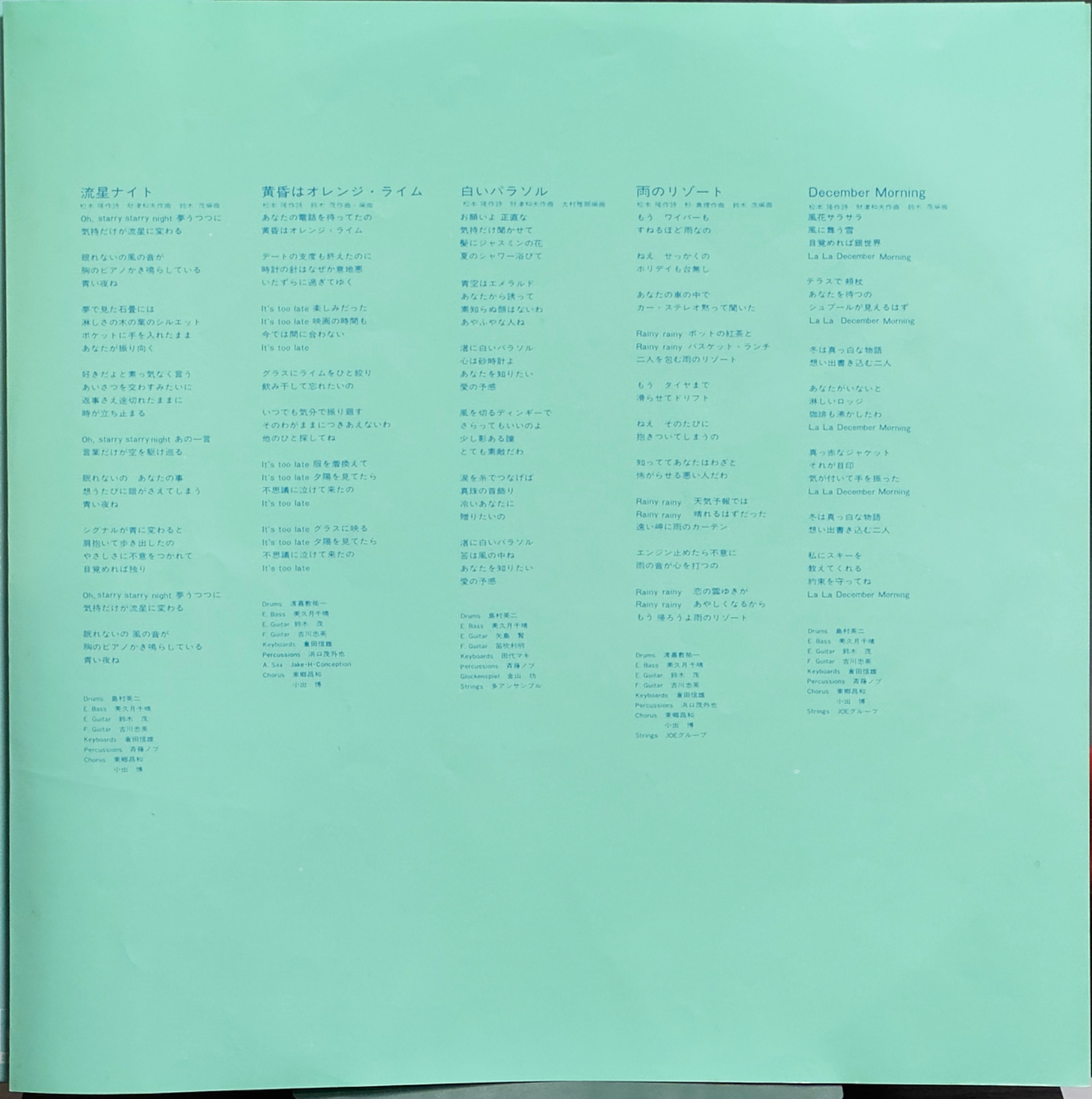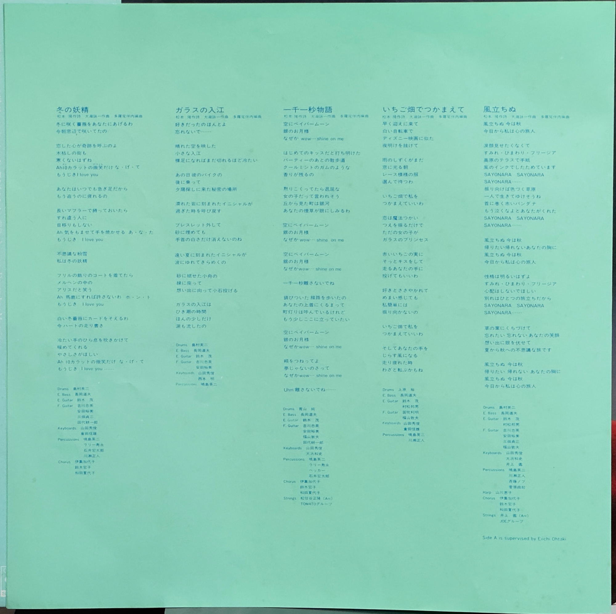 松田聖子《風立ちぬ》(1981) 《風立ちぬ》是松田聖子在 1981 年推出的第四張原創專輯,也是她早期專輯體系真正開始顯出完整輪廓的一張作品。從《SQUALL》、《North Wind》到《Silhouette》,她已經迅速建立起人氣偶像的輪廓;到了《風立ちぬ》,則進一步把單曲明星的魅力,推進成一張能以整體概念與聲音設計成立的專輯。它發行於 1981 年 10 月,處在日本流行音樂由歌謠曲、偶像流行與新時代都會感彼此交會的節點上,因此不只是一張銷售成功的作品,也是一張能看出時代審美正在變化的專輯。 這張專輯最關鍵之處,在於它把不同創作者的力量編進同一個框架裡。全專歌詞由松本隆包辦,讓作品在語氣與意象上保持高度一致;A 面五首則全部交由大瀧詠一作曲,並以多羅尾伴内名義編曲,形成極鮮明的半面統一性。這種做法讓《風立ちぬ》不只是收錄熱門單曲的偶像專輯,而是帶有明確製作構想的流行作品。相對之下,B 面由財津和夫、杉真理、鈴木茂等人接手,聲音更偏向成熟、柔和、帶有都會感的抒情與流動。A 面與 B 面之間的差異,不是割裂,而像是把松田聖子當時的形象從兩個方向同時照亮:一面是夢幻、輕盈、帶有大瀧美學的精緻流行,一面是更靠近成熟女性敘事與季節情緒的都市歌謠。 專輯同名曲〈風立ちぬ〉也正好體現了這張作品的定位。它既是當時的重要主打,也是後來回望松田聖子早期代表作時幾乎不會被略過的一首歌。松本隆的詞寫出季節轉換、戀愛將逝與青春微妙不安,大瀧詠一的旋律則讓這種感受保持在透明、優雅而不沉重的狀態裡。這正是《風立ちぬ》最迷人的地方:它並不靠強烈戲劇性取勝,而是靠細膩的空氣感、聲音層次與情緒留白,讓聽者在多年後仍能感覺到那個時代的光線、風向與都市感。 【專輯曲序】 Side A 1.〈冬の妖精〉 詞:松本隆/曲:大瀧詠一 編曲:多羅尾伴内 2.〈ガラスの入江〉 詞:松本隆/曲:大瀧詠一 編曲:多羅尾伴内 3.〈一千一秒物語〉 詞:松本隆/曲:大瀧詠一 編曲:多羅尾伴内 4.〈いちご畑でつかまえて〉 詞:松本隆/曲:大瀧詠一 編曲:多羅尾伴内 5.〈風立ちぬ〉 詞:松本隆/曲:大瀧詠一 編曲:多羅尾伴内 Side B 1.〈流星ナイト〉 詞:松本隆/曲:財津和夫 編曲:鈴木茂 2.〈黄昏はオレンジ・ライム〉 詞:松本隆/曲:鈴木茂 編曲:鈴木茂 3.〈白いパラソル〉 詞:松本隆/曲:財津和夫 編曲:大村雅朗 4.〈雨のリゾート〉 詞:松本隆/曲:杉真理 編曲:鈴木茂 5.〈December Morning〉 詞:松本隆/曲:財津和夫 編曲:鈴木茂 【專輯團隊】 製作人:M. Wakamatsu 製作人:K. Tsukino 錄音:T. Yoshida 錄音:T. Suzuki 錄音助理:A. Saida 攝影:T. Mutoh 美術設計:M. Yamada 造型:Y. Miyake Side A 監修:Eiichi Ohtaki 【重新認識《風立ちぬ》】 《風立ちぬ》值得重聽,不只是因為它收錄了名曲,而是因為它把松田聖子早期最重要的幾種魅力整理得非常完整。若只從單曲印象切入,松田聖子容易被理解為一位在 1980 年代初期迅速走紅的偶像歌手;但一旦回到《風立ちぬ》這樣的專輯,就會發現她的作品其實很早就已經具備整體聆聽的價值。這張專輯的好,不在於每一首都強調爆發力,而在於從開場到收尾,都維持住一種清澈、細緻、帶季節感的聲音氣質。 聲音上,A 面是整張專輯最鮮明的特色。大瀧詠一的旋律與多羅尾伴内名義下的編曲,讓歌曲帶有一種輕快、透明、卻又不只是甜美的精巧感。〈冬の妖精〉與〈ガラスの入江〉像是把冬日與海岸線寫成帶光澤的流行歌;〈一千一秒物語〉則因弦樂處理而更有空間感,既夢幻又帶一點距離;〈いちご畑でつかまえて〉更能聽出這張專輯並不保守,它保有偶像流行的親近性,同時也有相當講究的旋律安排。到了〈風立ちぬ〉,整張 A 面累積的空氣與情緒終於聚焦成一首真正能代表這張專輯的作品。它沒有過度煽情,卻能把青春、離別預感與季節移動唱得非常深。 B 面的吸引力在於另一種成熟感。〈流星ナイト〉、〈雨のリゾート〉與〈December Morning〉讓專輯從 A 面的統一概念,轉進更像夜色、餘溫與回望的氛圍。〈黄昏はオレンジ・ライム〉的色彩感尤其鮮明,能讓人感受到鈴木茂在旋律與編曲上帶來的柔和流動。至於〈白いパラソル〉,則是把市場辨識度與專輯整體感銜接起來的重要關鍵。它作為單曲早已足夠出色,但放進《風立ちぬ》之後,更像是一個讓聽者重新理解松田聖子聲音特質的座標點。 這張專輯很適合在傍晚、初冬、或需要一點安靜秩序感的時候聽。它不是用來製造強烈衝擊的唱片,而是適合慢慢把人帶進一個完整聲音世界的唱片。若你平常喜歡日本早期都會流行、松本隆筆下那種帶季節與場景感的歌詞,或想理解 1980 年代日本偶像專輯如何從商品走向作品,《風立ちぬ》都會是一個非常好的入口。它推薦給不只想聽名曲,而是想聽出整張專輯內部結構的人;也推薦給那些以為松田聖子只能從熱門單曲認識,卻還沒有真正進入她專輯世界的聽者。 若把它放回歷史位置來看,《風立ちぬ》之所以重要,在於它證明了松田聖子並不只是時代所選中的偶像,她也是能承接一流創作者、並把那些創作真正唱成自己世界的歌手。松本隆、大瀧詠一、財津和夫、杉真理、鈴木茂、大村雅朗等人的參與,當然讓這張專輯擁有極高的製作含金量;但若沒有松田聖子本人的聲音氣質,這些歌曲也未必能形成今天我們所認識的《風
